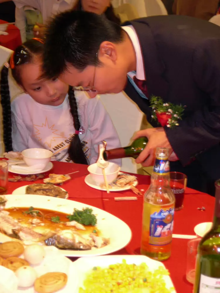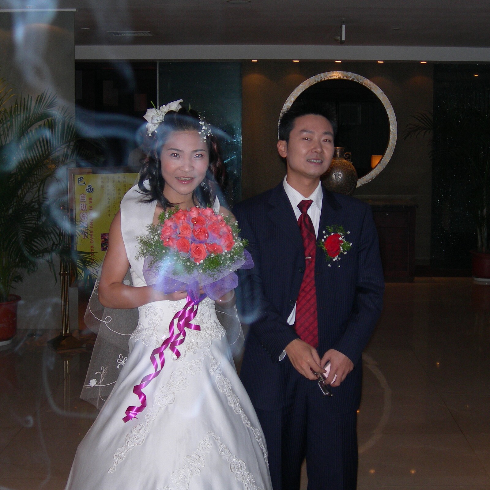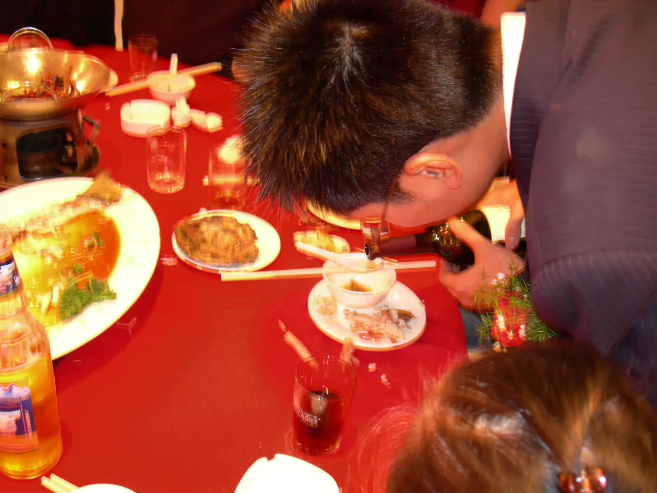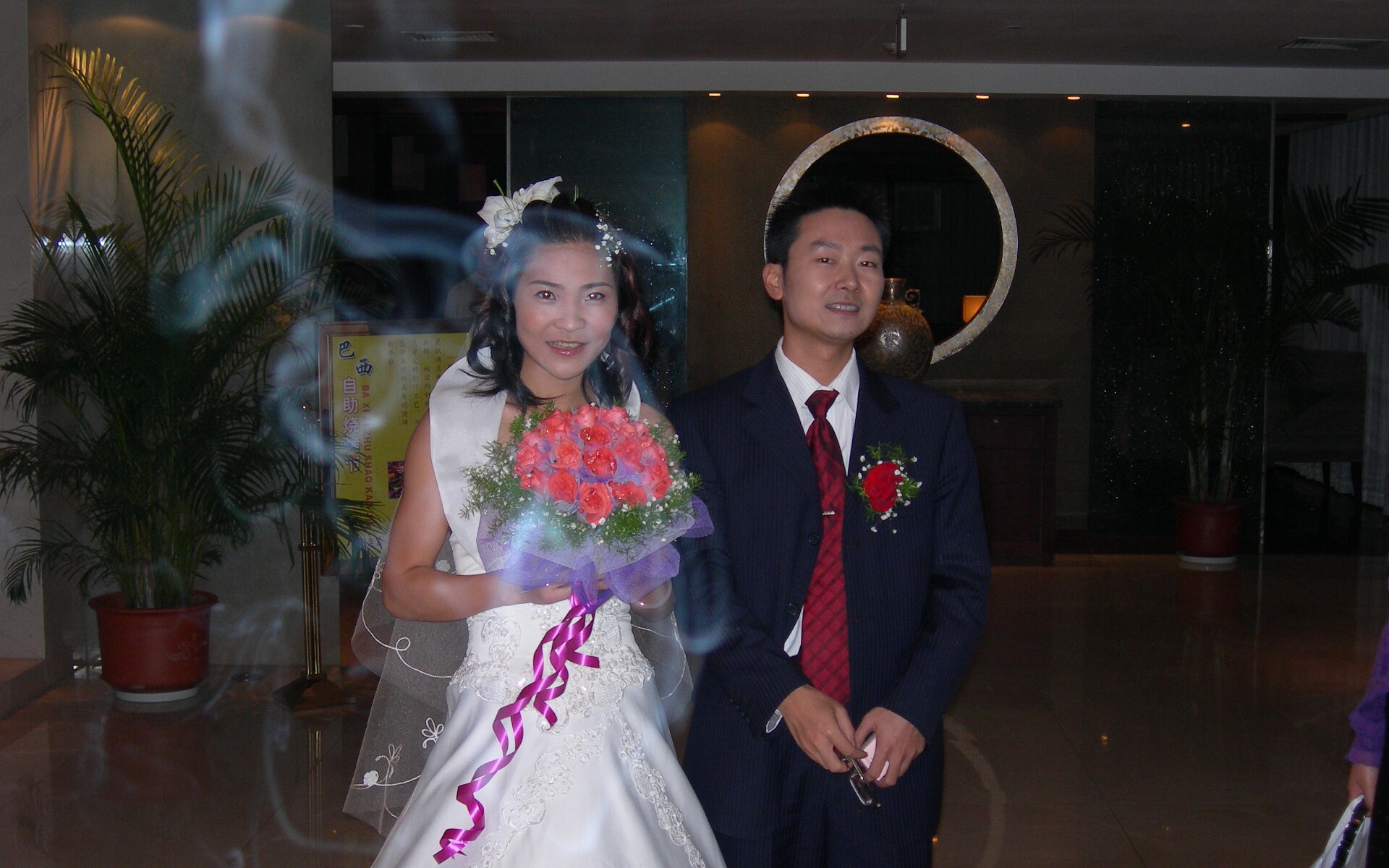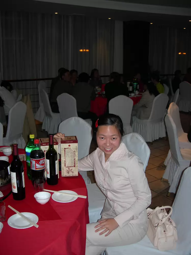 Mr and Mrs Xu arrive to the hotel where the wedding dinner will be held.Hanhan with all the beverages, the baiju is her favorite.An overview of a few tables at the dinner. Well stocked with food, drink, and smokes.Now the couple has changed clothes and are entering the dining room. On stage with the wedding announcer.Chinese couples have to perform for the guests, Rammy is a good actor.The couple bow to each other to show their respect. Pouring champagne for everyone.Rammy has to balance a spoon on a chopstick, fill it with wine, then hold the spoon in his teeth to drink.The little girl doesn't think he can do it. Putang MemorialSnow 2006