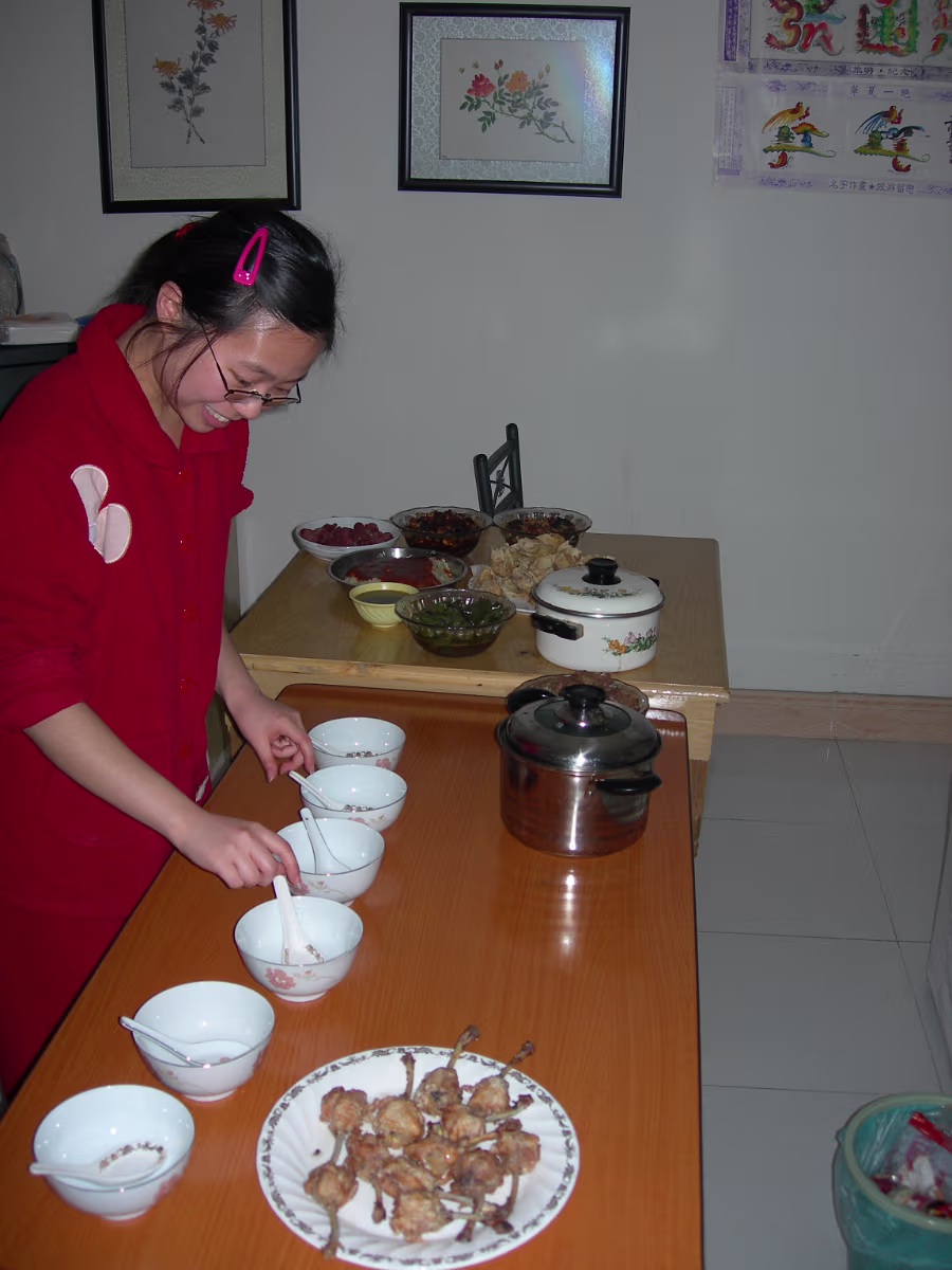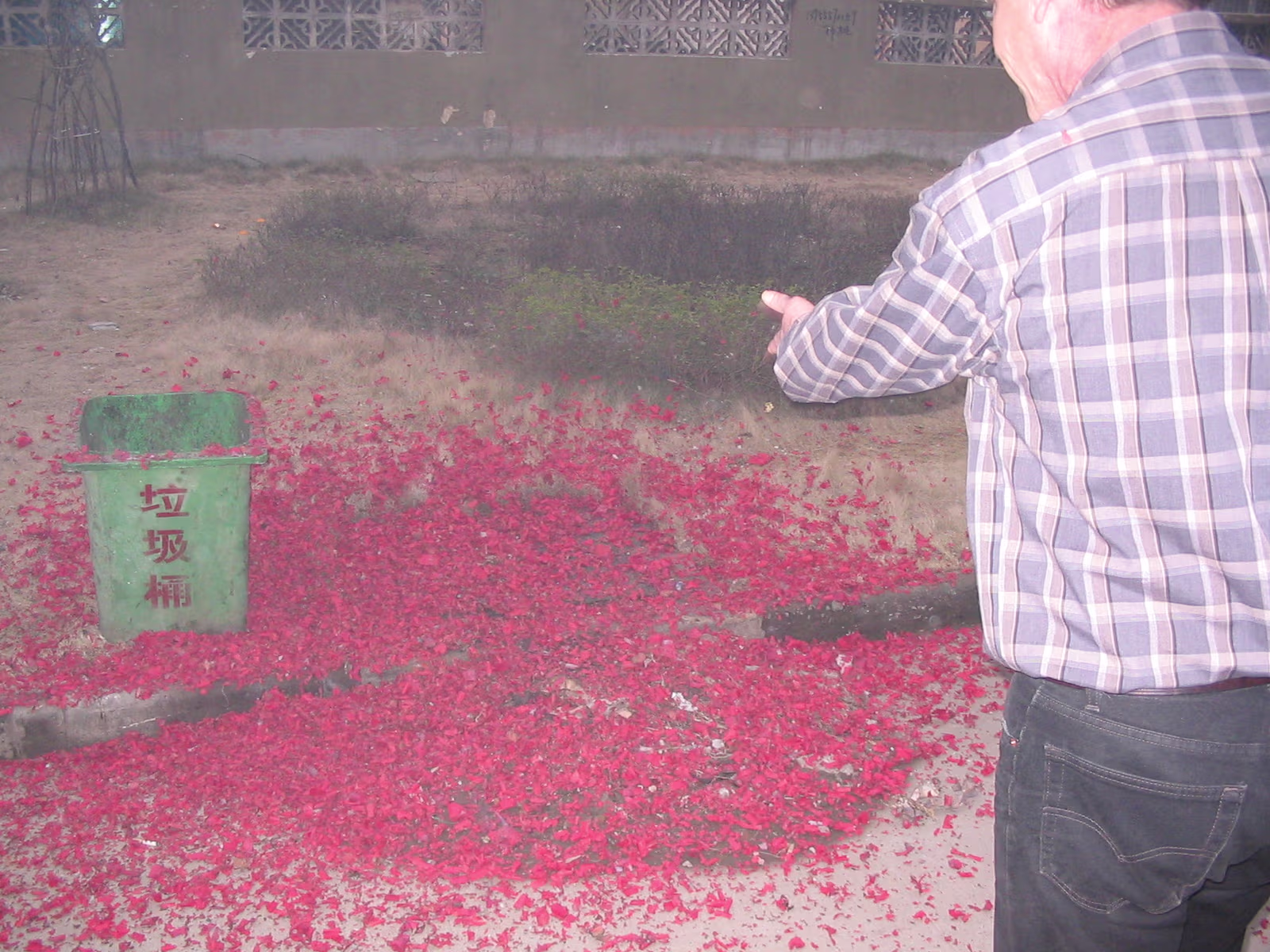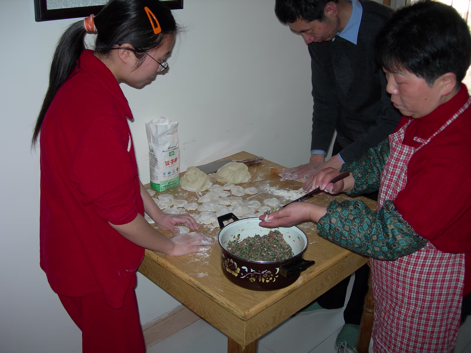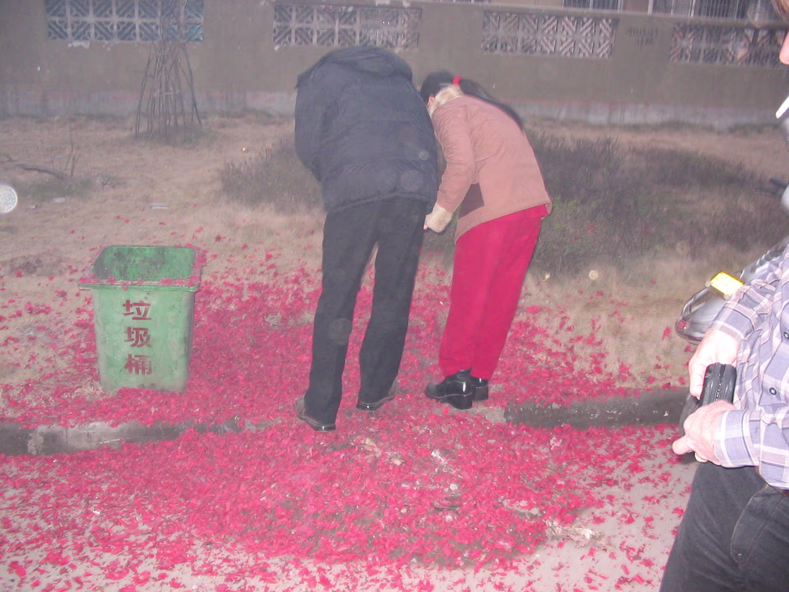 The filling for dumplings. Meat and dandelion greens. Final mixing of the filling. Families always make the dumplings together, we're no different. How to seal a dumpling and make it pretty. Dad is the rolling expert, very fast. Hanhan's first dumpling! How does it look? The dinner fireworks. There are 10,000 in this roll. The fuse is lit! 10,000 firecrackers - 3 seconds The debris is 4 stories high! Tada! Looking for duds. All clear. Setting the table for the big dinner to come. Xiaohua's dishes begin to arrive. Everybody pitches in. Mom's dishes add to the dinner. Even more food to complete the feast, there are more than 30 dishes to sample! Enjoy! Even Ben is doing his part! Yum! There is simply TOO much to eat, but we try. Labels Snow 2006Teaching Photo Albums