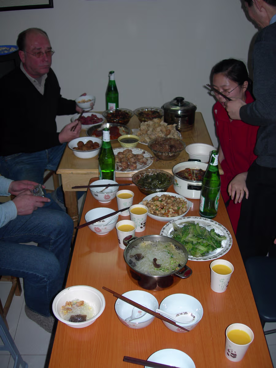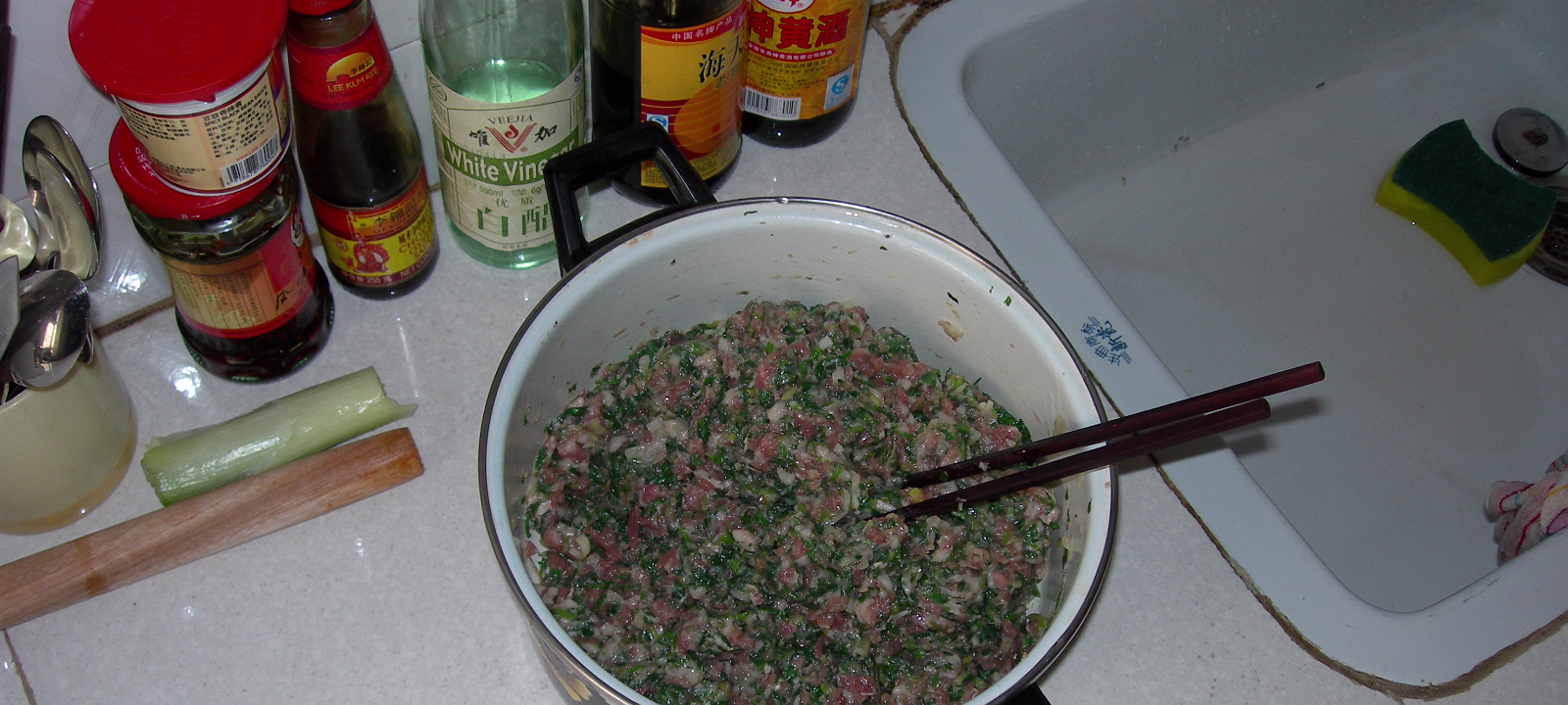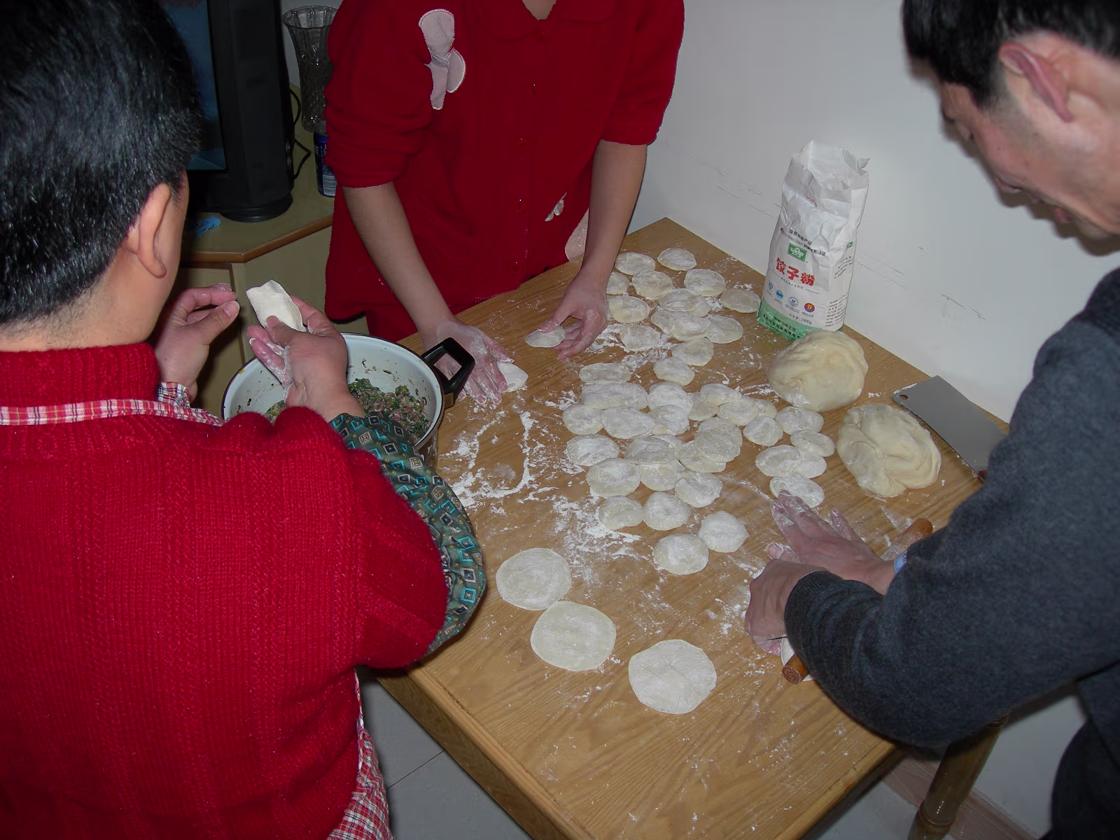 The filling for dumplings. Meat and dandelion greens. Final mixing of the filling. Families always make the dumplings together, we're no different. How to seal a dumpling and make it pretty. Dad is the rolling expert, very fast. Hanhan's first dumpling! How does it look? The dinner fireworks. There are 10,000 in this roll. The fuse is lit! 10,000 firecrackers - 3 seconds The debris is 4 stories high! Tada! Looking for duds. All clear. Setting the table for the big dinner to come. Xiaohua's dishes begin to arrive. Everybody pitches in. Mom's dishes add to the dinner. Even more food to complete the feast, there are more than 30 dishes to sample! Enjoy! Even Ben is doing his part! Yum! There is simply TOO much to eat, but we try. Labels Snow 2006Teaching Photo Albums