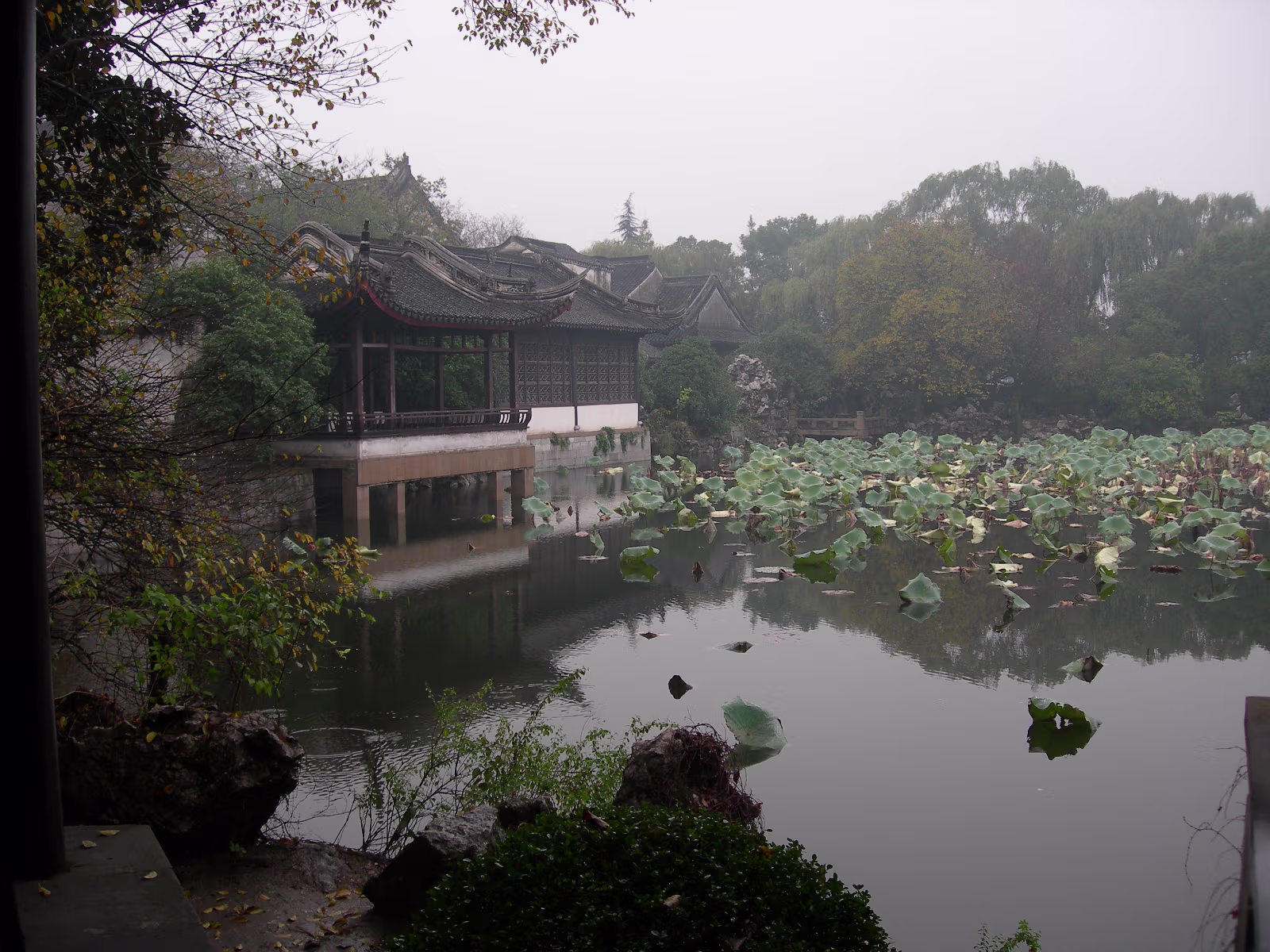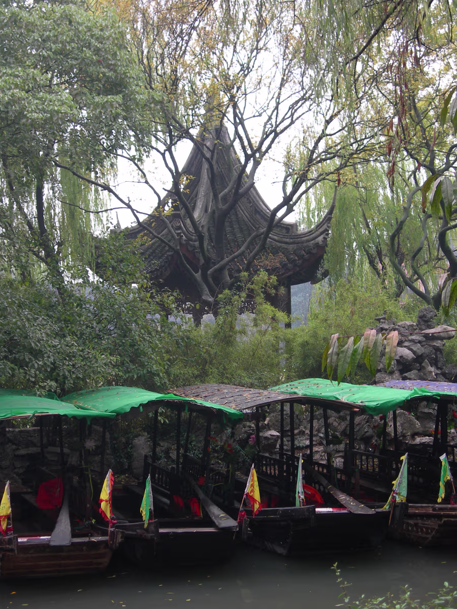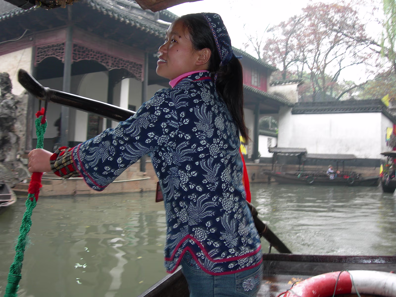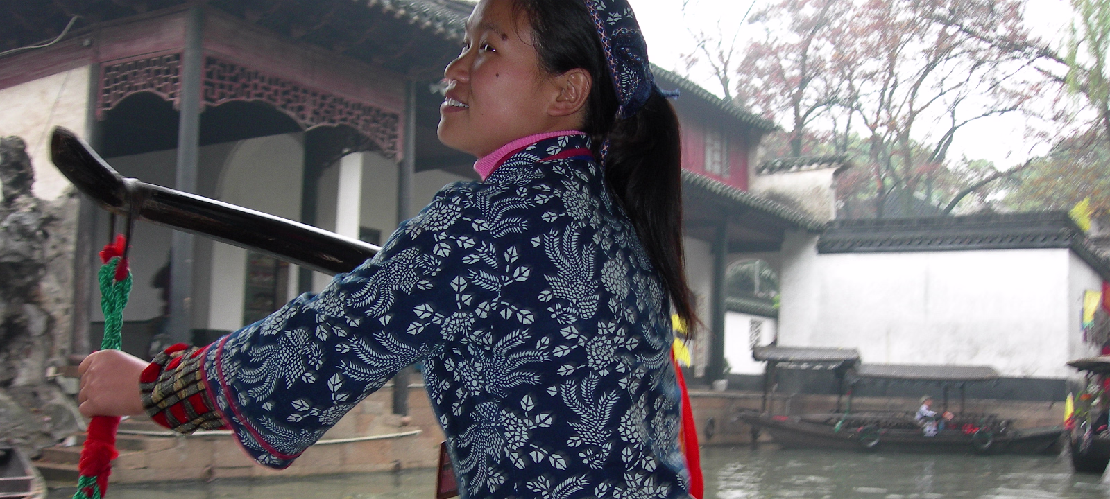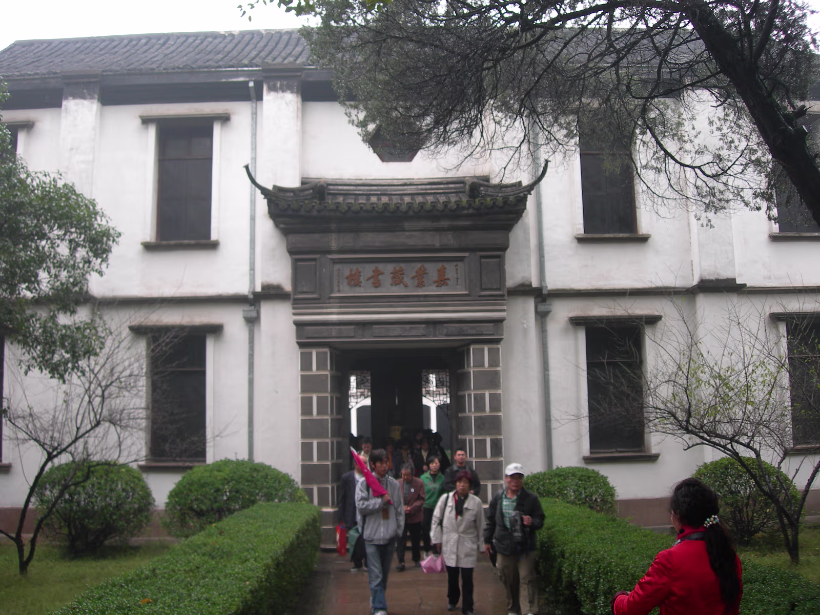 A gate presented by the Emperor to honor the Zhang Family. This gate was presented by the last Emperor, Pu Yi. The female compound of the Zhang family looks over a nice pond. The library which contains 1500 year old books. Quite rare. Hand carved wooden printing plates for one of the books in the library. Sign means that the Emperor hopes the family can be prosperous. A scene along one of the canals we toured. Lady is washing her clothes. Another view of canals in Nanxun, an ancient town in Zhejiang Province. The blue banner is an ad for the local wine. Notice that part of the buildings are built over the water. A 50 year old ad for cosmetics. Anhui style brick carvings adorn this gate. Where guests were greeted. The characters show that the family is cultured. The lions on the chairs show that the mother was the most respected member of the family. A carved panel that tells part of the story of how girls were introduced to their husbands. The matchmaker has signaled a man that the coast is clear to come into the girl's room. The exterior of the family's French style ballroom. All imported from France. A Pagoda behind the canal tour boats. Our boat girl. She is using a 'Nu' that both steers and propels the boat. Just the locals watching tourists float past. Labels Beijing 2002Qingdao 2002