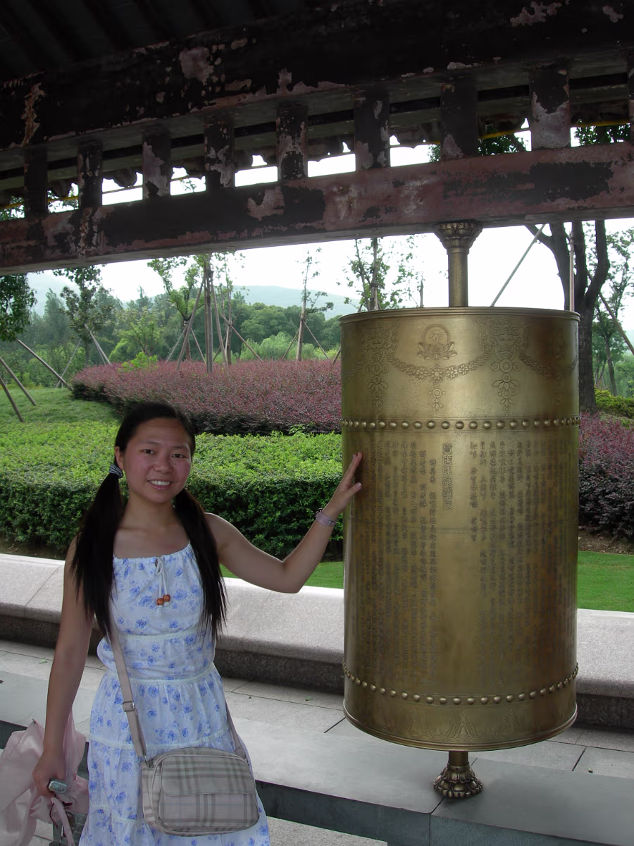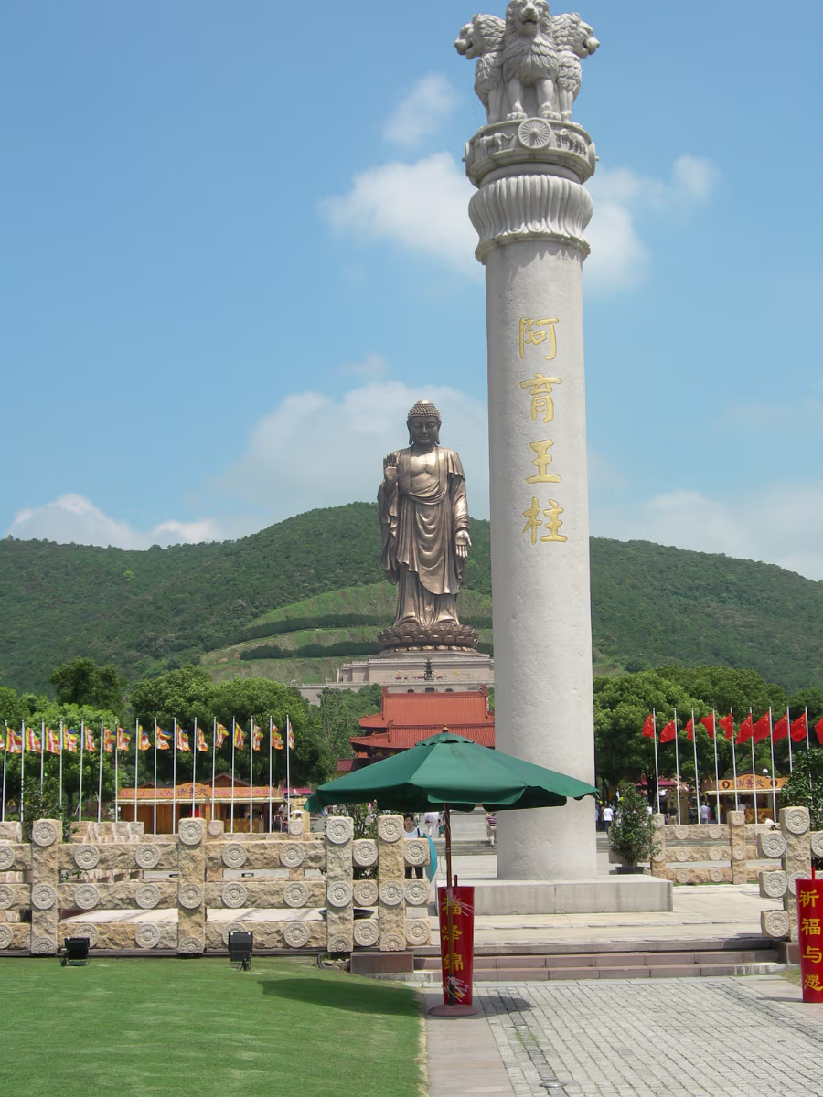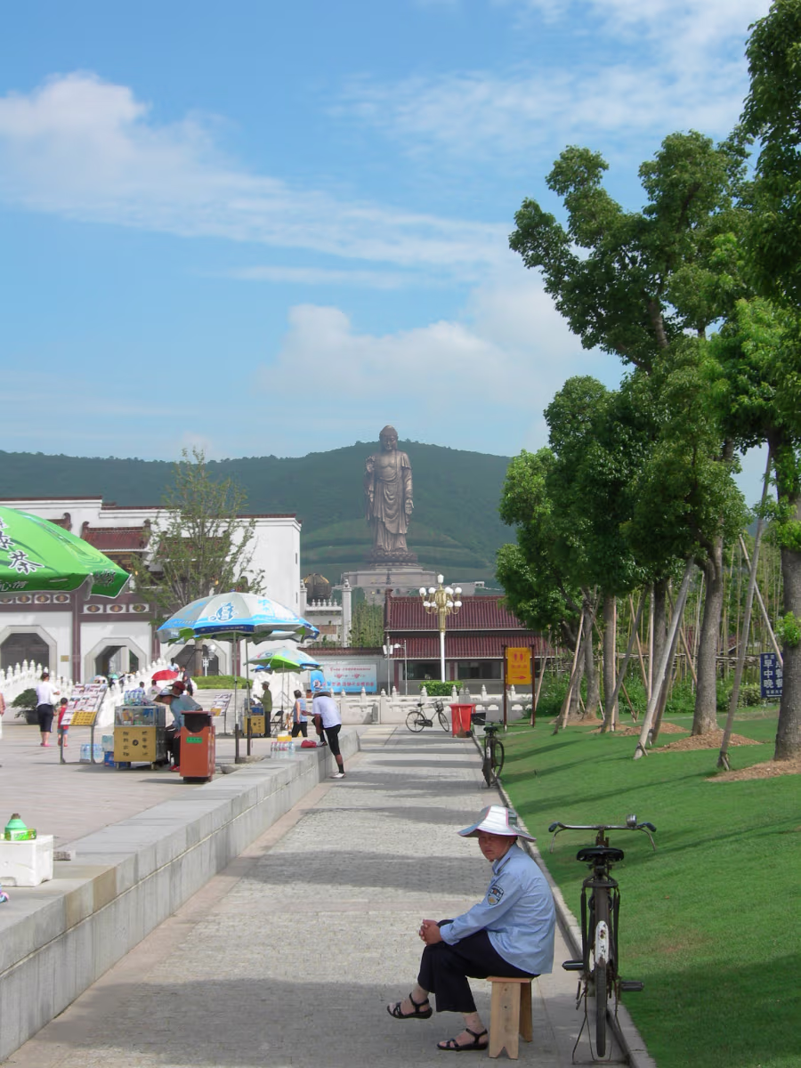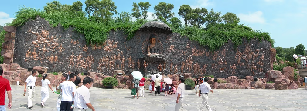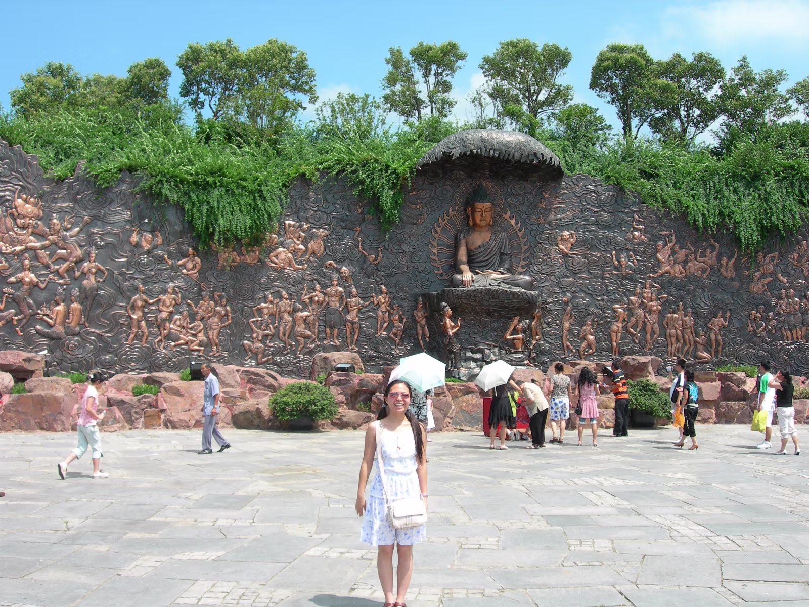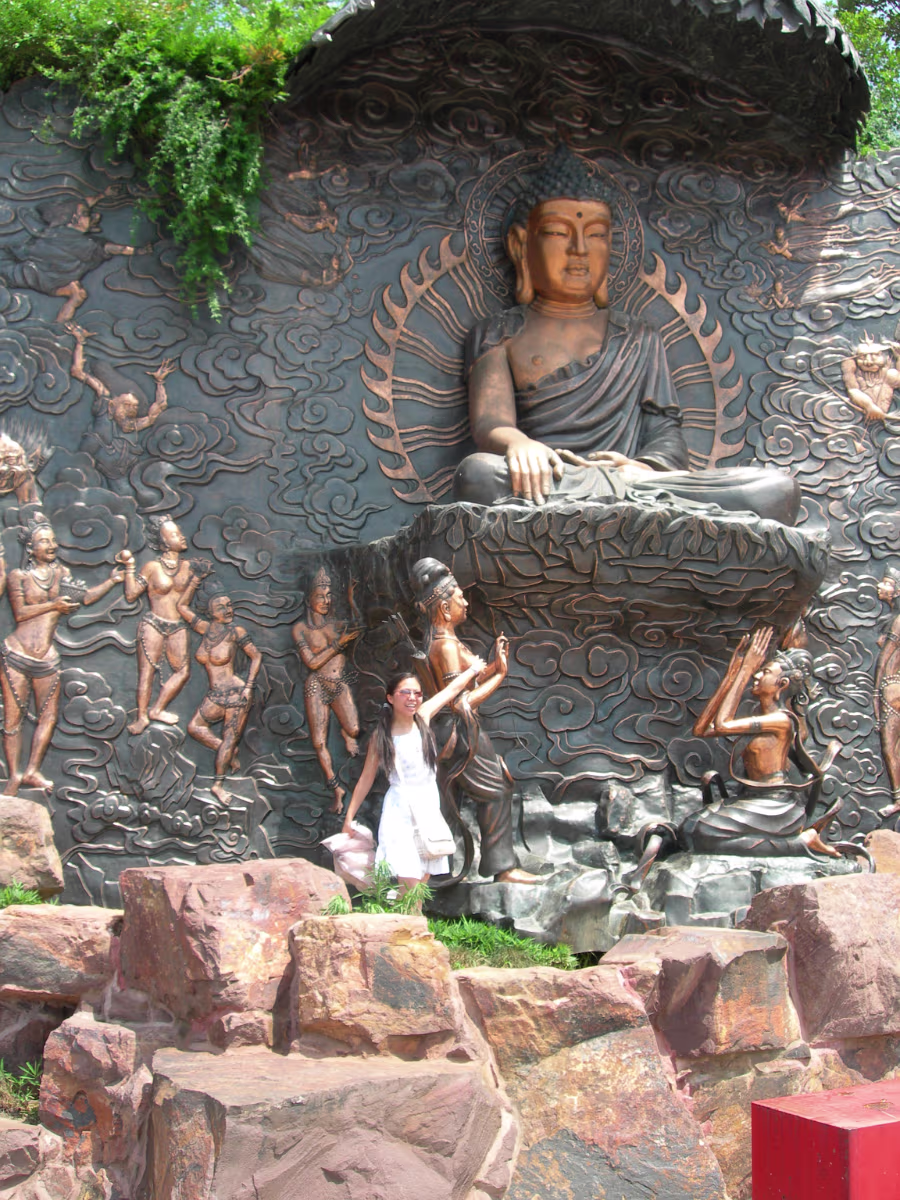 Heading into the park. The characters mean 'Tai Lake water can clean your mind' A Panoramic view of the copper fresco. Bridge to Buddha's Paradise Gate to the 2nd level of Paradise A baby Buddha is in the lotus. Hanhan and one of 108 prayer wheels. The lotus blossom open and Baby Buddha is born! The baby rotates to bless everyone. The water cleanses Buddha. Cleaning is over. Another performance in 2 hours. Ben & the 'magic' pigeons. They can tell your future. Hanhan in front of a copper fresco of the life of Buddha. Hanhan the blasphemer! No touching the copper breasts!!! Buddhist rules, much like the 10 Commandments. The column commemorates Buddha's birth. Gate to the 3rd level of Paradise. One of the big Buddha's Hands, rub it for luck! An extra kid has been added. Its VERY small, hope Buddha answers your prayers buddy. Labels Li Hu (Li Lake)Mei Yuan Park