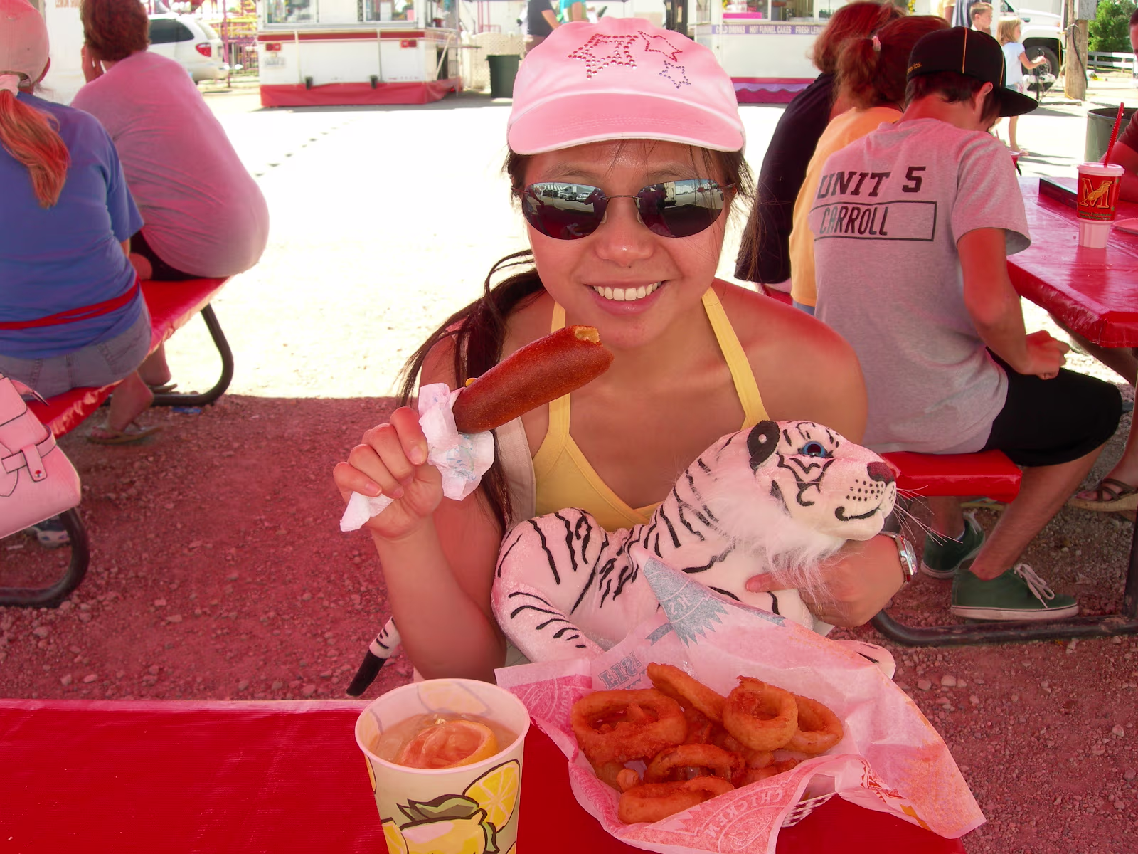 Hanhan's visit begins on the midway. Hanhan LOVES her funnel cake! A view from high atop the double ferris wheel. The winner! Hanhan with her white tiger prize. Eating again! Lemon shake-up, corn dog, and onion rings. Watching the tiger show. The tigers live in Peoria! Feeding a camel at the petting zoo. Ready to feed the goats. Hanhan likes big snakes like this albino python. Hanhan would like a ride in this Hummer. We are ready to call it a happy day and go home now. Labels Hanhan's Master's CeremonyIndependence Day