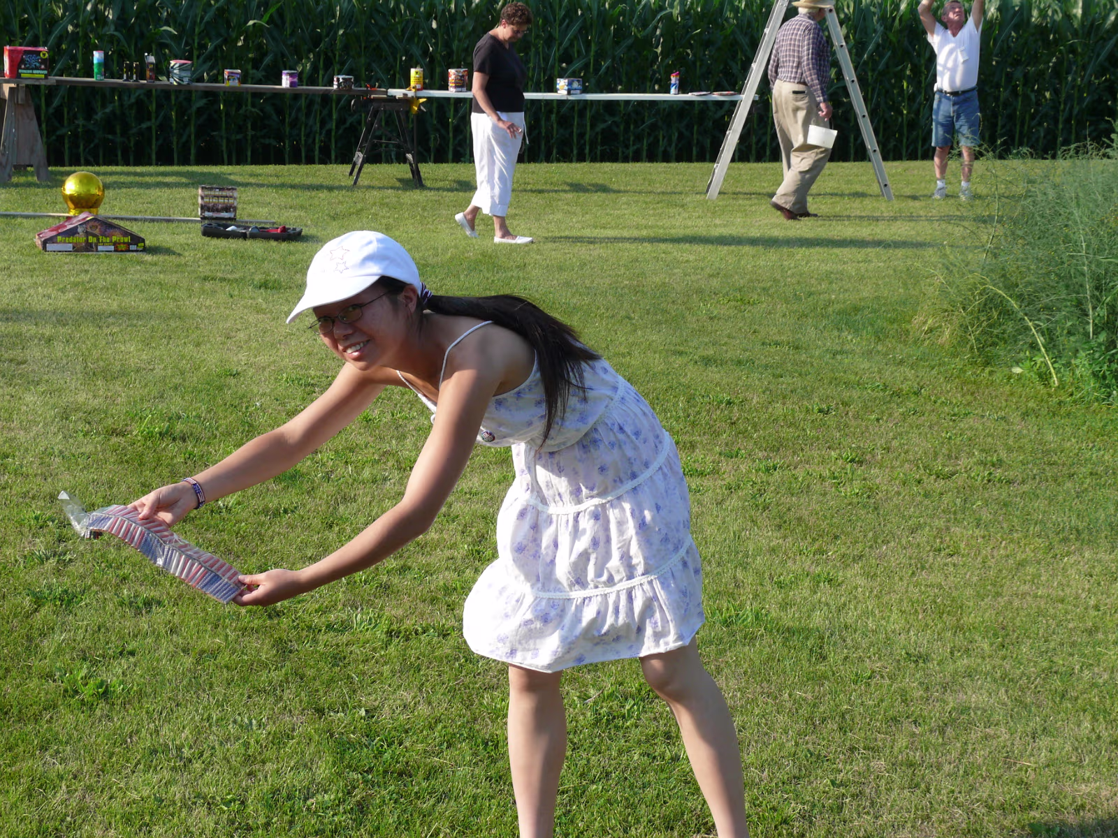 Getting ready to build the fireworks launching pad. Gary shooting a bottle rocket from his hand. Sharon pulling a trailer load of fireworks for the evenings celebration. Getting the fireworks display together. Takes lots of work to get this many fireworks set up and ready. Sharon looks worried about the corn becoming popcorn later tonight! Hanhan and her American flag firecrackers. American firecrackers are attacking Hanhan, run! Hanhan in Ed and Sharon's yard. Hanhan is getting out of the pool for a while. Scott and Susan enjoying a cool snack of fruit and dip. Don preparing a sandwich with his special technique. Hanhan, Cassie, and Tré playing in the pool. One of the fireworks shot during the evening. An aerial display caught as it explodes. Independence Day family picnic begins. Special decorations for Hanhan & Gary's anniversary. The surprise cake, card, and ribbons that Sharon and Ed gave us. Most of the family are enjoying a rest after the picnic lunch. A view of the crowds at the park. Ha! Labels Heart of Illinois Fair 2007Independence Day 2009