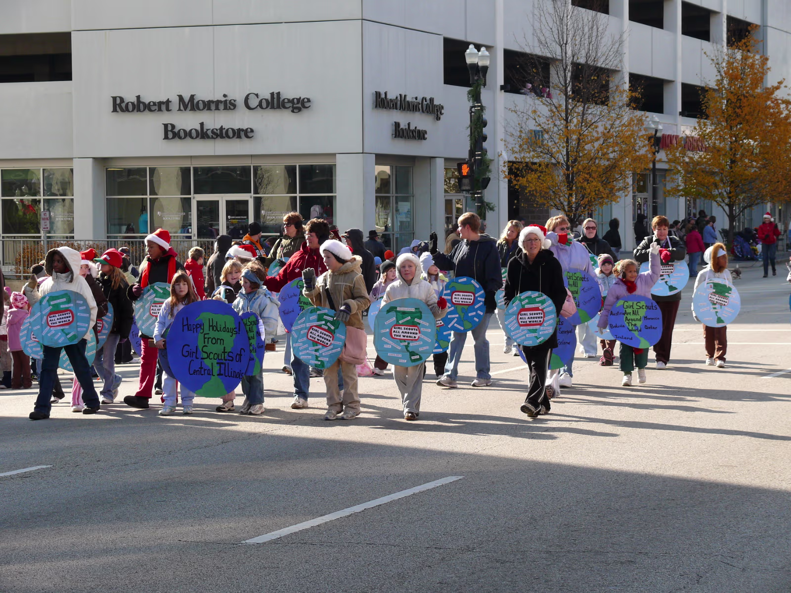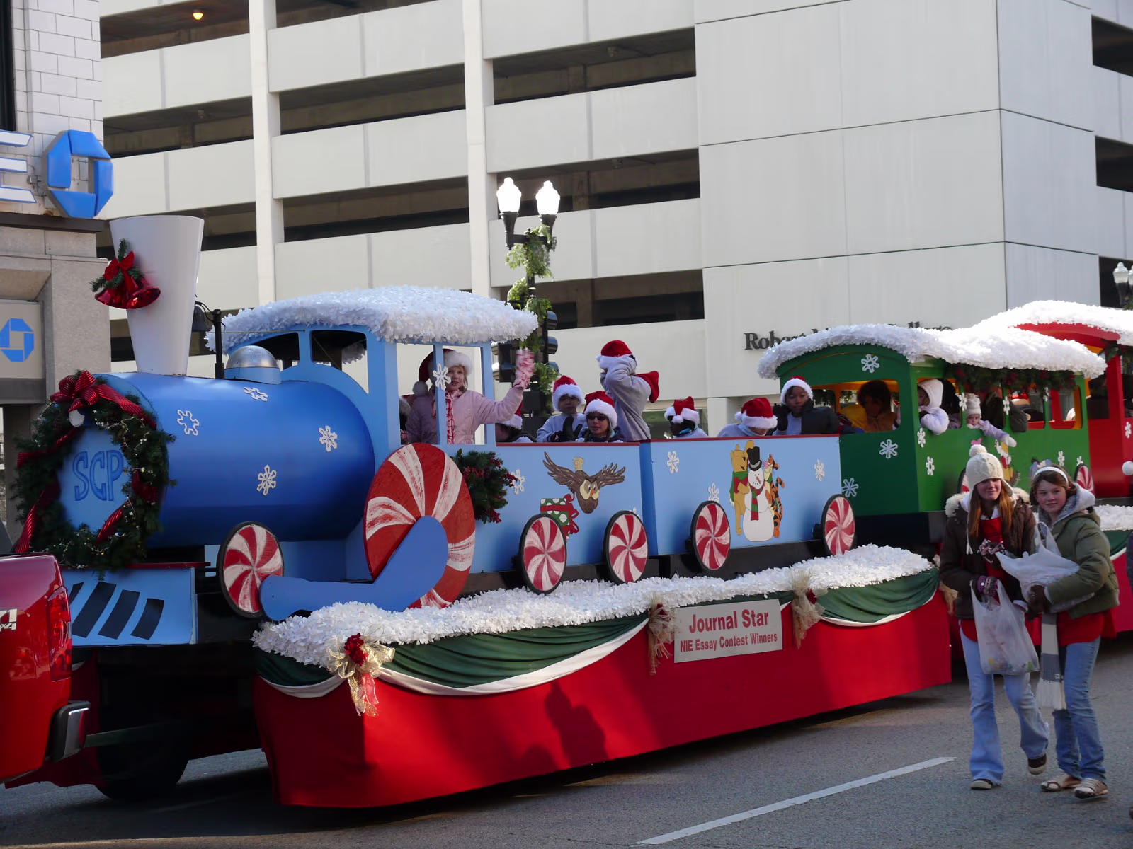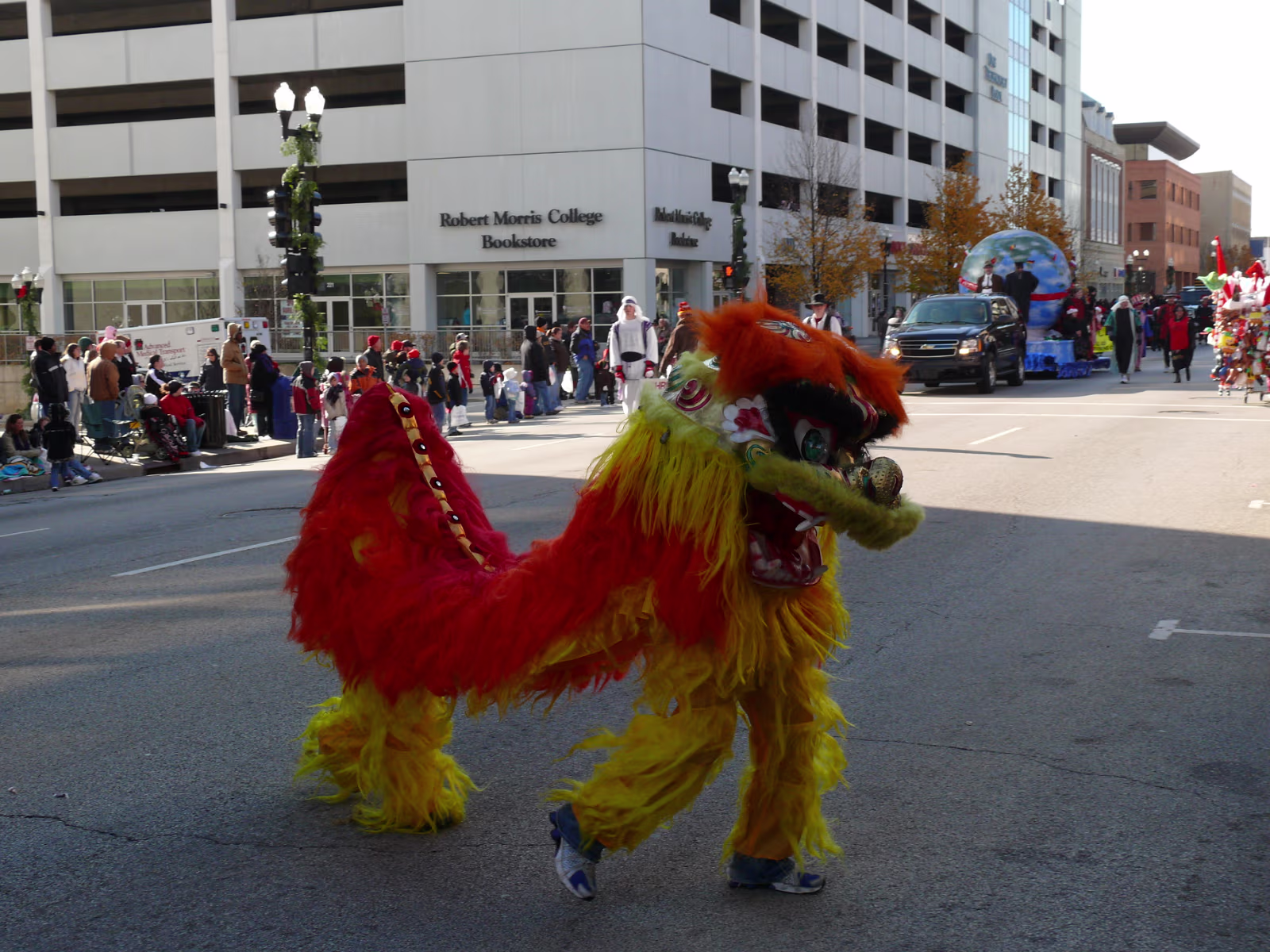 The parade begins! The mounted Color Guard. Navy veterans float. Antique car with Mayor and Congressman. A girl on stilts. Christmas Express Classic car with a 'King' dog in the rear. A parade is not complete without a clown. The Manual High School band. Two Chinese lions. A closeup of one lion. Christmas around the world. The Flintstones Christmas Tree float. Snowman throwing snowballs. Girl Scouts around the world. A dog sled. Note the booties! Cinderella's coach. Two old ladies in their sleigh. Labels Random Illinois PhotosHammer Family Thanksgiving 2007
