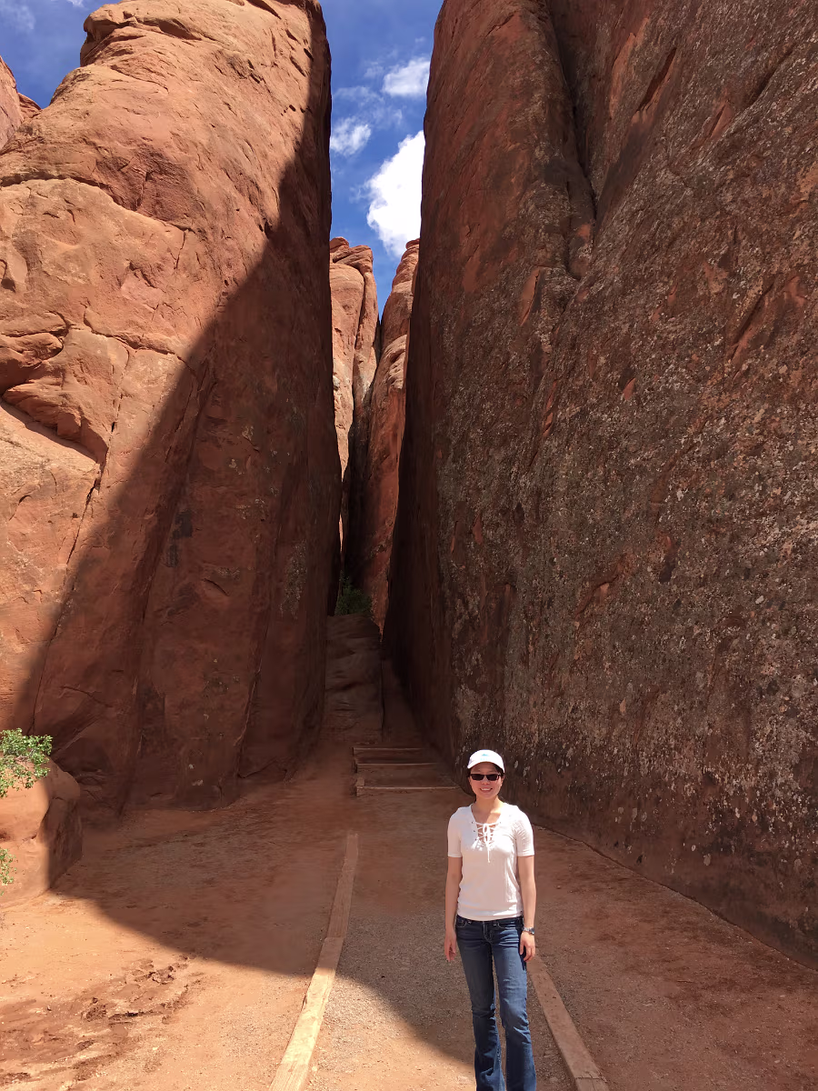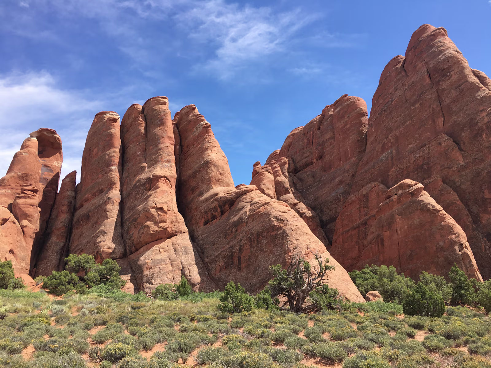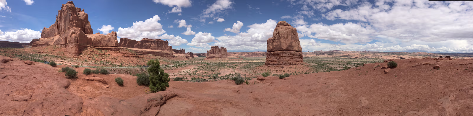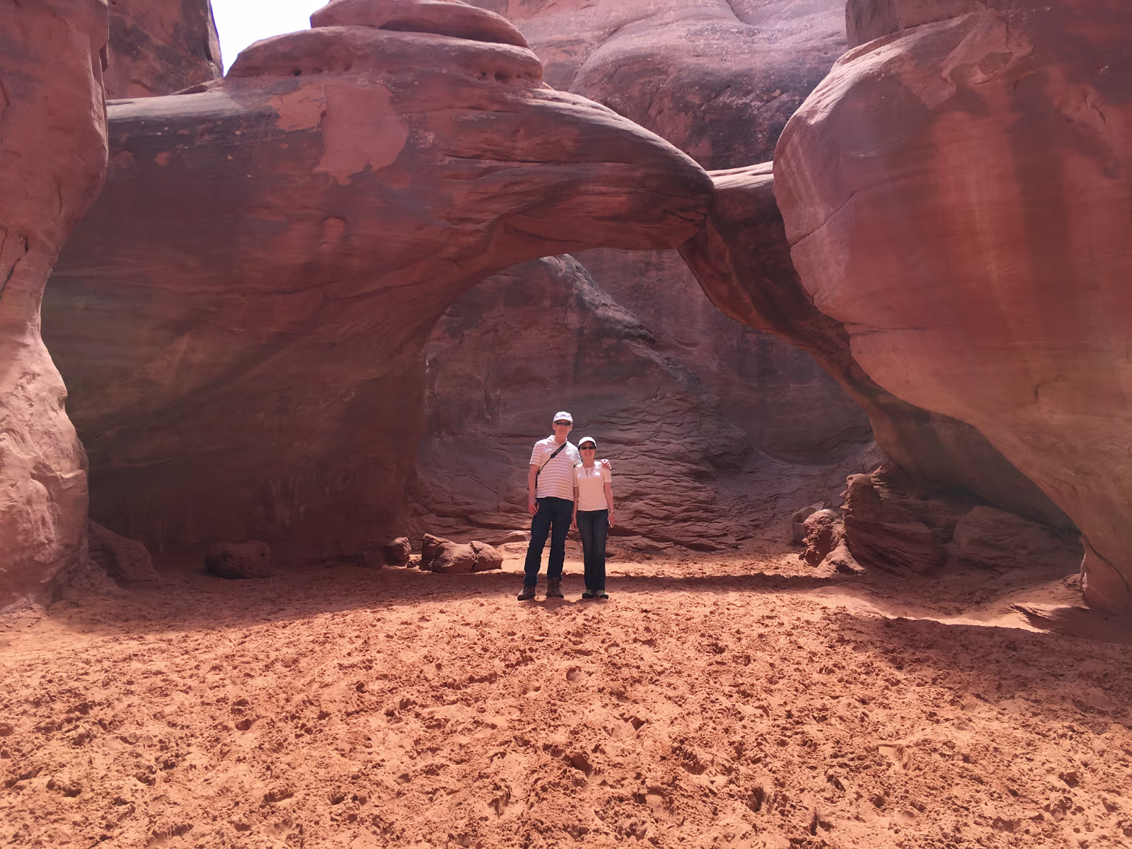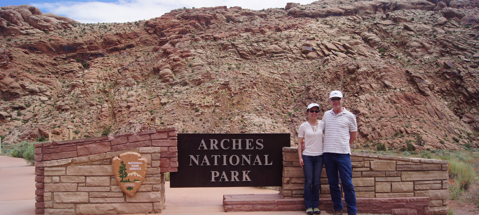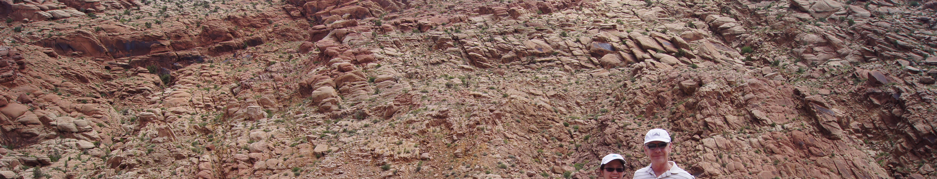 Our 5th park is ready for our inspection! The entire area is red, it's all entrada sandstone. This trail goes between what are called 'fins'.These are harder sandstone that were exposed by erosion to look like a fish fin. The first of many arches we were close to in the park. One day these fins will be arches.For now, they are just pretty. This arch nearly doubled in size when a huge rockfall took place a few years ago. Park Avenue, a favorite view and picture. The entire park is filled with odd, spectacular formations like these. Two buttes appear from nowhere. This is called 'The Three Gossips' Courthouse Towers.Look at the size of this formation. Closeup of the Three Gossips This is supposed to look like a ram (sheep) Another strange yet beautiful formation. This is 'The Windows' area of the park. Balanced Rock.It could fall at any time. One arch is there, the other to its left is just forming.Hanhan has the water to wait until it is done. Not the end of the trail for us! Looking through rock at rocks. This is 'Fins Forest' Labels Mesa Verde NPCanyonlands NP