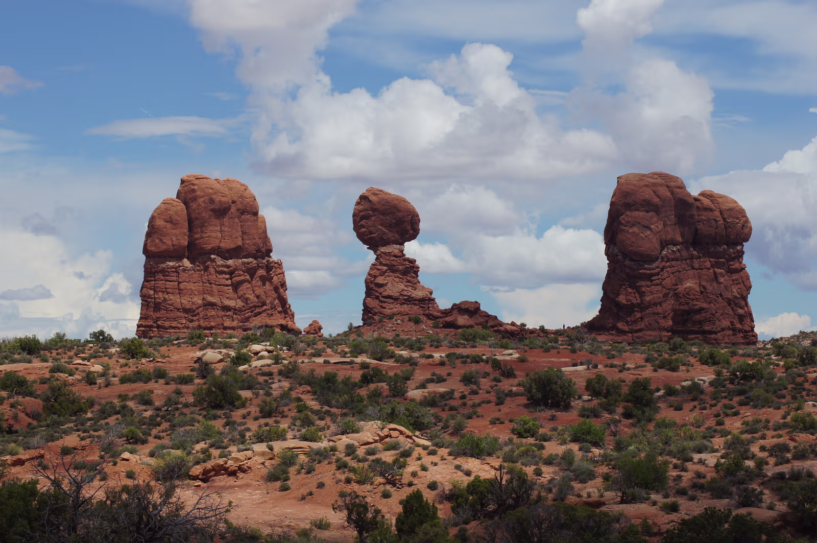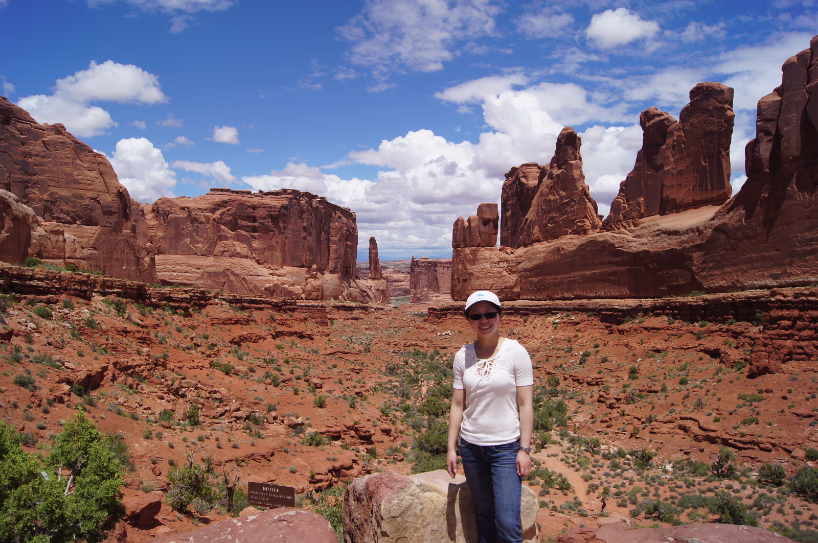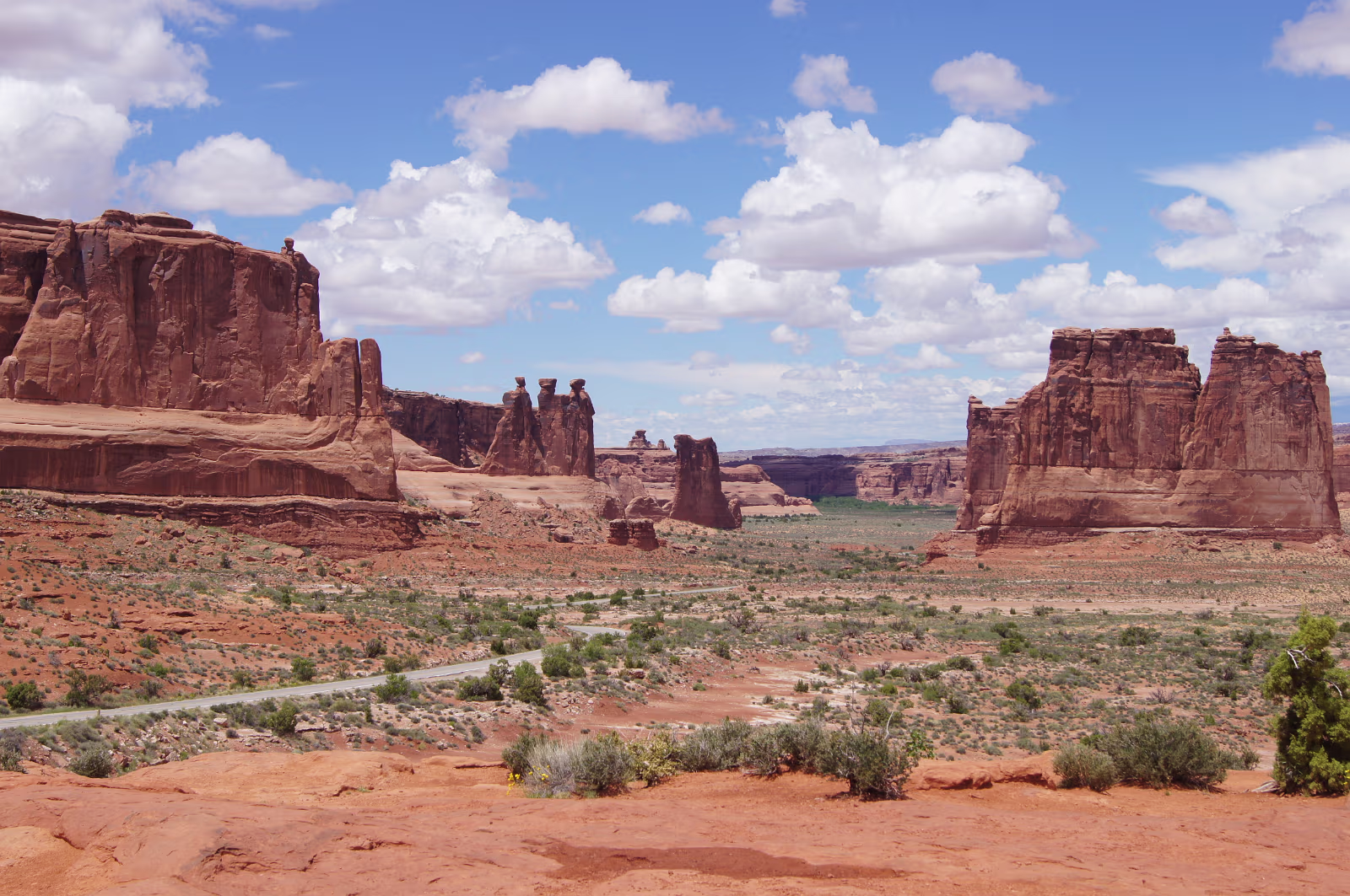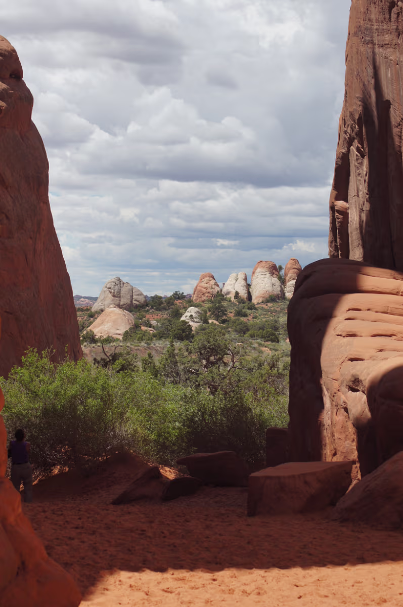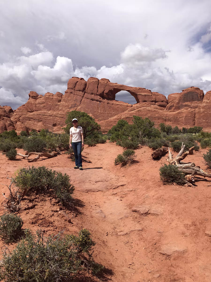 Our 5th park is ready for our inspection! The entire area is red, it's all entrada sandstone. This trail goes between what are called 'fins'.These are harder sandstone that were exposed by erosion to look like a fish fin. The first of many arches we were close to in the park. One day these fins will be arches.For now, they are just pretty. This arch nearly doubled in size when a huge rockfall took place a few years ago. Park Avenue, a favorite view and picture. The entire park is filled with odd, spectacular formations like these. Two buttes appear from nowhere. This is called 'The Three Gossips' Courthouse Towers.Look at the size of this formation. Closeup of the Three Gossips This is supposed to look like a ram (sheep) Another strange yet beautiful formation. This is 'The Windows' area of the park. Balanced Rock.It could fall at any time. One arch is there, the other to its left is just forming.Hanhan has the water to wait until it is done. Not the end of the trail for us! Looking through rock at rocks. This is 'Fins Forest' Labels Mesa Verde NPCanyonlands NP