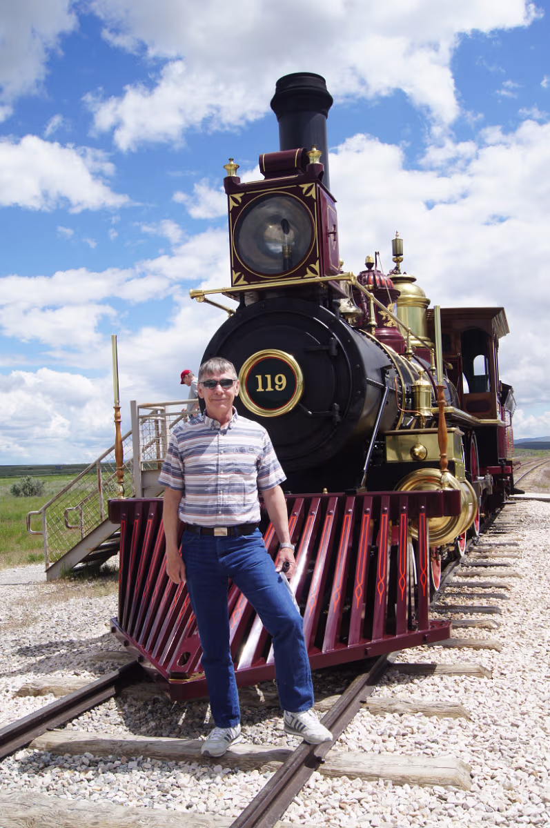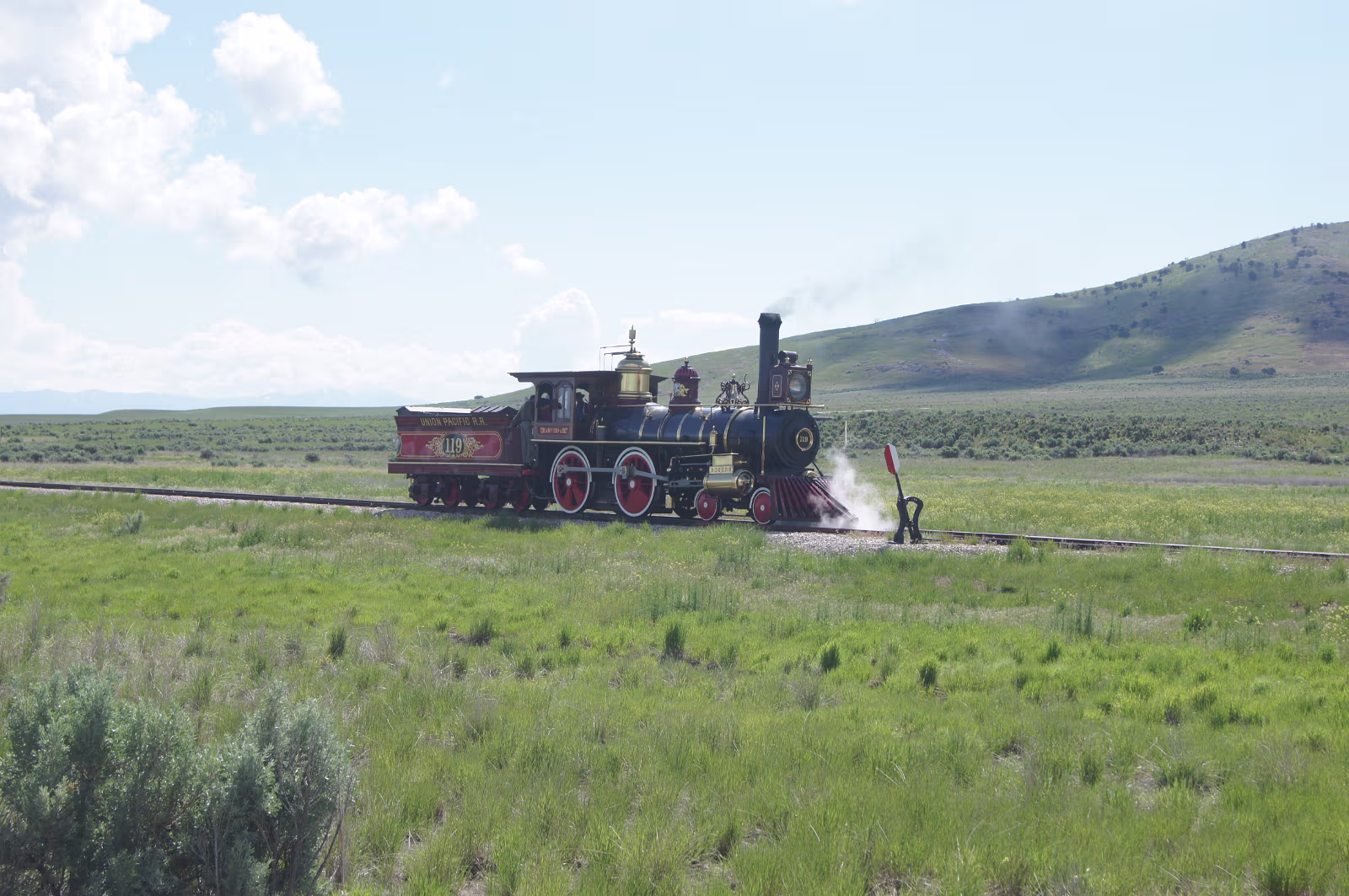 This is a spot I always wanted to visit. The site where East met West. Oh boy!The 119 is underway when we arrive! The train crew is very friendly.I would be too if that was my 'job'. This plaque is for the Chinese laborers who helped build the Transcontinental Railroad. Posing with the engine from the East. Thomas has nothing on this engine! The last railroad tie laid for the Transcontintal Railroad. Look at the detail on this engine.Not done today for sure. Original steampunk. Bell and whistle.See the frontiersman with is rifle? The hopper, coal and water were kept here.They had to stop for water every 10-15 miles! The Irish also contributed men to the rails.Hell on Wheels wouldn't have been possible without them! Watch the historic engine under way!Blow the whistle again! Labels Great Basin NPSalt Lake City Area