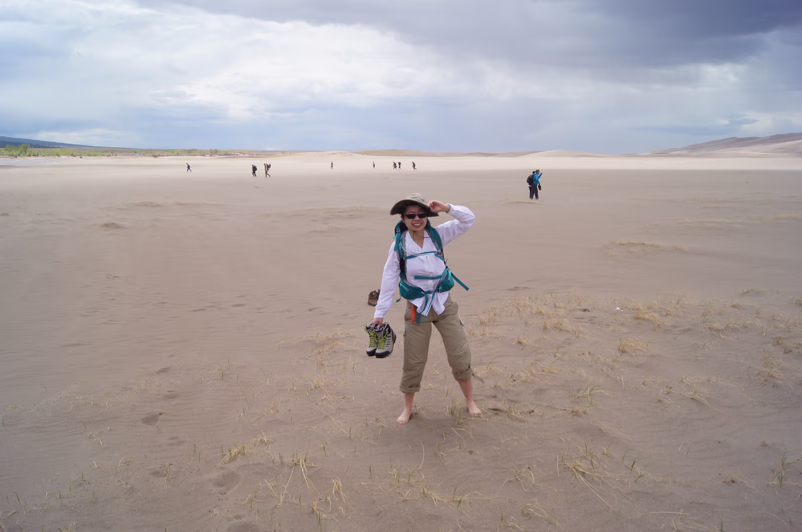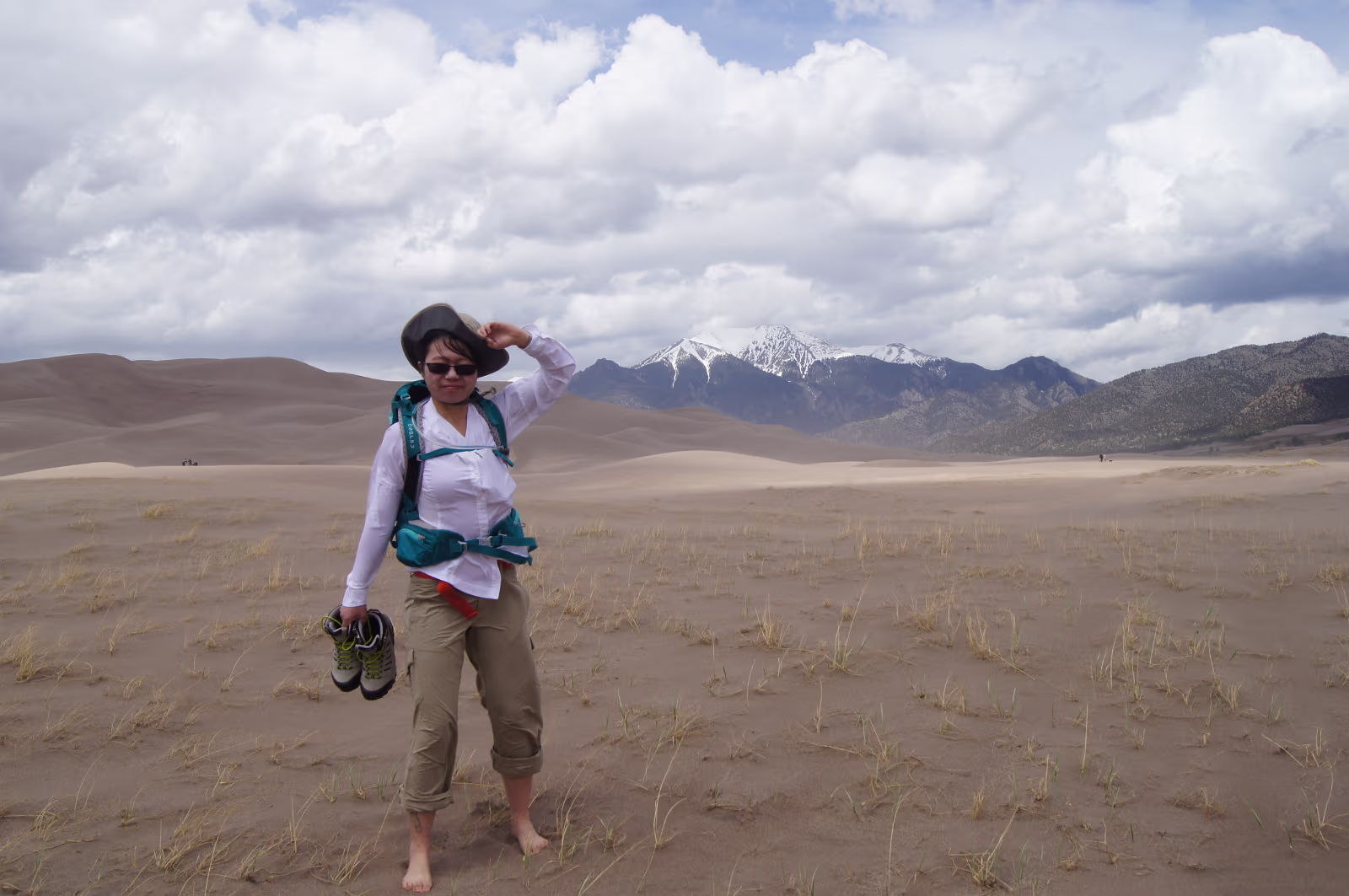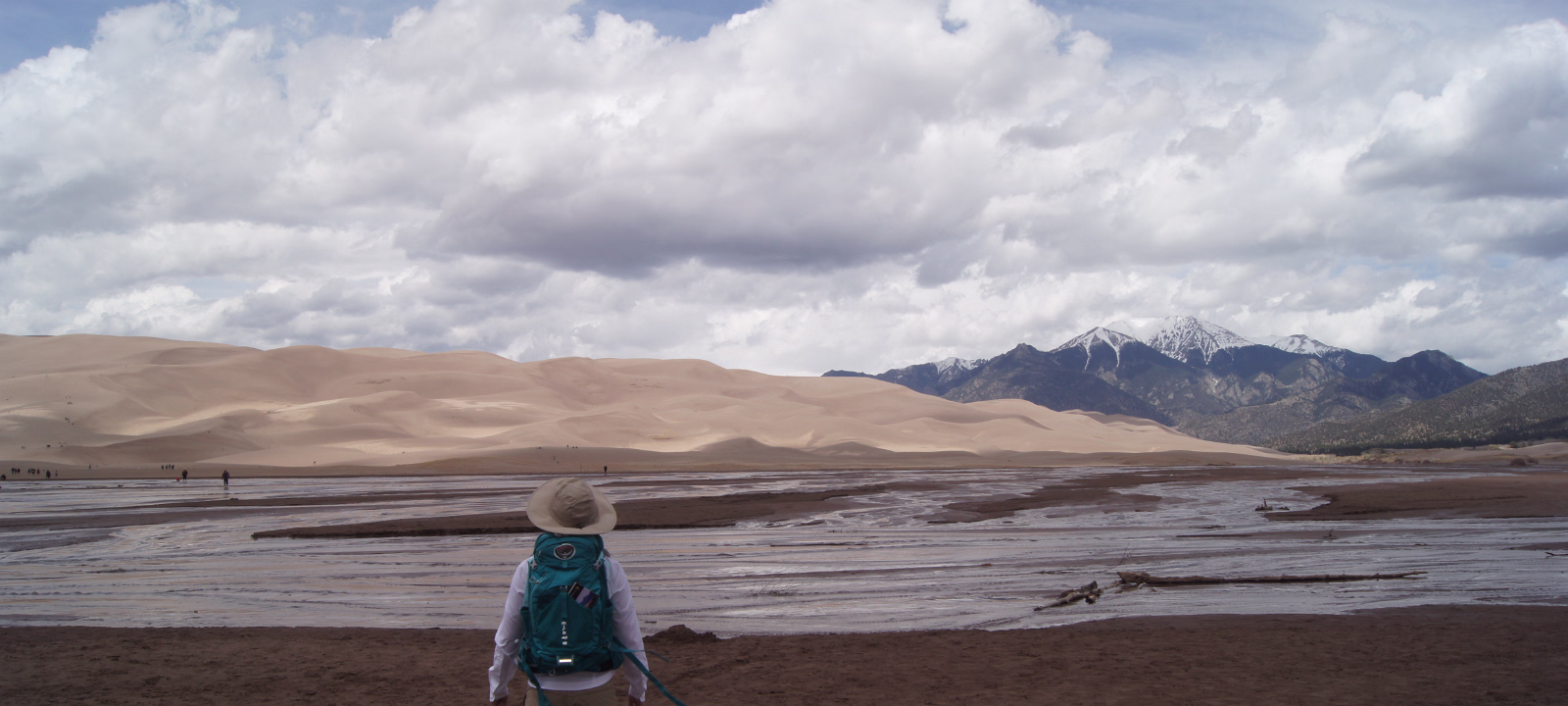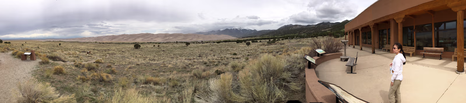Nice weather for our visit to the area. Way outside the park, the dunes are already easily visible.Way out of place too, just a big pile of sand among all the mountains. Ready to start our exploration of the park. The scrub, the snow capped mountains, the low clouds, and the dunes make for a strange experience. Taking it all in from the observation deck. Gary and his trusty vaporizer brave the stiff wind and the chill. I know, but everyone needs one selfie. Hanhan the brave is going into the wilderness to face off with the sand dune.Will she remain? Should I wade the freezing water of the creek?Why is there a creek here anyway? Tom Sawyer has forded one branch of the creek.It was VERY cold water! The wind was terrible this day as there was a thunderstorm coming in.Hanhan was sandblasted, it was quite painful. The people in the background are smart, they are heading to the visitors center and safety. The storm and the dunes. eerie feeling being isolated like this. Run Hanhan run! Labels Rocky Mountain NPBalck Canyon of the Gunnison
