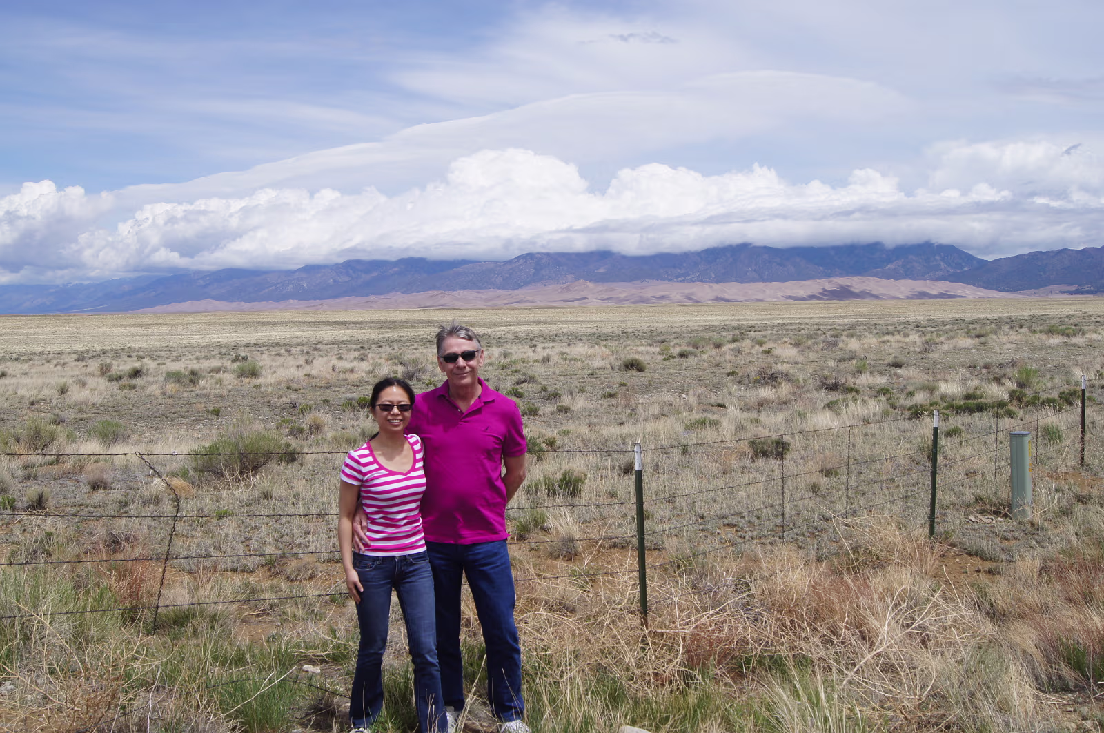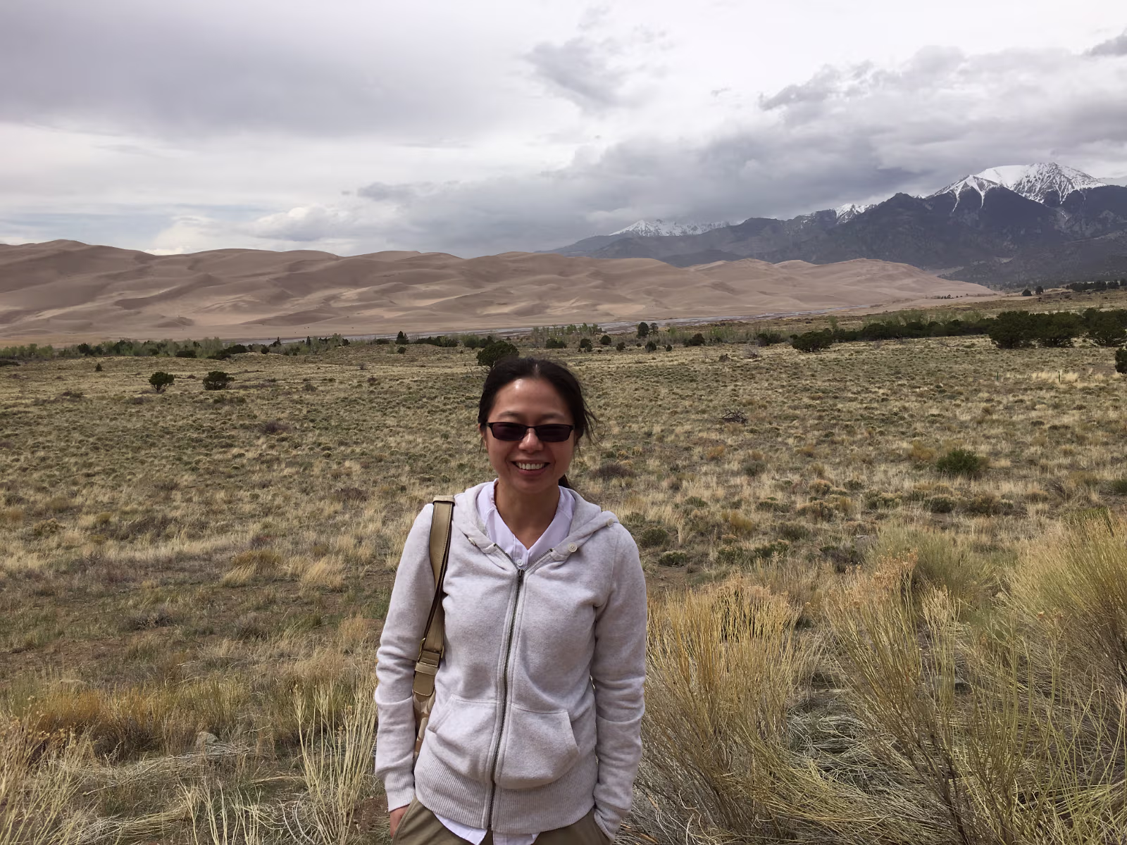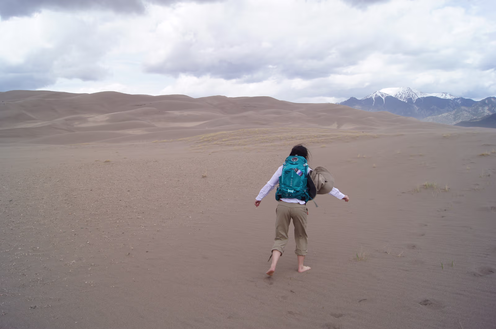 Nice weather for our visit to the area. Way outside the park, the dunes are already easily visible.Way out of place too, just a big pile of sand among all the mountains. Ready to start our exploration of the park. The scrub, the snow capped mountains, the low clouds, and the dunes make for a strange experience. Taking it all in from the observation deck. Gary and his trusty vaporizer brave the stiff wind and the chill. I know, but everyone needs one selfie. Hanhan the brave is going into the wilderness to face off with the sand dune.Will she remain? Should I wade the freezing water of the creek?Why is there a creek here anyway? Tom Sawyer has forded one branch of the creek.It was VERY cold water! The wind was terrible this day as there was a thunderstorm coming in.Hanhan was sandblasted, it was quite painful. The people in the background are smart, they are heading to the visitors center and safety. The storm and the dunes. eerie feeling being isolated like this. Run Hanhan run! Labels Rocky Mountain NPBalck Canyon of the Gunnison