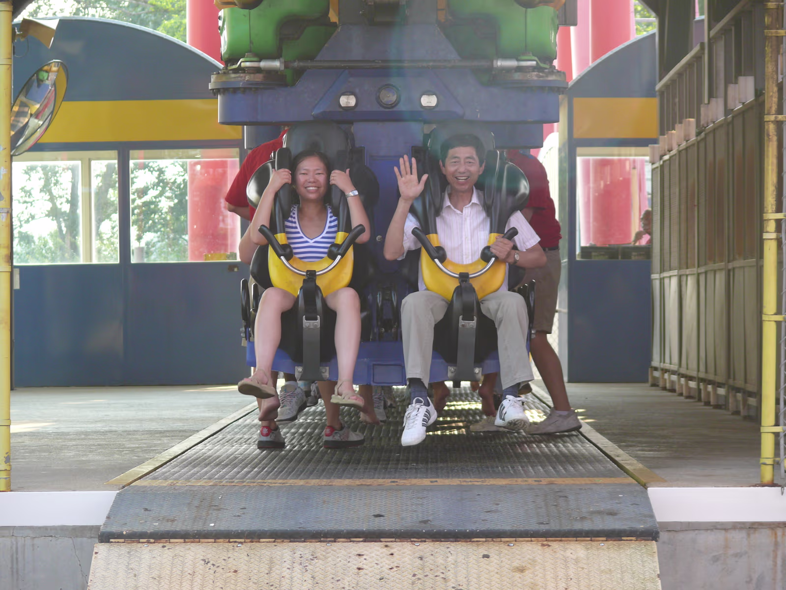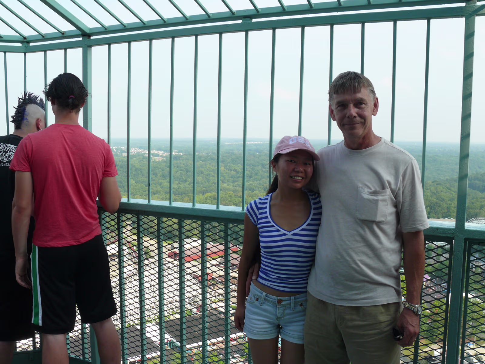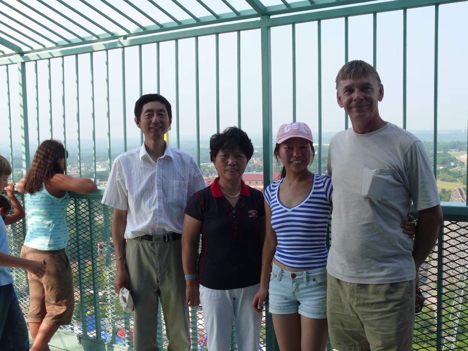 Parents loved the Diamondback as you can tell Parents on the Racer, a side-by-side roller coaster. First ride ever The Racer, twin tracks A modern steelroller coaster, the Vortex Leaves a wake behind its so fast Here we go The Diamondback, tallest, fastest coaster on earth The blue and red coasters are racing The red one is winning At the top of the Eiffel Tower Hanhan and her parents had a lot of fun here Gary overcame his fear of heights to be here Ready to ride the Invertigo The floor has dropped away and the ride is on Hanhan's mouth is wide open as she screams Twisted and rolled upside down at 70 MPH Nik Wallenda going up to walk the highwire. It's really high up there Nik is 262 feet above the hard asphalt Starting his walk. no harness, no nets. No brains Labels Fireworks TripMissouri 2008