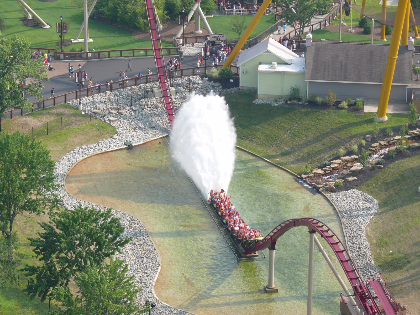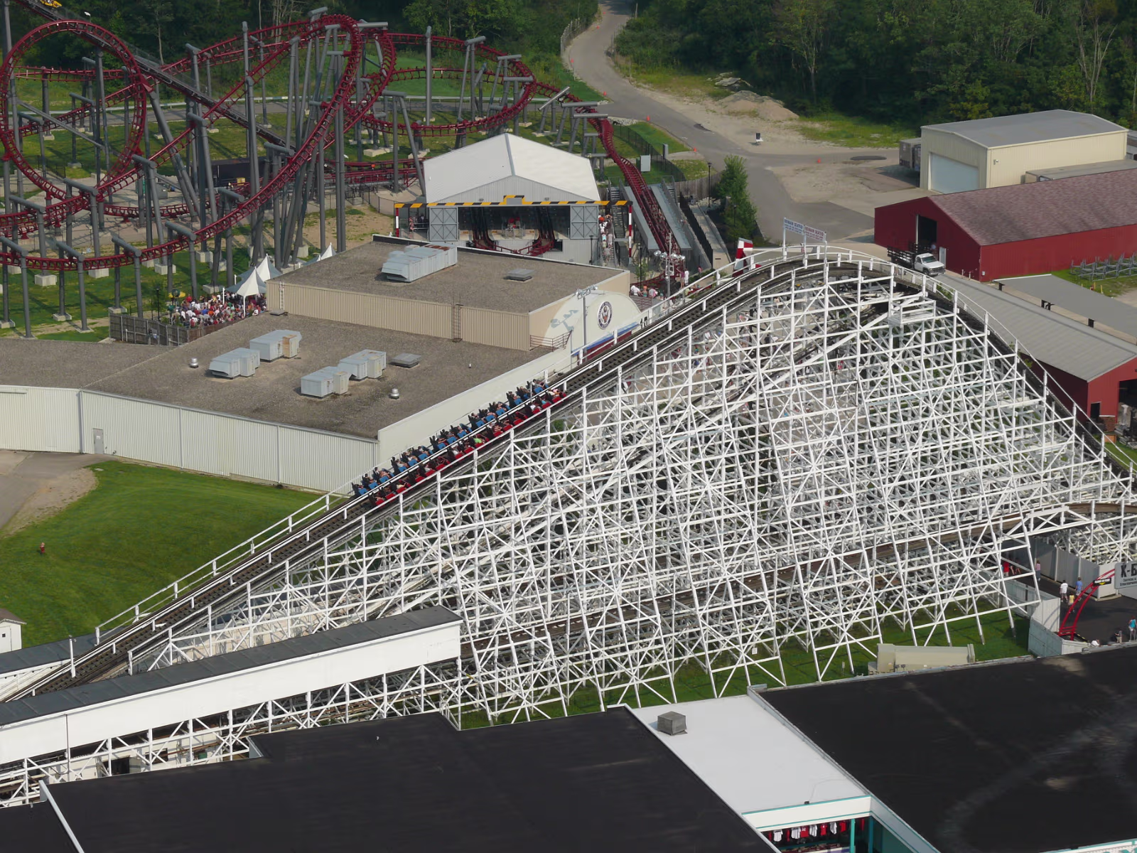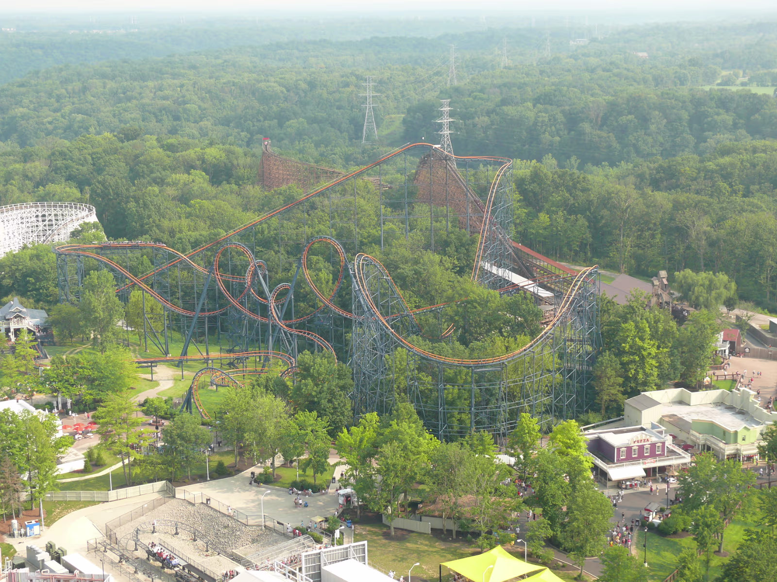 Parents loved the Diamondback as you can tell Parents on the Racer, a side-by-side roller coaster. First ride ever The Racer, twin tracks A modern steelroller coaster, the Vortex Leaves a wake behind its so fast Here we go The Diamondback, tallest, fastest coaster on earth The blue and red coasters are racing The red one is winning At the top of the Eiffel Tower Hanhan and her parents had a lot of fun here Gary overcame his fear of heights to be here Ready to ride the Invertigo The floor has dropped away and the ride is on Hanhan's mouth is wide open as she screams Twisted and rolled upside down at 70 MPH Nik Wallenda going up to walk the highwire. It's really high up there Nik is 262 feet above the hard asphalt Starting his walk. no harness, no nets. No brains Labels Fireworks TripMissouri 2008