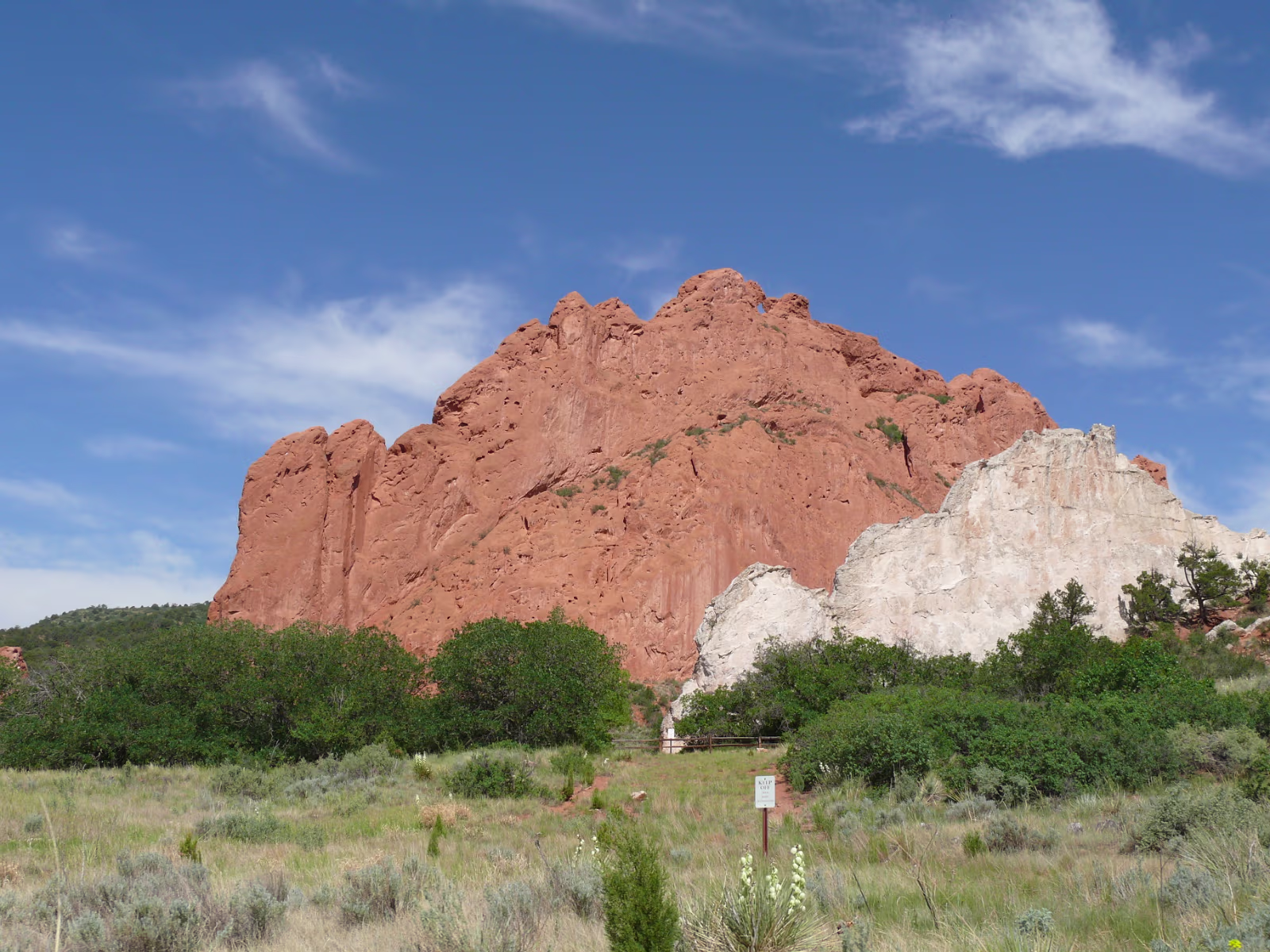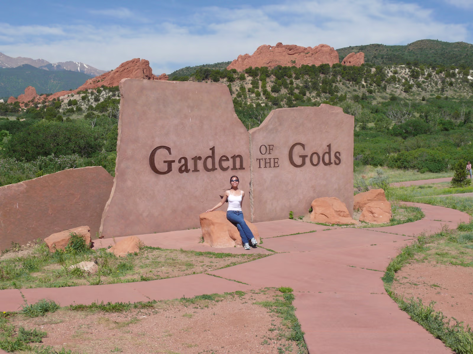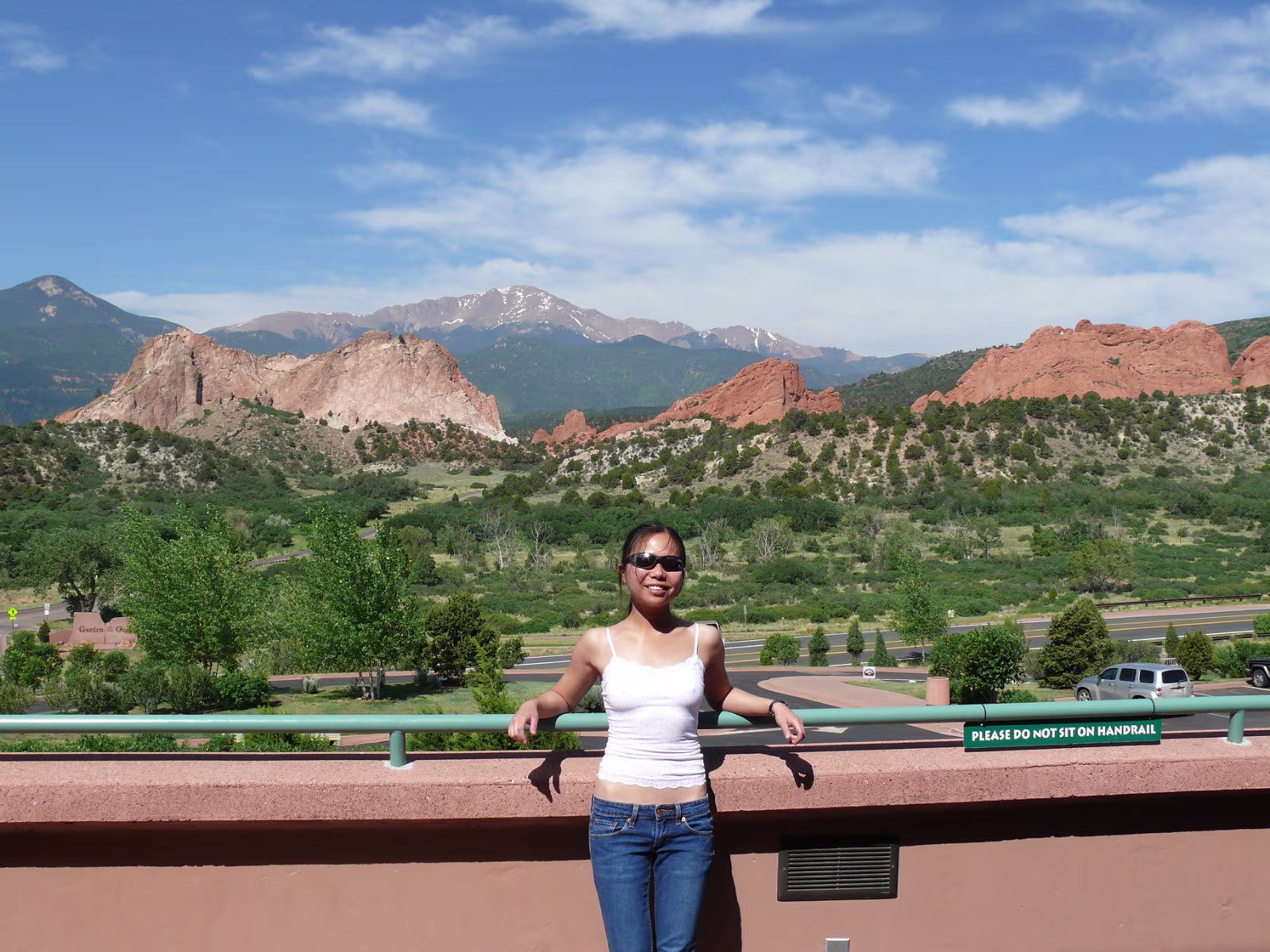 More snowy mountains on the way to Colorado. We like their motto! Red rocks in Utah. Unique formations in Utah. Typical western scene. Broken fence, sagebrush, hills in the distance. Colorado at last! Garden of the Gods, is impressive even from the road. Dinosaur skull in the visitor center. Can you find the teeth? Garden of the Gods, we are ready to begin a day of sightseeing. Garden of the Gods and Pike's Peak. We'll visit both today. The unique rocks here gave the place its name. The nature center was a nice experience. A fine day is in store. Red and gray are different types of rock, but so close together. Look at how vertical these are, like towers. Rock forest. Look at the thin layers behind Hanhan. Each just came up from the Earth. Kissing Camels. It's getting hot out here and it's only 11:30. This used to be a chuckwagon dinner area. Labels Oregon, the Beaver State