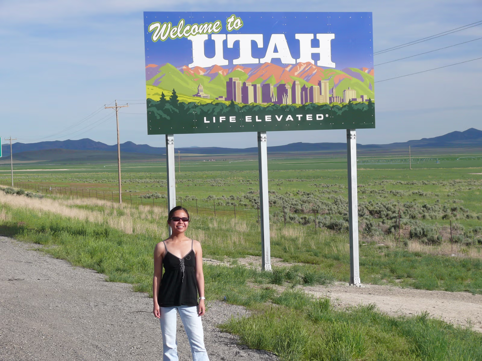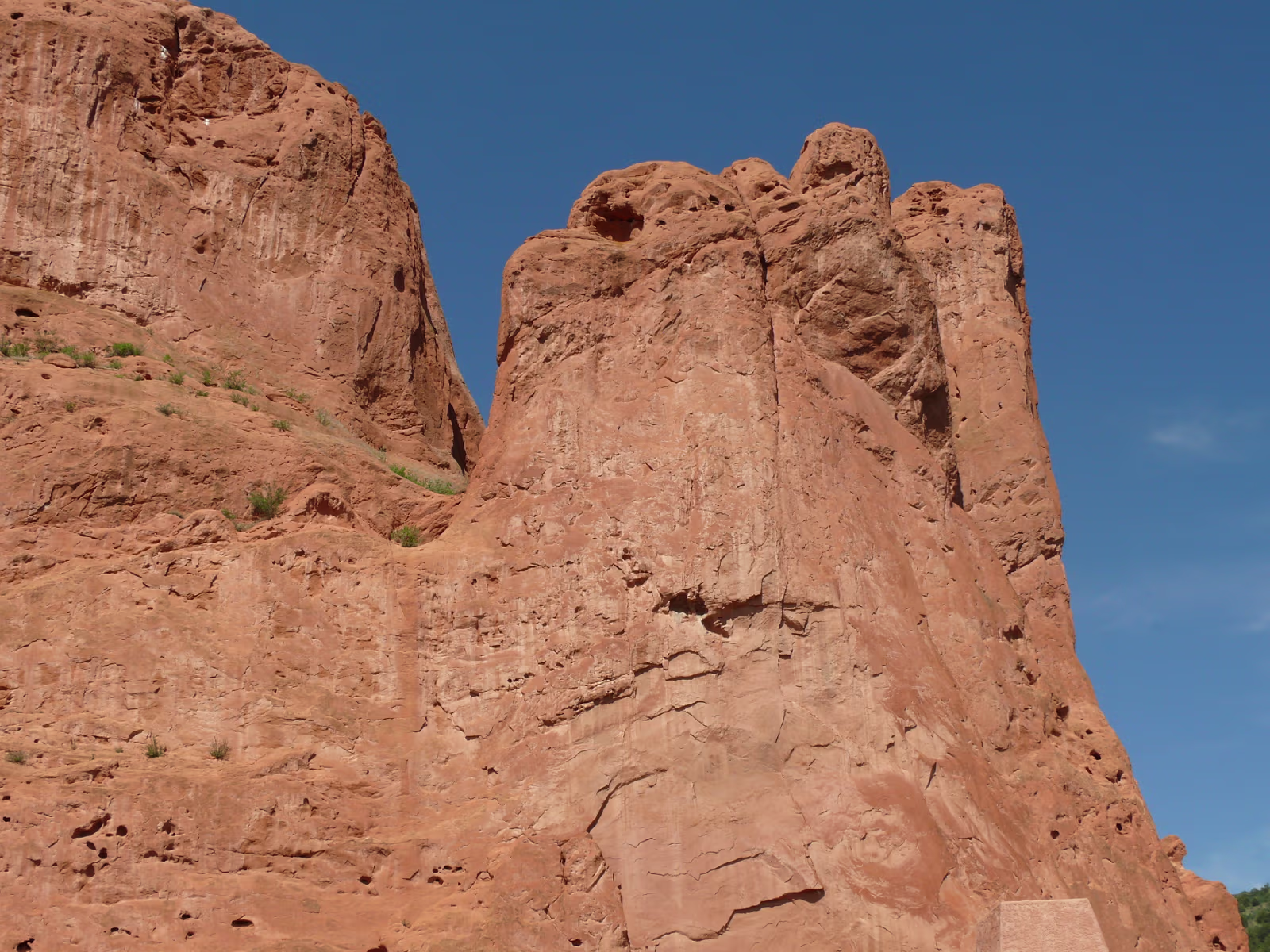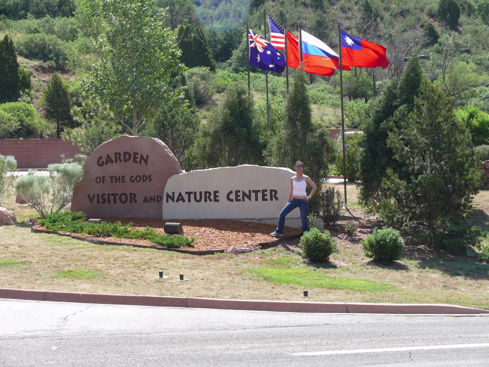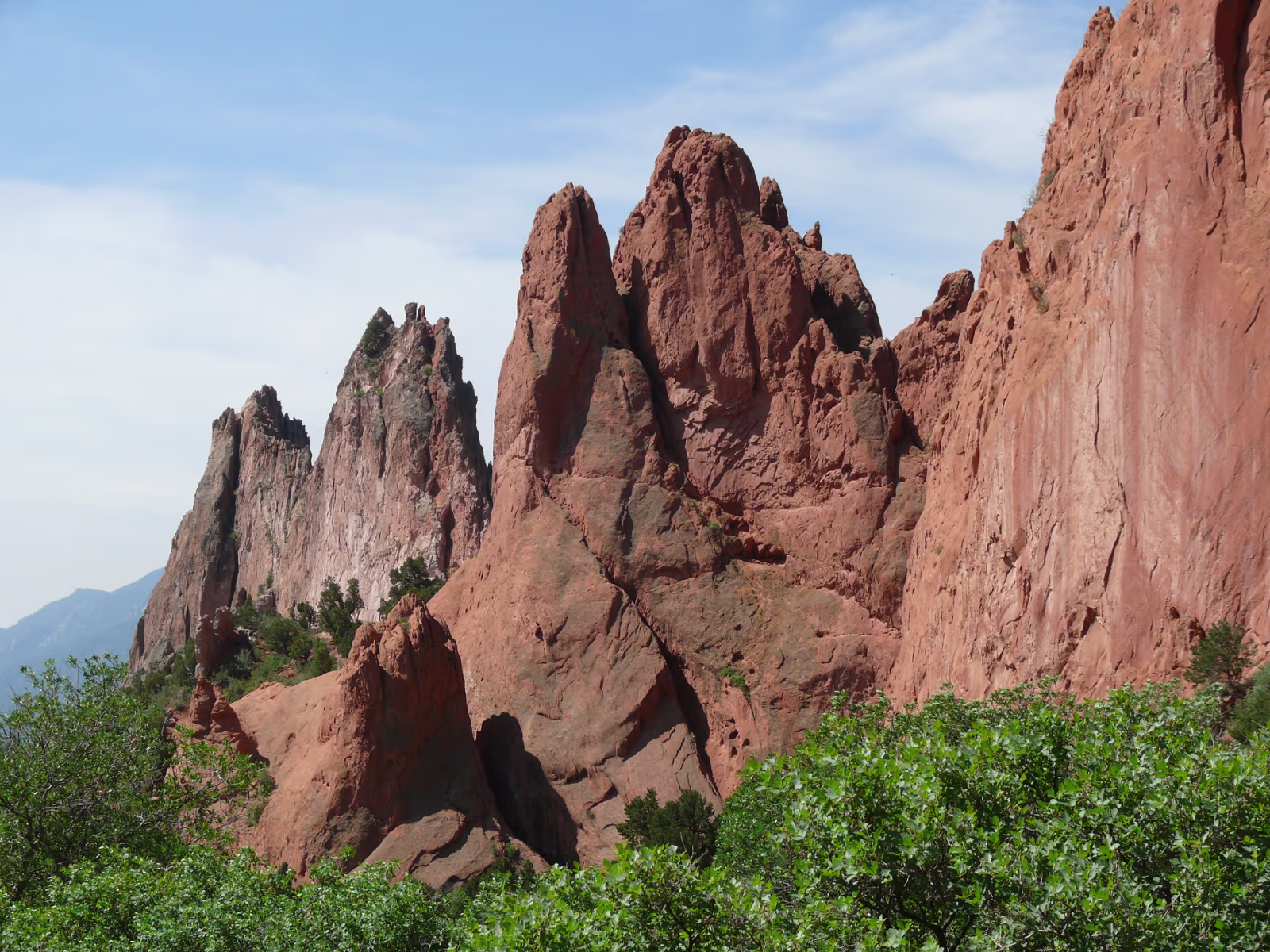 More snowy mountains on the way to Colorado. We like their motto! Red rocks in Utah. Unique formations in Utah. Typical western scene. Broken fence, sagebrush, hills in the distance. Colorado at last! Garden of the Gods, is impressive even from the road. Dinosaur skull in the visitor center. Can you find the teeth? Garden of the Gods, we are ready to begin a day of sightseeing. Garden of the Gods and Pike's Peak. We'll visit both today. The unique rocks here gave the place its name. The nature center was a nice experience. A fine day is in store. Red and gray are different types of rock, but so close together. Look at how vertical these are, like towers. Rock forest. Look at the thin layers behind Hanhan. Each just came up from the Earth. Kissing Camels. It's getting hot out here and it's only 11:30. This used to be a chuckwagon dinner area. Labels Oregon, the Beaver State