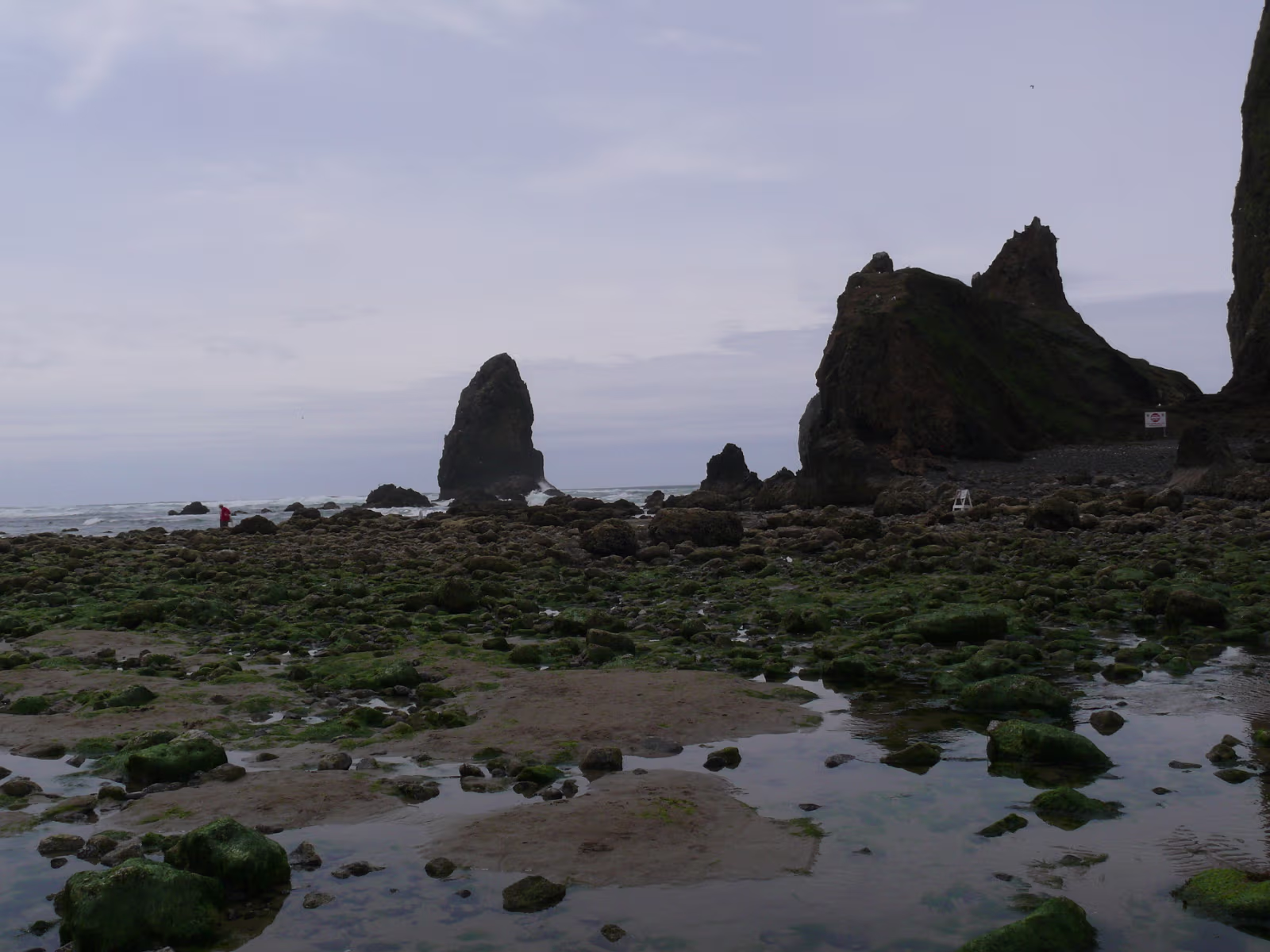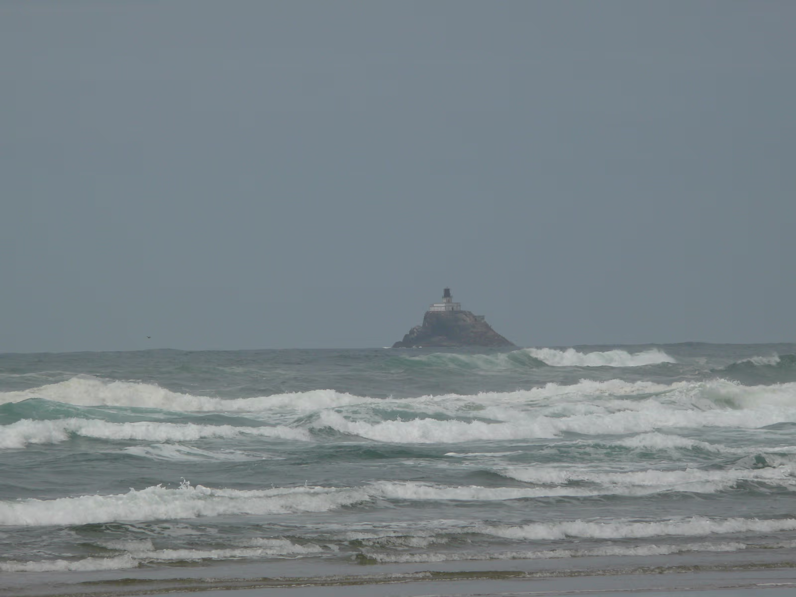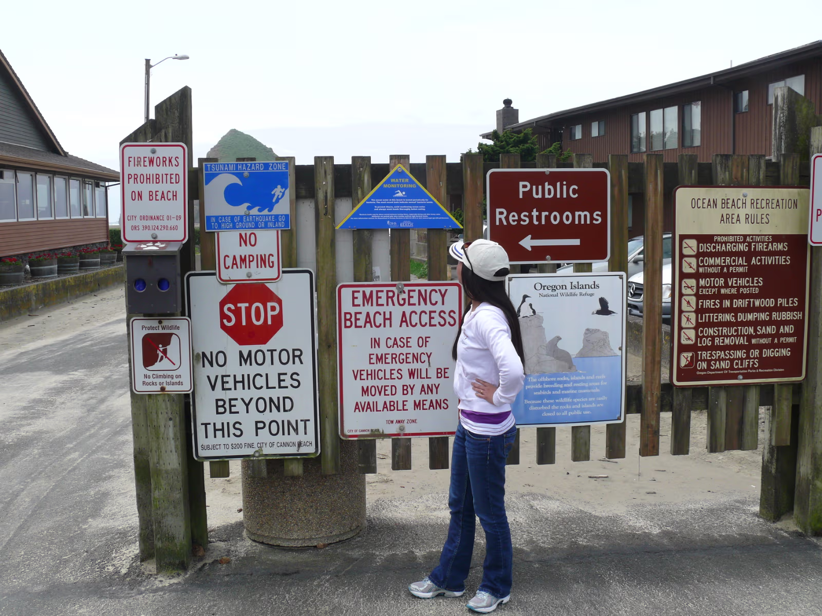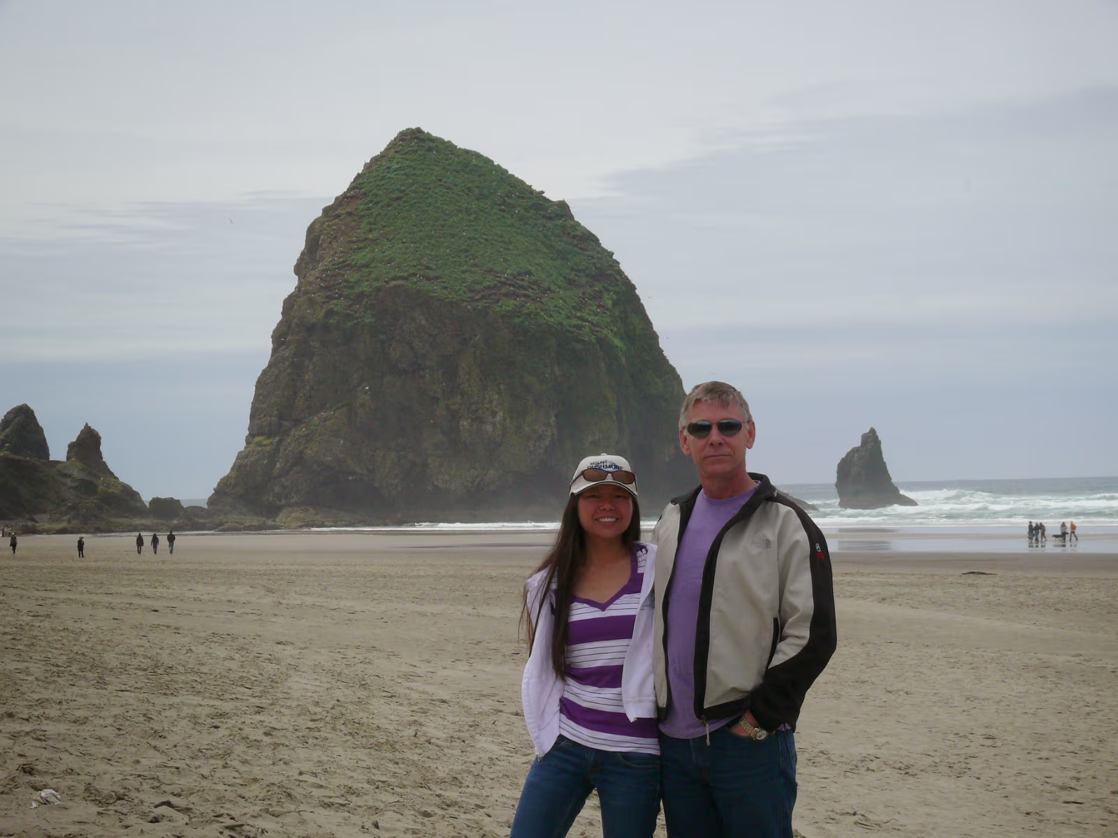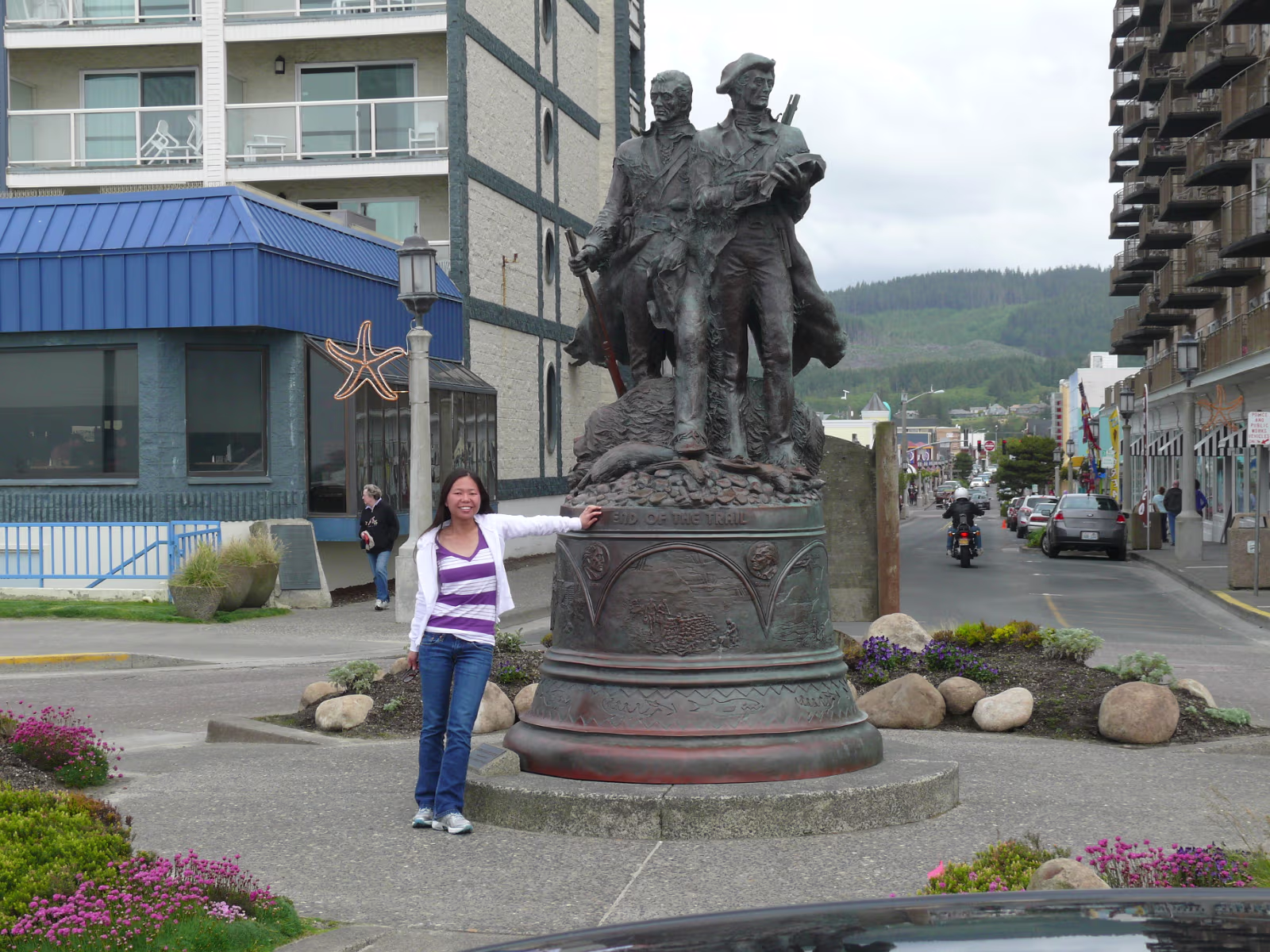 One of the huge Sitka Spruce trees along the Oregon coast. Examining the many rules at Cannon Beach. Hanhan is finally at the Pacific Ocean! Haystack Rock. The whole coast is rocky, but this is the most famous. Hanhan & John bearking the law stepping on the rocks. Tidal pools. Can't get near them as the Beach Police will come hollar at you. Watch for waves Hanhan! Enjoying the beach. Hanhan would not get in the water, just get her finger wet. A time honored tradition, writing your name in the sand. A last look at Haystack. The waves make a nice picture and a nice sound. The lighthouse to warn ships of the danger. In case of Tsunami, break glass! Seaside Oregon. End of the Lewis and Clark Trail. We have followed the entire trail now. Labels Mt. Hood & Multnomah Falls