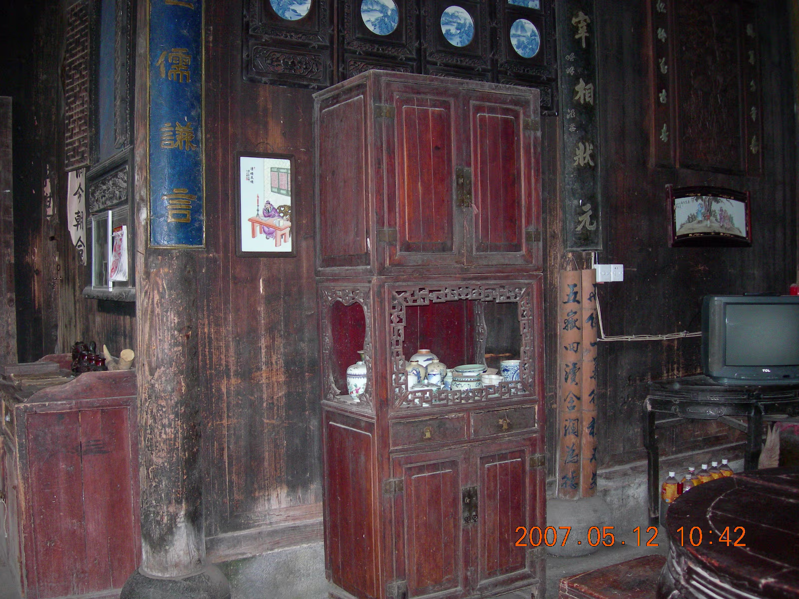 200 year old house living room layout. In olden days, the owner's daughter lived on the 2nd floor. The opening was for her to peek at guys. Old wedding bed. It is 2 meters long. Old kitchen cabinet. Xidi village is famous for wooden carves. An ancient ceiling fan. Two persons held the rope and pulled it to make a breeze. Mom and Dad sat on the chair that belongs to old village officials. Hanhan is in the brides' sedan. Family with the overview of Xidi village. The last contribution gate. In the old days, the local officials got this gate from the emperor when they did good things for their country. Hong village is surrounded by yellow mountain. Nice, quiet place. Hanhan and Mom are listening to the tour guide. A representative of old Anhui buildings. It was on a 1980s postage stamp. A chair where people used to smoke opium. In the silk factory. There are a lot of long, fat silkworms. A silk spinning machine. Separating twin silkworm cocoons. Old ladies are making silk blankets. My mom bought one. The next day is mother's day. I bought an amber bracelet for my mom. Today is father's birthday. We went to a special yellow mountain restaurant to celebrate. Labels Taekwondo