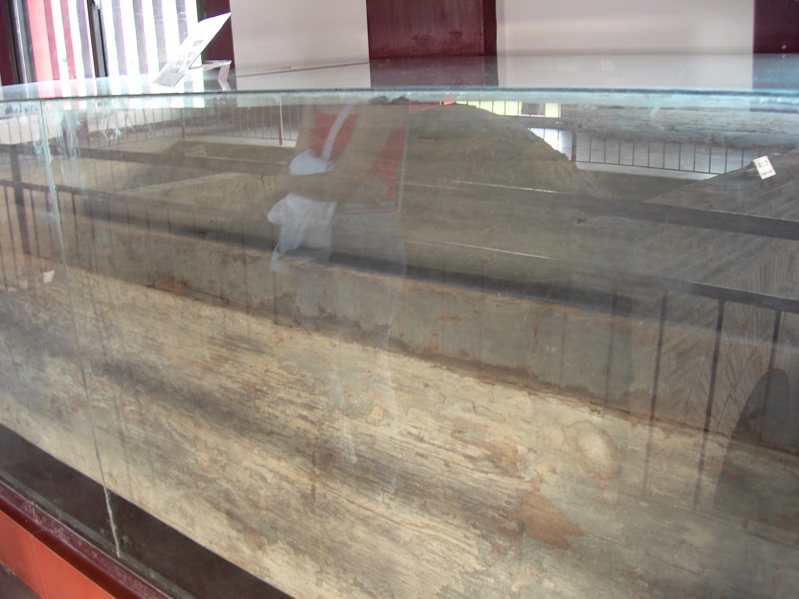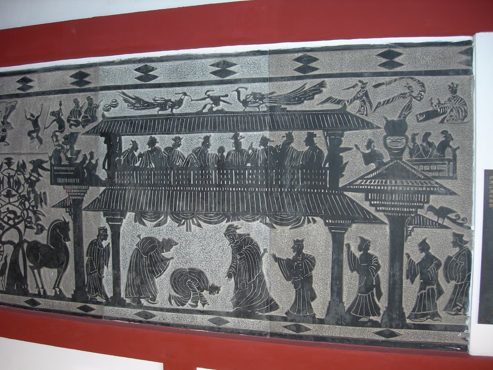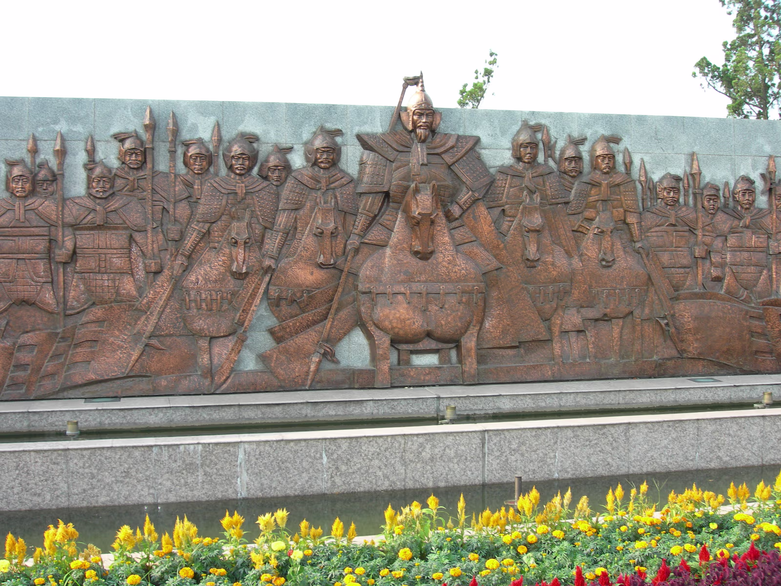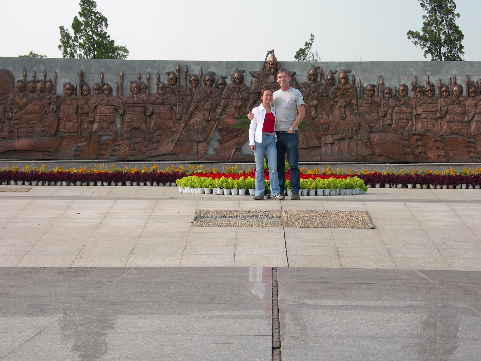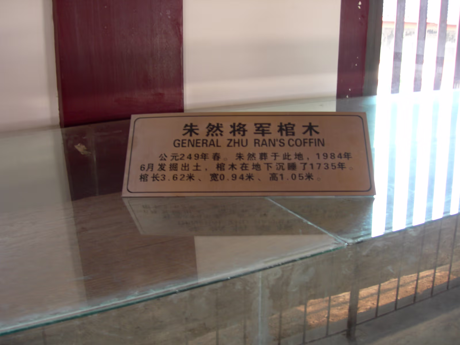 In front of the relief showing Zhu Ran's victories. Hanhan and a 'lucky' mascot. Chinese old coin and modern miser. The perforated stone thing is an incense burner. Hanhan and the map of China during the three Kingdoms period. The bronze pot is also called a wine cup. Panel 1 of 4 Panel 2 of 4 Panel 3 of 4 Panel 4 of 4 The General, Zhu Ran. At the museum of Zhu Ran artifacts. Going inside. View back towards the park from the museum grounds. Zhu Ran's coffin. This site is his actual burial ground. The writing explains when it was found and its age, 1735 years old! Zhu Ran giving respect to his teacher. Practice makes perfect. And Zhu Ran was going to be perfect. Zhu Ran becomes an officer at 19. Zhu Ran returning from a victory. Labels Friend's Visit