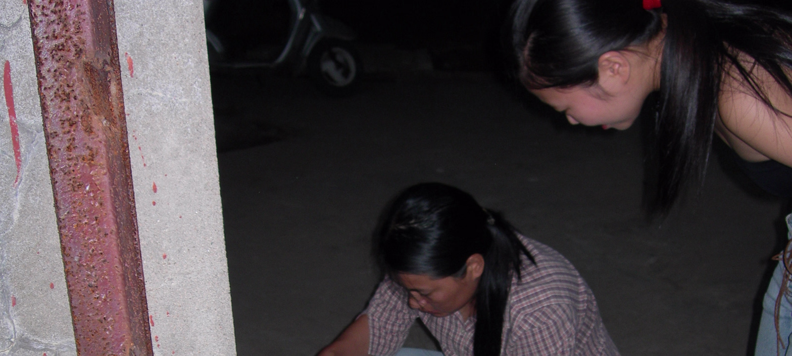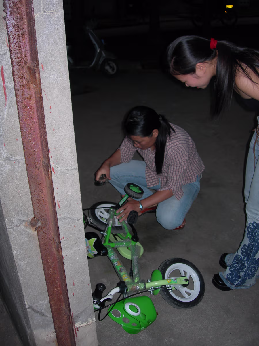 National_Day_2005-001 Xiaohua repairing Ben's trike outdies the beer patio.
