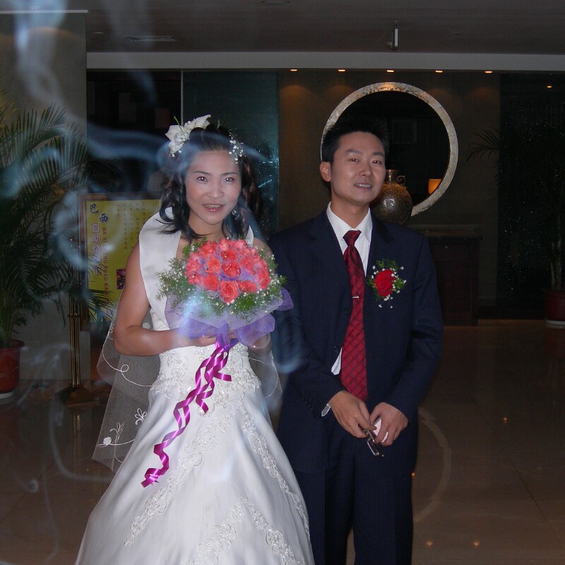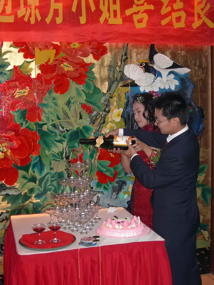 Mr and Mrs Xu arrive to the hotel where the wedding dinner will be held.Hanhan with all the beverages, the baiju is her favorite.An overview of a few tables at the dinner. Well stocked with food, drink, and smokes.Now the couple has changed clothes and are entering the dining room. On stage with the wedding announcer.Chinese couples have to perform for the guests, Rammy is a good actor.The couple bow to each other to show their respect. Pouring champagne for everyone.Rammy has to balance a spoon on a chopstick, fill it with wine, then hold the spoon in his teeth to drink.The little girl doesn't think he can do it. Putang MemorialSnow 2006