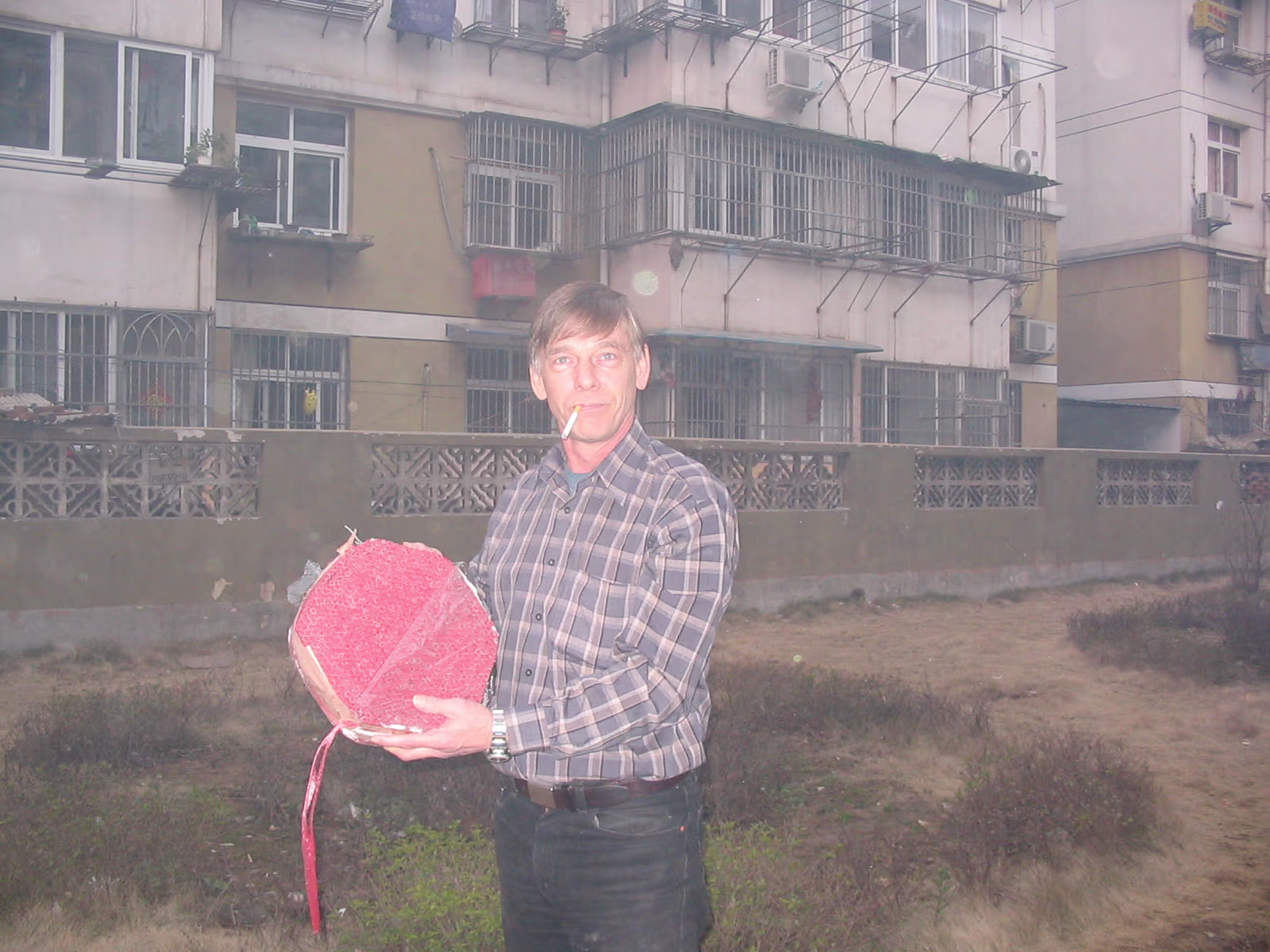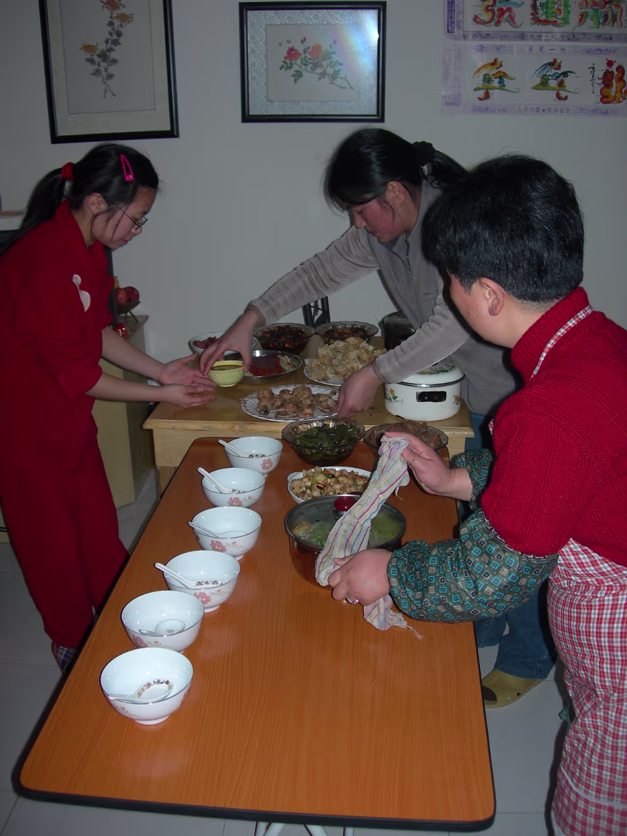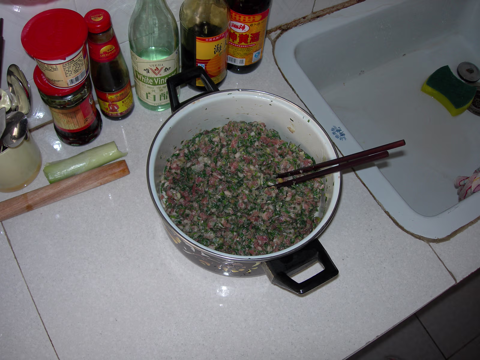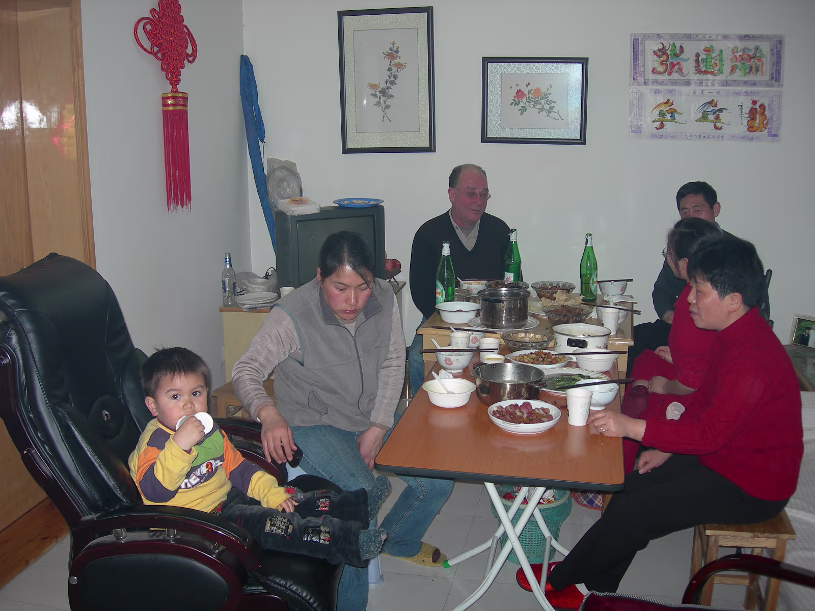The filling for dumplings. Meat and dandelion greens. Final mixing of the filling. Families always make the dumplings together, we're no different. How to seal a dumpling and make it pretty. Dad is the rolling expert, very fast. Hanhan's first dumpling! How does it look? The dinner fireworks. There are 10,000 in this roll. The fuse is lit! 10,000 firecrackers - 3 seconds The debris is 4 stories high! Tada! Looking for duds. All clear. Setting the table for the big dinner to come. Xiaohua's dishes begin to arrive. Everybody pitches in. Mom's dishes add to the dinner. Even more food to complete the feast, there are more than 30 dishes to sample! Enjoy! Even Ben is doing his part! Yum! There is simply TOO much to eat, but we try. Labels Snow 2006Teaching Photo Albums