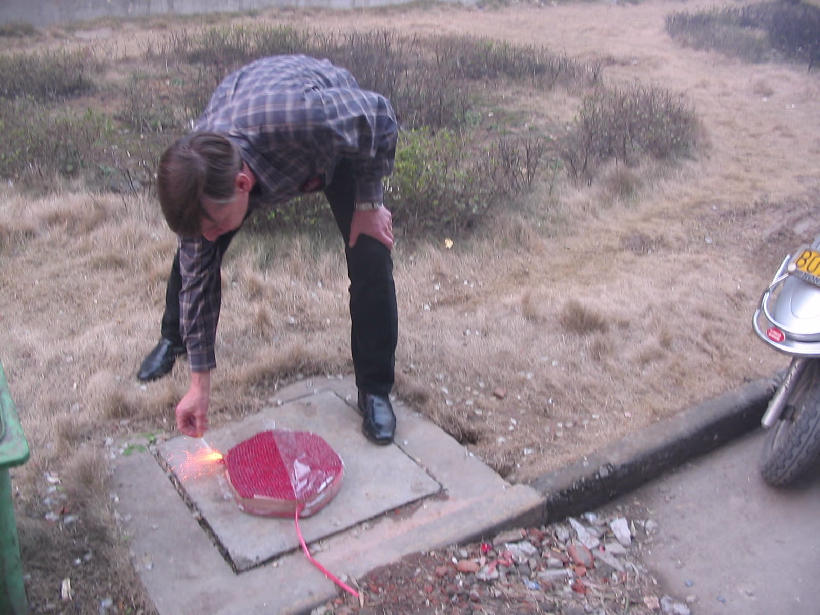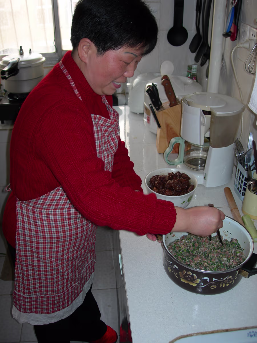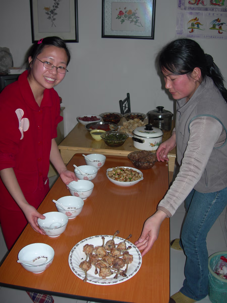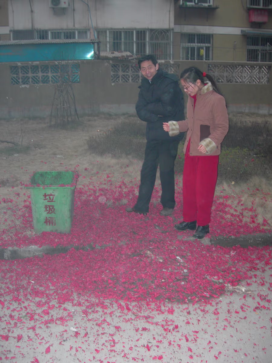 The filling for dumplings. Meat and dandelion greens. Final mixing of the filling. Families always make the dumplings together, we're no different. How to seal a dumpling and make it pretty. Dad is the rolling expert, very fast. Hanhan's first dumpling! How does it look? The dinner fireworks. There are 10,000 in this roll. The fuse is lit! 10,000 firecrackers - 3 seconds The debris is 4 stories high! Tada! Looking for duds. All clear. Setting the table for the big dinner to come. Xiaohua's dishes begin to arrive. Everybody pitches in. Mom's dishes add to the dinner. Even more food to complete the feast, there are more than 30 dishes to sample! Enjoy! Even Ben is doing his part! Yum! There is simply TOO much to eat, but we try. Labels Snow 2006Teaching Photo Albums