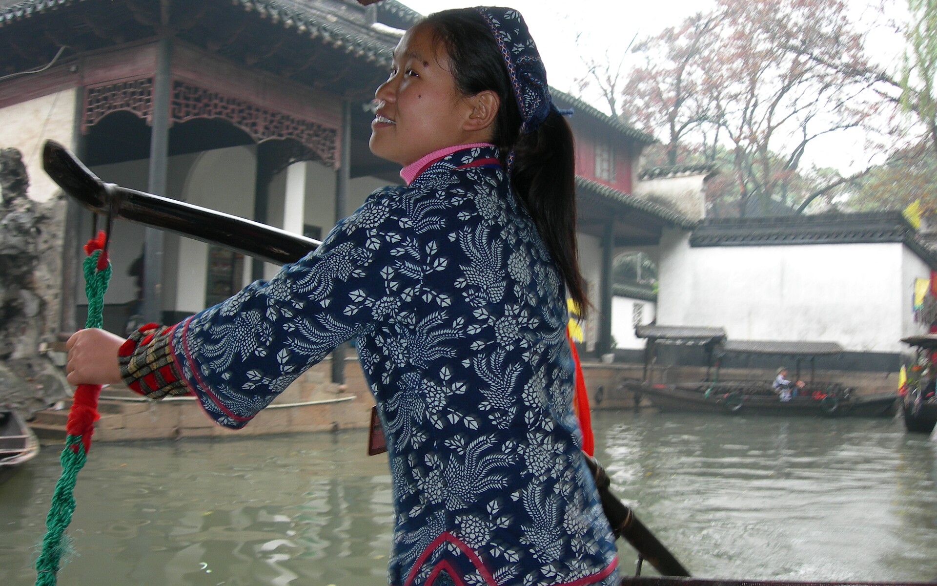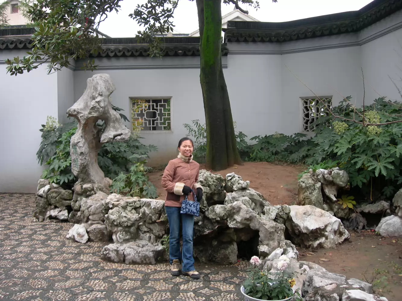 A gate presented by the Emperor to honor the Zhang Family.This gate was presented by the last Emperor, Pu Yi.The female compound of the Zhang family looks over a nice pond.The library which contains 1500 year old books. Quite rare. Hand carved wooden printing plates for one of the books in the library.Sign means that the Emperor hopes the family can be prosperous.A scene along one of the canals we toured. Lady is washing her clothes.Another view of canals in Nanxun, an ancient town in Zhejiang Province. The blue banner is an ad for the local wine.Notice that part of the buildings are built over the water.A 50 year old ad for cosmetics.Anhui style brick carvings adorn this gate. Where guests were greeted. The characters show that the family is cultured.The lions on the chairs show that the mother was the most respected member of the family.A carved panel that tells part of the story of how girls were introduced to their husbands.The matchmaker has signaled a man that the coast is clear to come into the girl's room. The exterior of the family's French style ballroom. All imported from France.A Pagoda behind the canal tour boats.Our boat girl. She is using a 'Nu' that both steers and propels the boat.Just the locals watching tourists float past. A temple guarded by two lions. The one on the left is Female because she has a baby.A giant calligraphy brush. This area is famous for calligraphy brushes.This bridge was damaged by the Japanese during the occupation, they couldn't destroy it though.A scene from our canal tour. Very nice and peaceful. One of the old houses along the way. All setup for a water born lifestyle.Where dishes would be washed, food cleaned, etc.A local policeman drove down to wash some things out.The view from our hotel room in an old wealthy family's compound. Another view from our room.A Chinese fairy who rides a 3-legged locust. His presence brings lots of money.Hanhan in the hotel garden.This is the entry to the Yan family compound in Mudu, Suzhou. This the room where guests were met. The seating was done by the 'rank' of the guests.Hanhan in front of a 200 year old magnolia tree, planted by Emperor Qian Long.The pattern on the walk symbolizes money because it looks like the coin of the period.One of the gardens, the owner had a garden for each season. This is the Spring garden. In the reading room, richly decorated.Gary and Hanhan on the other side of the reading room panel. This is for resting after long studies or writing.An excellent example of Tai Hu stone. It is narrow and has many passages and holes throughout.The Summer garden. The Autumn garden. The stone used is yellow to match the leaves of autumn.This area only used one day, Mid-Autumn Festival. The owner would look at the moon's reflection in the water.The Late Autumn garden. Part of the celebration of late autumn is climbing and the stone here reminds you of that.The Winter garden. The roof line is higher here to block the cold north winds. The backyard of the compound. All the walks have different patterns, no two alike.Another view of the backyard.A bridal sedan, it is all carved and painted wood. Very heavy. The baby on top is to ensure a child will be on the way soon.At a middle class person's home. A famous silk embroiderer is based here now. A small pagoda inside this compound.These doors frame a garden scene, like the tapestries in the gallery.Live local opera. The story is about a wrongly accused woman and her death which brought 3 inches of snow in June showing her innocence.A root carved into a bird. The best preserved example of the woodworking skills in this area. Around 150 years old.One of the silk embroideries. This is amazing, it looks just like a picture. One of many in this gallery. A carved stone panel showing ordinary life in the Suzhou area 150 years ago.Hanhan in front of a philosopher's house.Hanhan on top of Tian Ping mountain.Hanhan and the Tian Ping stone. The characters mean "Trace the Emperor's footsteps." Beijing 2002Qingdao 2002