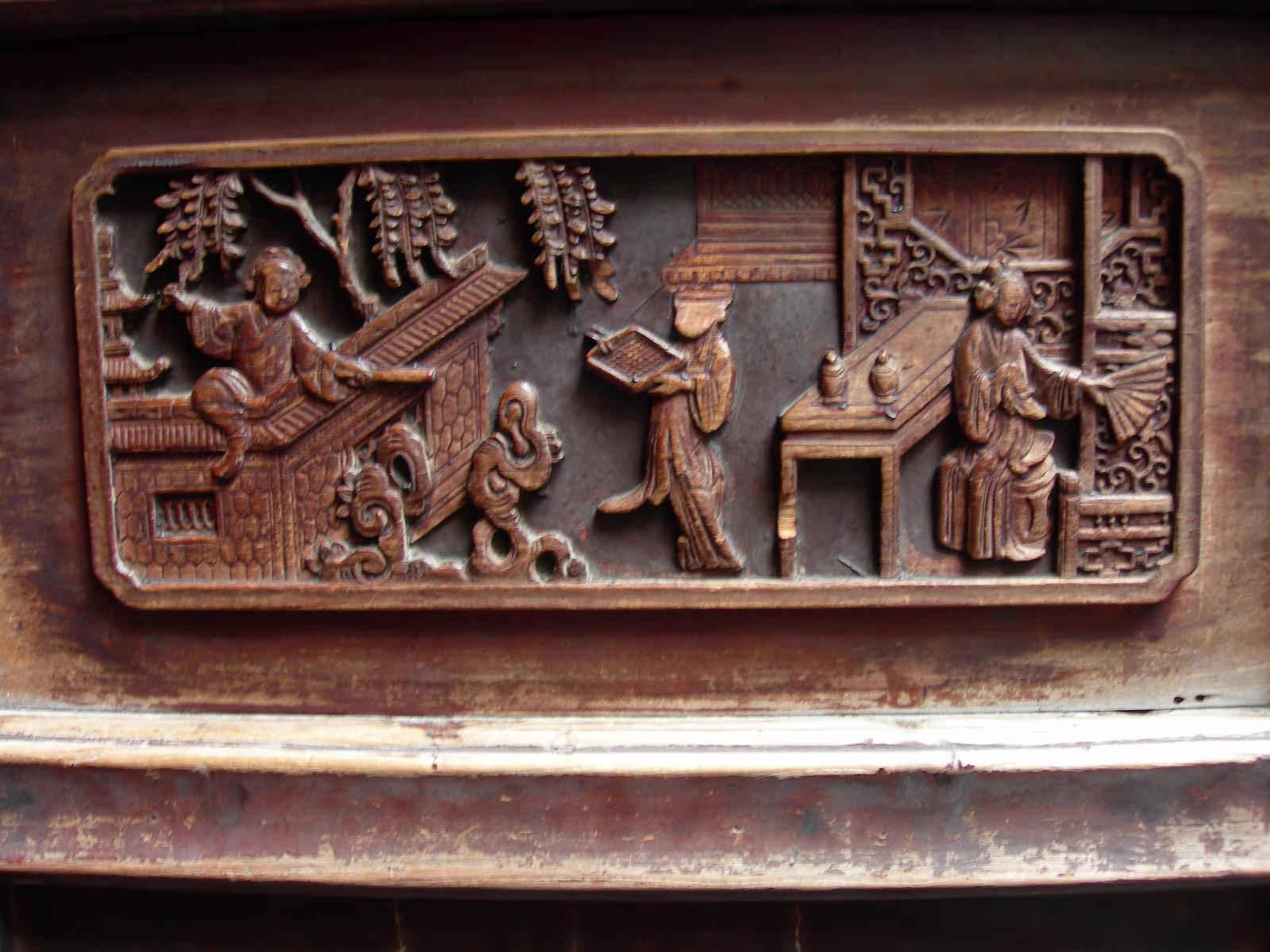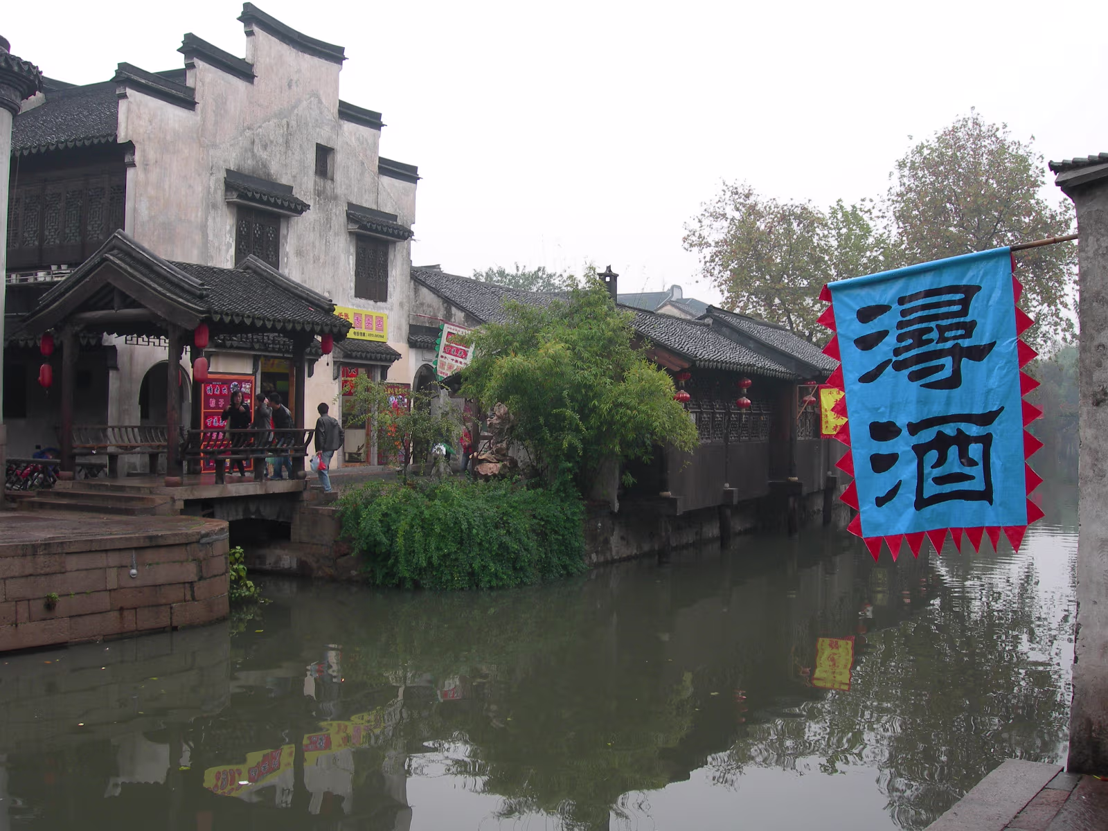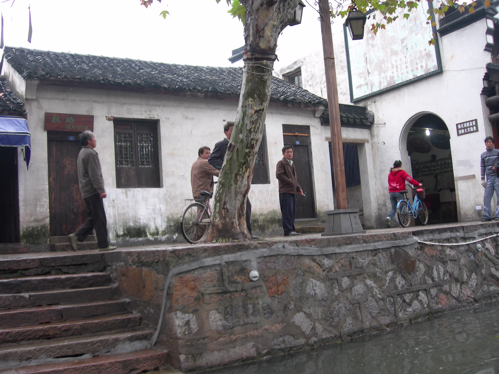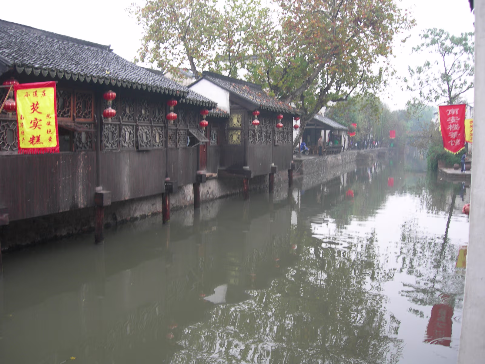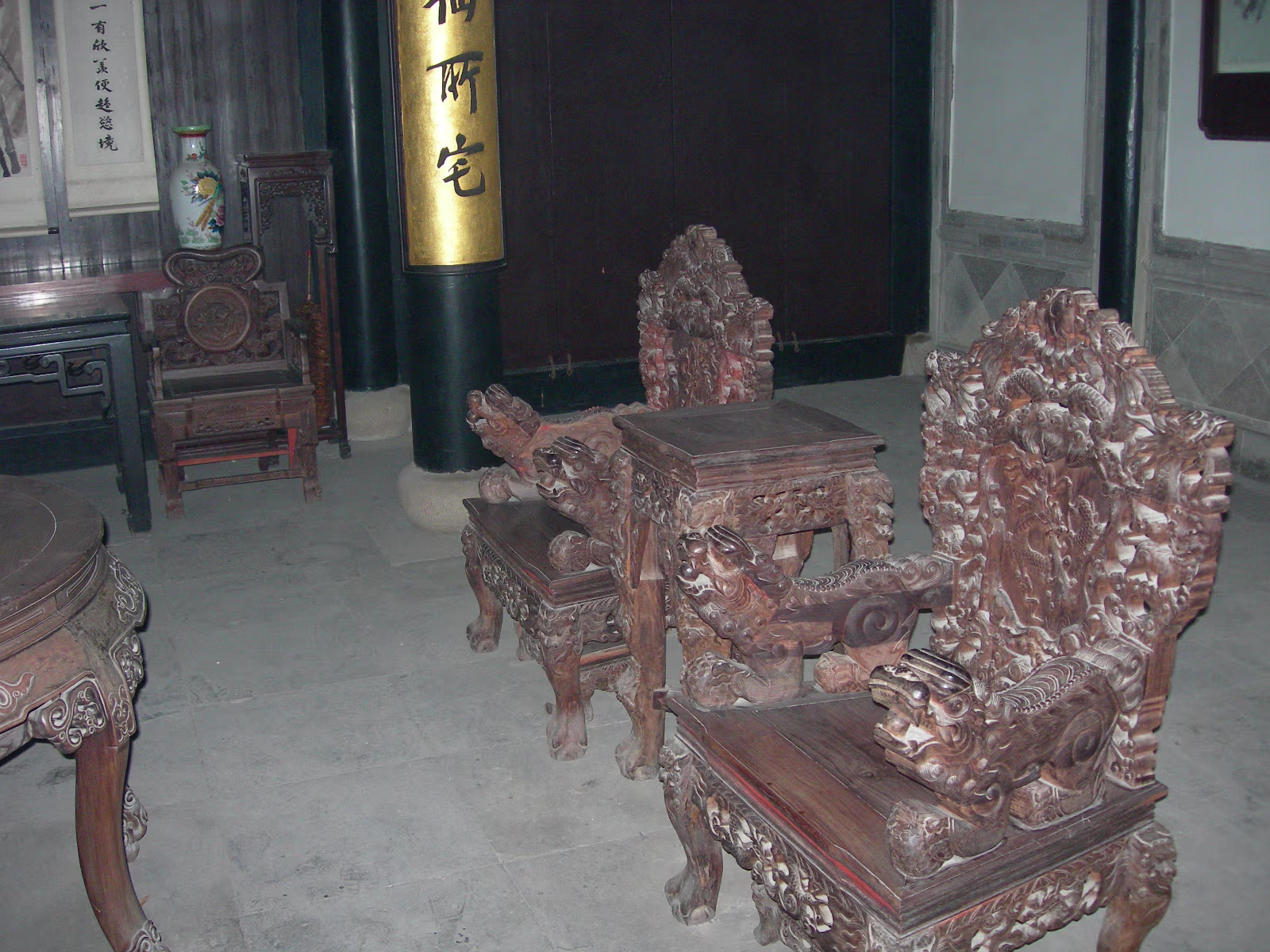 A gate presented by the Emperor to honor the Zhang Family. This gate was presented by the last Emperor, Pu Yi. The female compound of the Zhang family looks over a nice pond. The library which contains 1500 year old books. Quite rare. Hand carved wooden printing plates for one of the books in the library. Sign means that the Emperor hopes the family can be prosperous. A scene along one of the canals we toured. Lady is washing her clothes. Another view of canals in Nanxun, an ancient town in Zhejiang Province. The blue banner is an ad for the local wine. Notice that part of the buildings are built over the water. A 50 year old ad for cosmetics. Anhui style brick carvings adorn this gate. Where guests were greeted. The characters show that the family is cultured. The lions on the chairs show that the mother was the most respected member of the family. A carved panel that tells part of the story of how girls were introduced to their husbands. The matchmaker has signaled a man that the coast is clear to come into the girl's room. The exterior of the family's French style ballroom. All imported from France. A Pagoda behind the canal tour boats. Our boat girl. She is using a 'Nu' that both steers and propels the boat. Just the locals watching tourists float past. Labels Beijing 2002Qingdao 2002