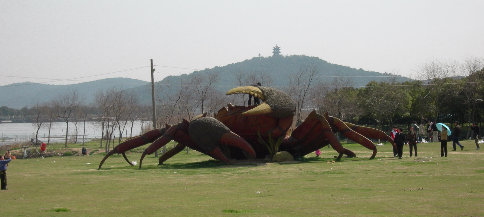 The crabs grow big here. Really! Barges carrying sand and gravel up a river are a common sight. Hanhan enjoying a beautiful spring day. Looking out across Li Lake. A fountain in the lake with a swimming beach in the background. Labels Places I've LivedLing Shan Buddha Site