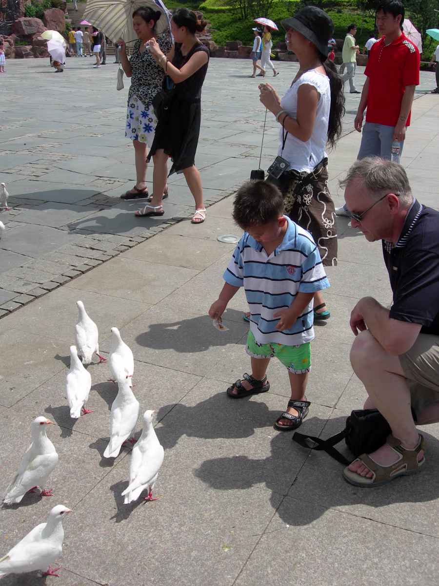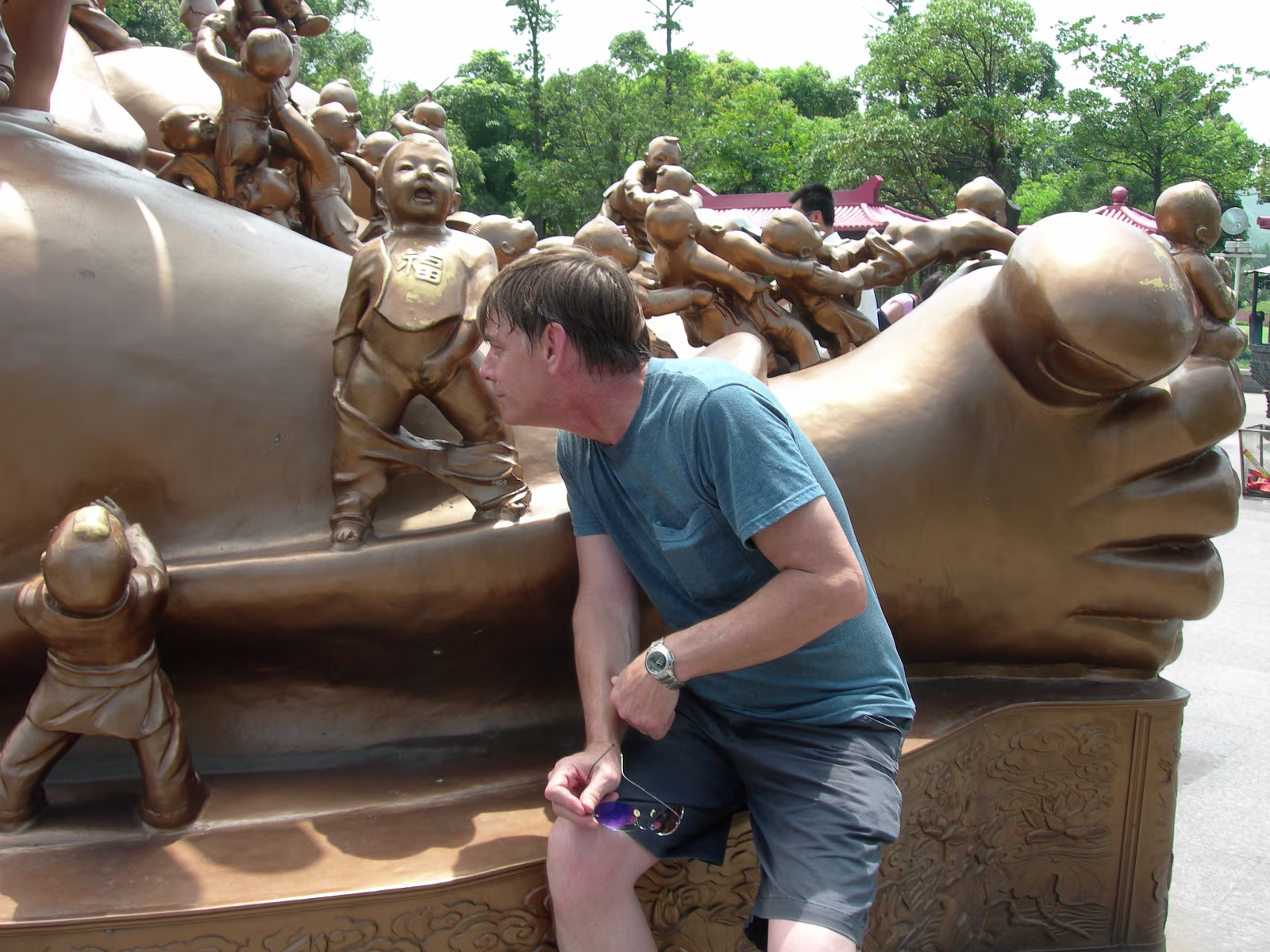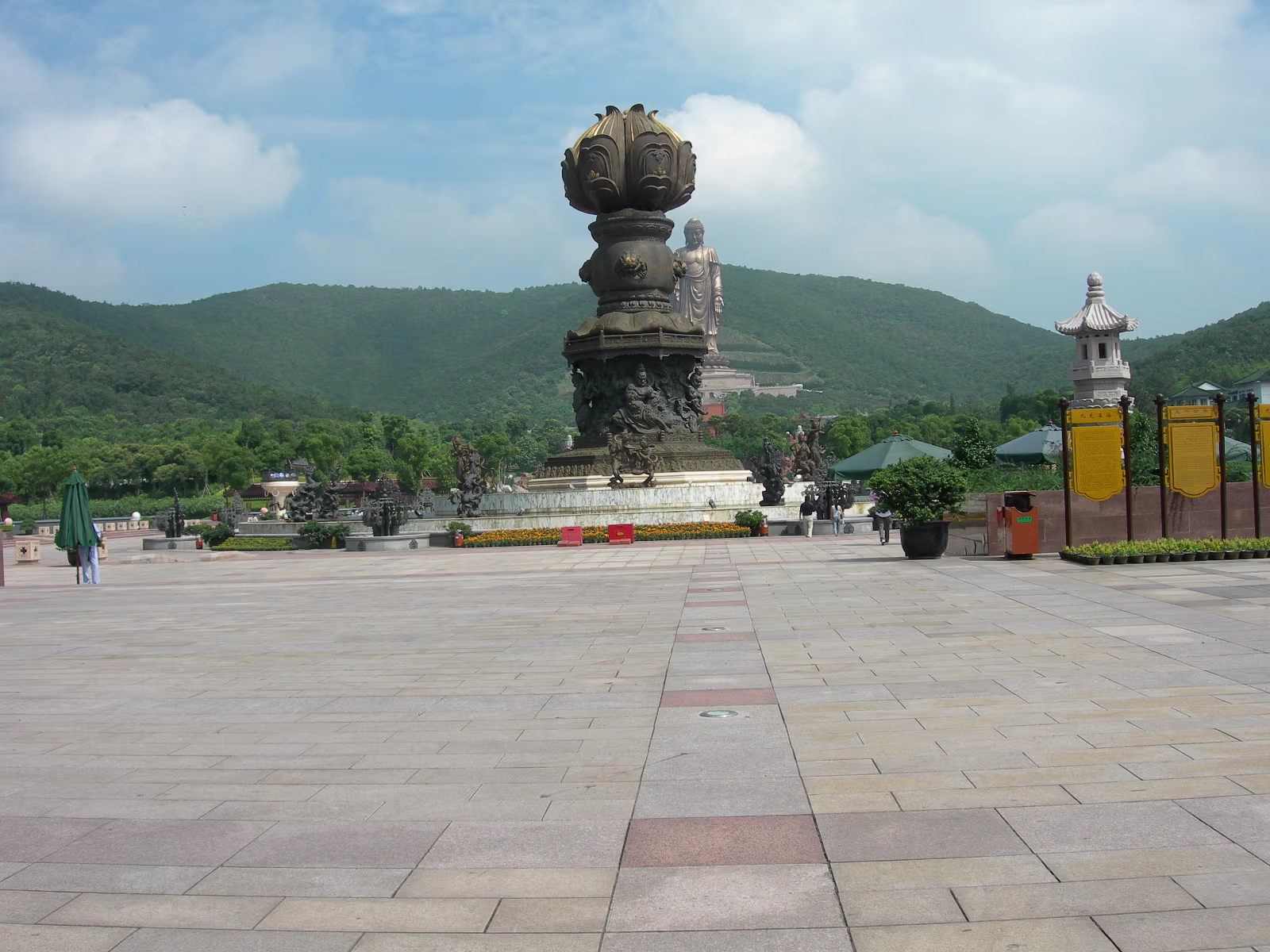 Heading into the park. The characters mean 'Tai Lake water can clean your mind' A Panoramic view of the copper fresco. Bridge to Buddha's Paradise Gate to the 2nd level of Paradise A baby Buddha is in the lotus. Hanhan and one of 108 prayer wheels. The lotus blossom open and Baby Buddha is born! The baby rotates to bless everyone. The water cleanses Buddha. Cleaning is over. Another performance in 2 hours. Ben & the 'magic' pigeons. They can tell your future. Hanhan in front of a copper fresco of the life of Buddha. Hanhan the blasphemer! No touching the copper breasts!!! Buddhist rules, much like the 10 Commandments. The column commemorates Buddha's birth. Gate to the 3rd level of Paradise. One of the big Buddha's Hands, rub it for luck! An extra kid has been added. Its VERY small, hope Buddha answers your prayers buddy. Labels Li Hu (Li Lake)Mei Yuan Park