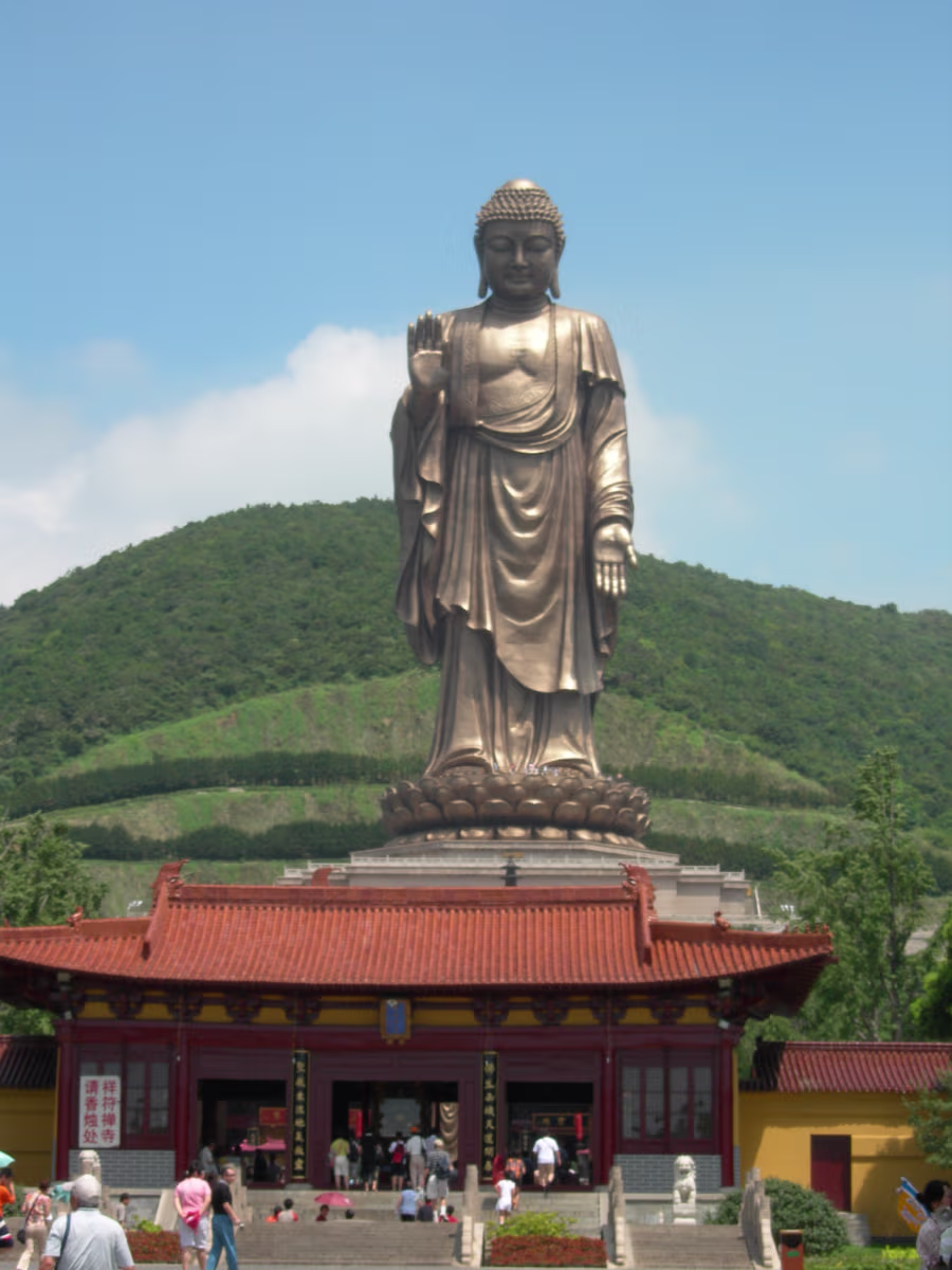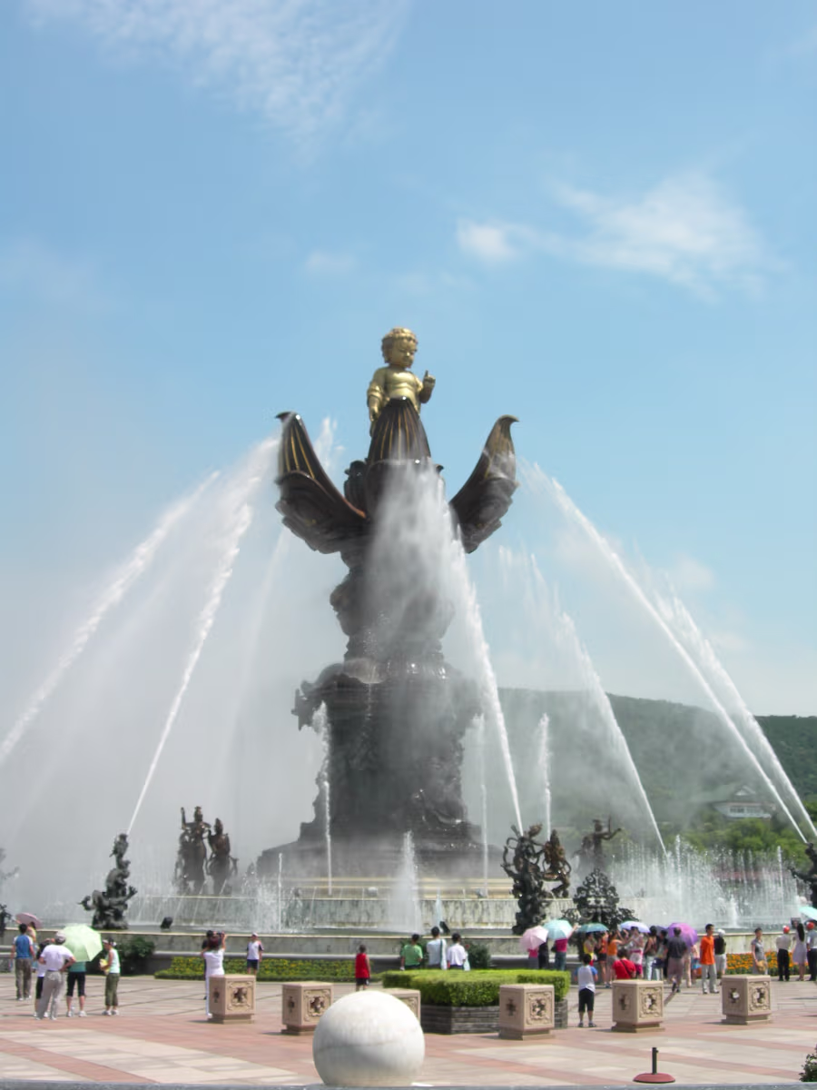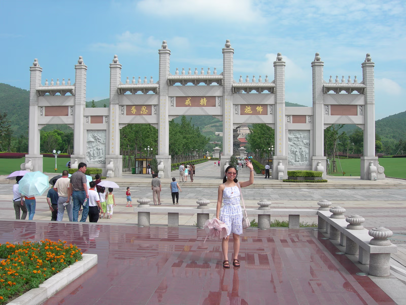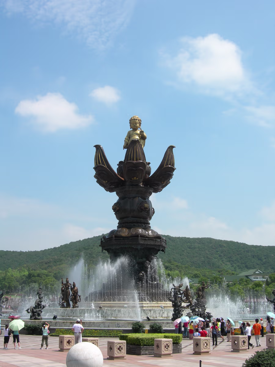 Heading into the park. The characters mean 'Tai Lake water can clean your mind' A Panoramic view of the copper fresco. Bridge to Buddha's Paradise Gate to the 2nd level of Paradise A baby Buddha is in the lotus. Hanhan and one of 108 prayer wheels. The lotus blossom open and Baby Buddha is born! The baby rotates to bless everyone. The water cleanses Buddha. Cleaning is over. Another performance in 2 hours. Ben & the 'magic' pigeons. They can tell your future. Hanhan in front of a copper fresco of the life of Buddha. Hanhan the blasphemer! No touching the copper breasts!!! Buddhist rules, much like the 10 Commandments. The column commemorates Buddha's birth. Gate to the 3rd level of Paradise. One of the big Buddha's Hands, rub it for luck! An extra kid has been added. Its VERY small, hope Buddha answers your prayers buddy. Labels Li Hu (Li Lake)Mei Yuan Park
