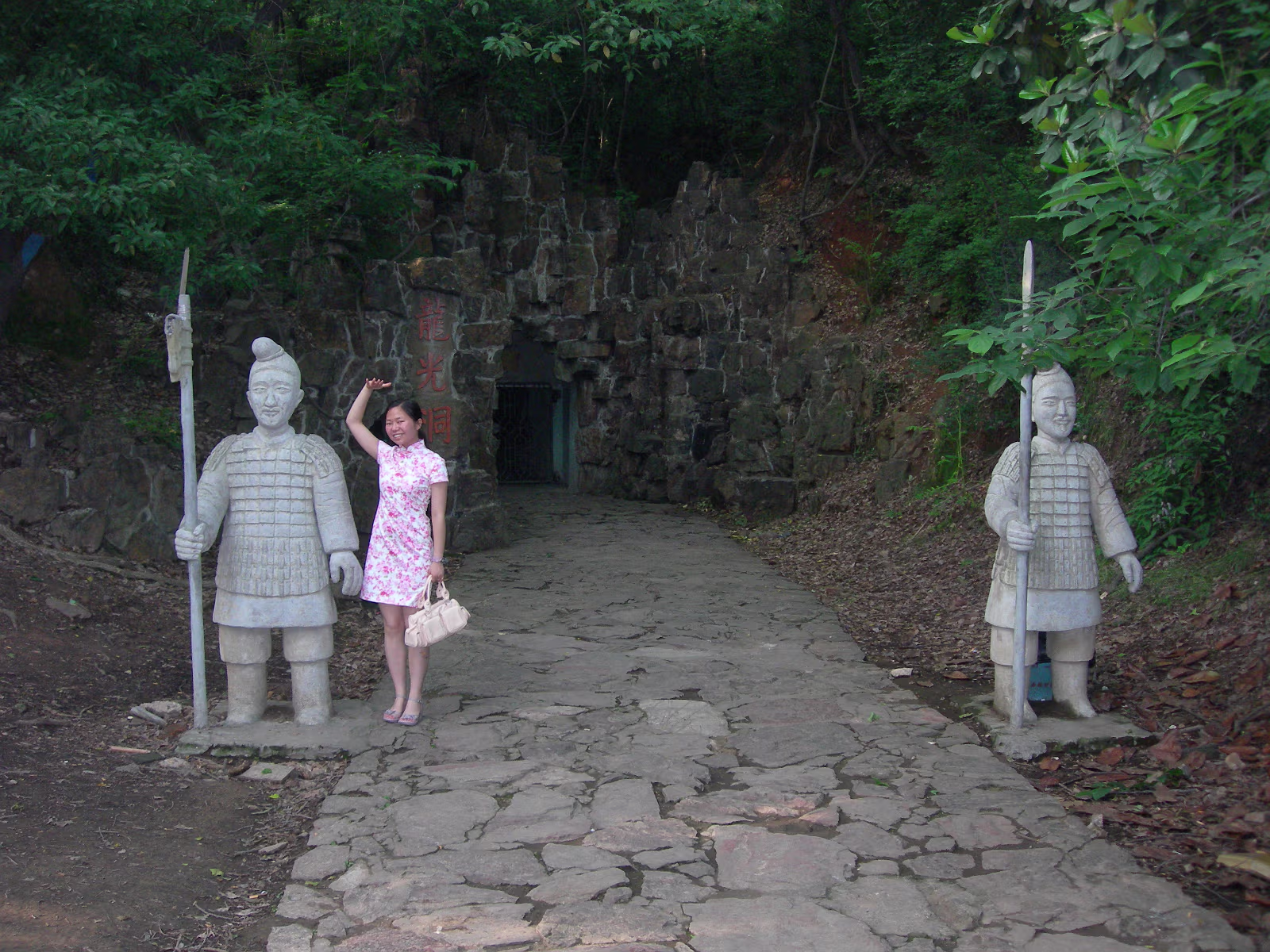 Hanhan in the Nine Dragon Plaza. The Nine Dragon fresco. This boy and girl will bring luck to lovers. A panda eating its bamboo. Sorry but the windows are filthy! A poor, bored tiger. Hanhan measuring the guards in front of the dragon's cave. One of the two springs where a famous Chinese song "Two springs Reflect the Moon" was written. The figures around the door are the famous Wuxi figurines. They are made from the clay found locally. The characters say "Temple for Obedient Children" Meant for adult children. This another of the two springs in the song. Labels Turtle Head Island