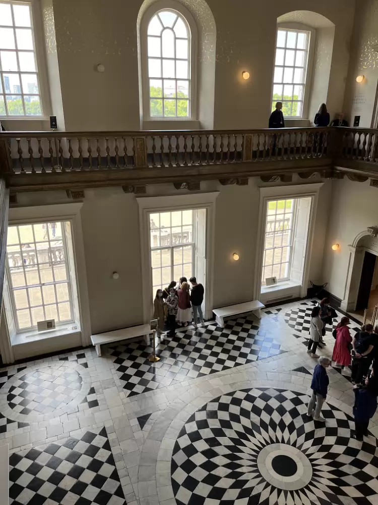 Looking back at the Royal Naval College and Chapel after crossing the Thames via foot tunnel.