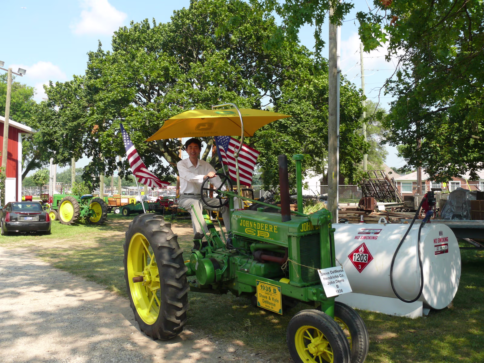Hanhan's dad on a 1935 John Deer. Hanhan in front of an old steam tractor. They don't build them like that anymore. This area is an old farm. Everything run by steam. Farming used to be very dangerous with equipment like this. Hanhan and her mom laugh at Johnny Appleseed's jokes. Hanhan's dad with huge farm machinery. Hanhan and her dad. Hanhan's dad prepares to be a construction worker. Hanhan looks right at home on her tractor. A shot down the midway, we love the food! Mom with an acrobat from the Peking Acrobats. The oldest farm machine in Indiana. A float for the parade. The blacksmith shop. A Rube Goldberg farm machine. Checking out the dairy cows. Where does it give ice cream? Hanhan found the chocolate milk! Huge oxen, they each weigh 2 tons! Old tractor. Labels Carmel MoveA Day in Indianapolis