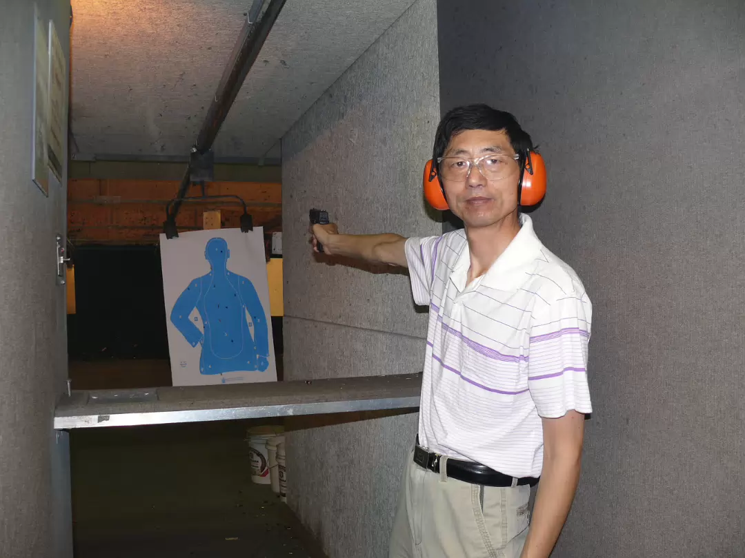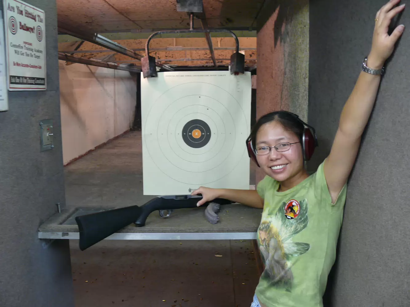 Hanhan's dad is pretty acurate.Giving shooting advice to Hanhan.Pretty happy with her first shooting results.Hanhan's mom did well too. Her dad in action.Taking aim.Good shooting.Happy Hanhan after shooting. Parents are getting the hang of this.He wanted to fire a pistol, 9mm looked good.No, no. Look the other way.This about knocked her mom down. Hanhan was pretty good with the 9.Right between the eyes.He used a whole box of shells in about 15 minutes.The picture says 'Gun salesman of the month'. This was a nice gunshop.Pistols are expensive. More pics in the gun case. Says 'This empty space brought to you by your President'.First shot is coming up.Hanhan and scared mom after mom's first round.Much happier now. Indianapolis 500Indianapolis Zoo