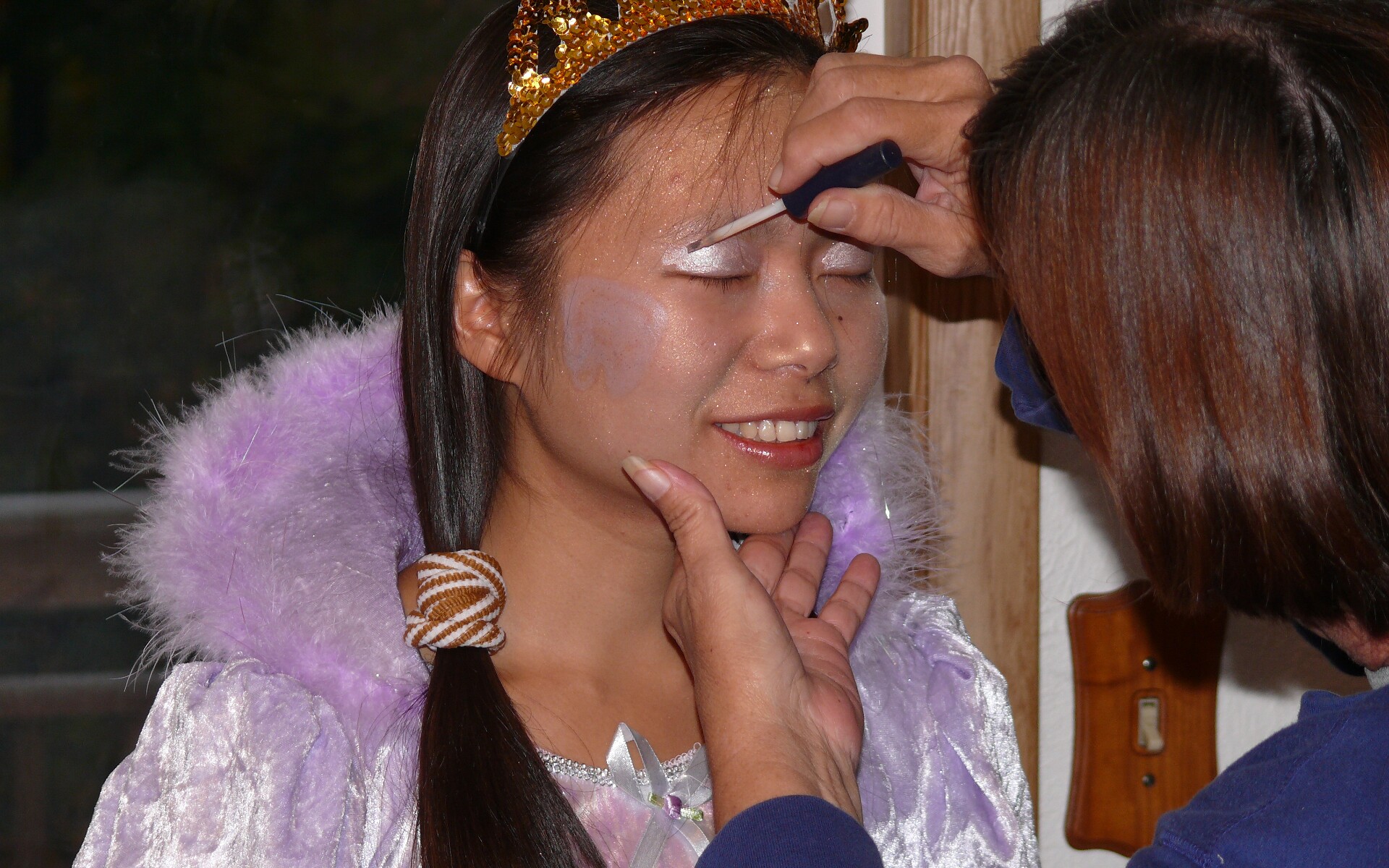 Hanhan having her makeup applied by Linda.The Tooth Fairy is ready!Tooth Fairy and Jack o' LanternsA dinosaur, senorita, and tooth fairy. A midnight princess and the tooth fairy.Hanhan's first house.Success! Candy in the bag!More trick or treat loot! More candy, more smiles!Trick or treat team heading to another house.Getting the treats!Tina, Brian, and their ladybug. The Halloween float.Decorations on the back of the float.A tired ladybug.Waiting her turn to get a treat. A hotdog looks at the tooth fairy.Three scary jack o' lanterns.Boo! Did it scare you?Ladybug dragging her bag of candy towards another house. Everyone decorates their home like this.Ladybug is ready to go home now.The successful team is heading in to total their take. Back at the base, the family waits for the trick or treaters to return.Cassie and Hanhan eating their goodies.Cassie gives Hanhan a gift.It's a pretty hair band that matches one Cassie has. My FamilyHanhan's Master's Ceremony