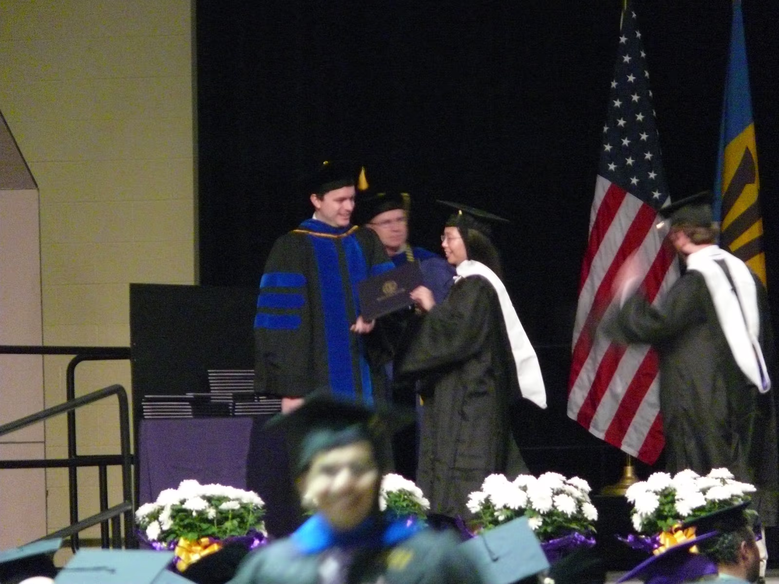 Before ceremony. Class of '09 graduate. Hanhan and 4 others in her group marching to the seats. The Orb of Knowledge carried by the most senior Professor. Speakers, Graduates, and all their flags. Hanhan receives her hood, hers is white for Master of Art. Hanhan receiving her diploma! Sweeeeet! All done, a happy graduate! The Hammer Family wishes Hanhan luck! Gary is very proud of Hanhan. Hanhan is so happy to see her party room. Sharon opens the cake. Hanhan is ready to eat the cake, but we prevail... The cake says "Congratulations on your Masters Hanhan". Indeed! Cake, cake, cake. Cutting the cake, with Cassie anxiously waiting. Hanhan and her cake under the banner. One card that Hanhan liked. Ed & Linda playing with a talking card. This one is Hanhan. Labels Halloween 2007Heart of Illinois Fair 2007