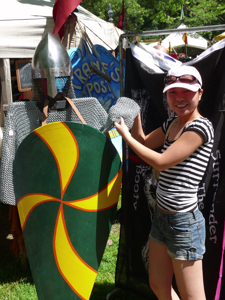 Hanhan checking out some pirate 'booty'. Four knights riding towards a meeting with the King. Colorful knights and their costumed steeds. Pipers leading the King & Queen during the parade to the festival. Men in skirts. The King & Queen with the wizard. English merchant. A knight walking with his squire and his lady. A mid-eastern merchant. A troubadour. A mysterious veiled woman. A knife juggler. Hanhan examining the chain mail. A last look at the chainmail. King and Queen waiting for the start of the tournament of arms. Ladies in waiting and the wizard are always nearby. Broadsword combat. Rapiers require great skill. Looks like a Spanish Conquistador. A melee, every man for himself! Labels July 20142007 Prairie Air Show