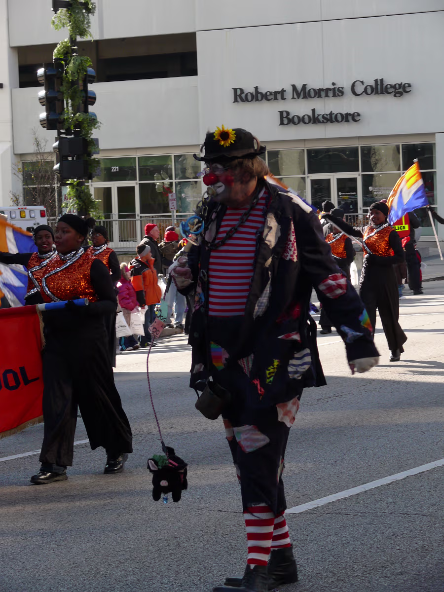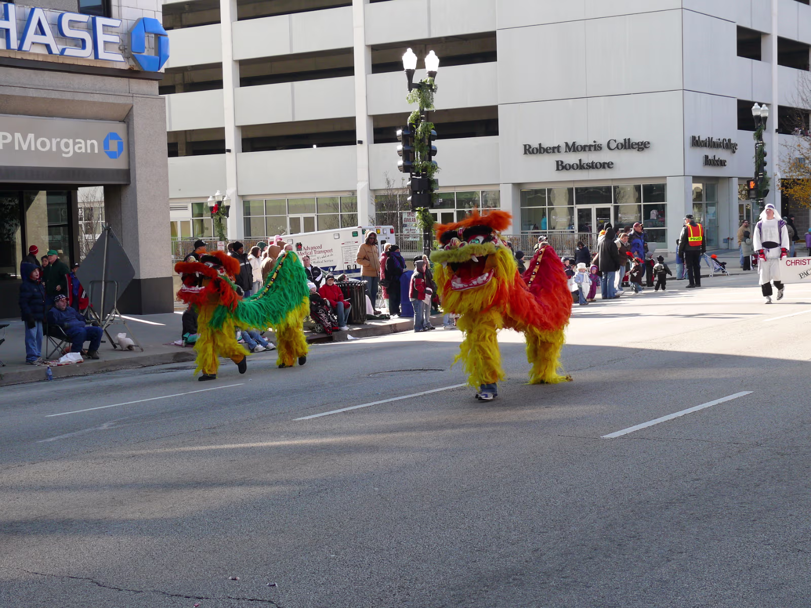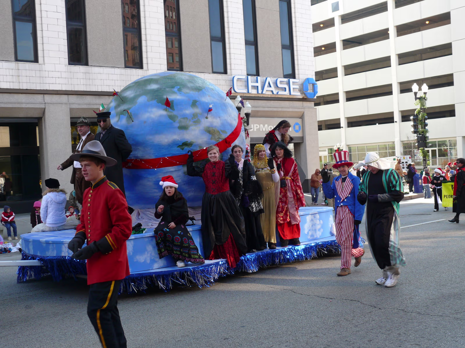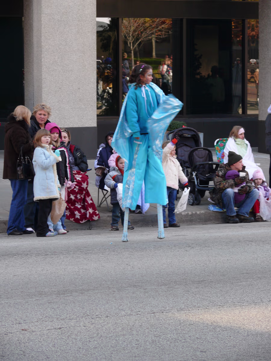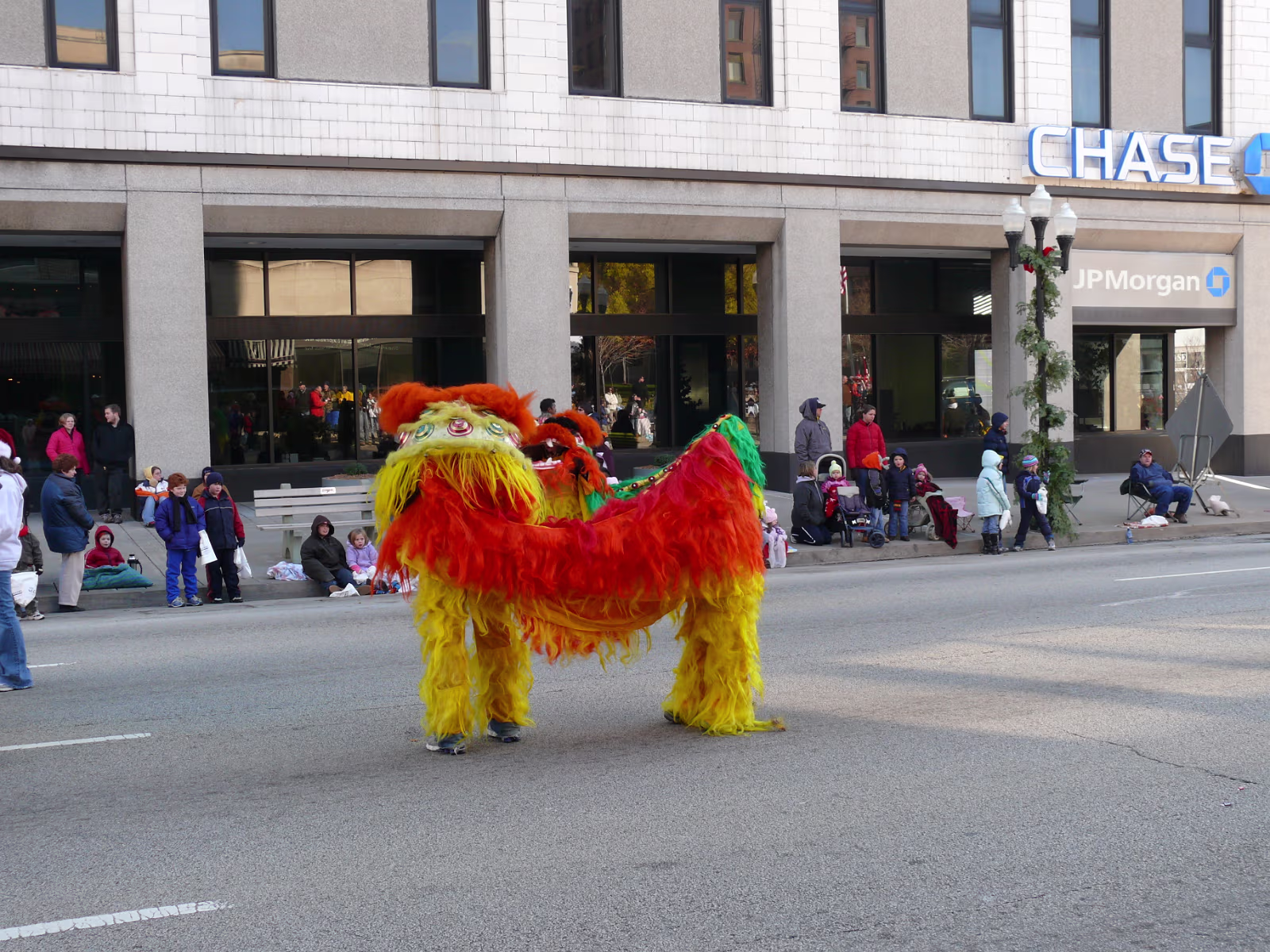 The parade begins! The mounted Color Guard. Navy veterans float. Antique car with Mayor and Congressman. A girl on stilts. Christmas Express Classic car with a 'King' dog in the rear. A parade is not complete without a clown. The Manual High School band. Two Chinese lions. A closeup of one lion. Christmas around the world. The Flintstones Christmas Tree float. Snowman throwing snowballs. Girl Scouts around the world. A dog sled. Note the booties! Cinderella's coach. Two old ladies in their sleigh. Labels Random Illinois PhotosHammer Family Thanksgiving 2007