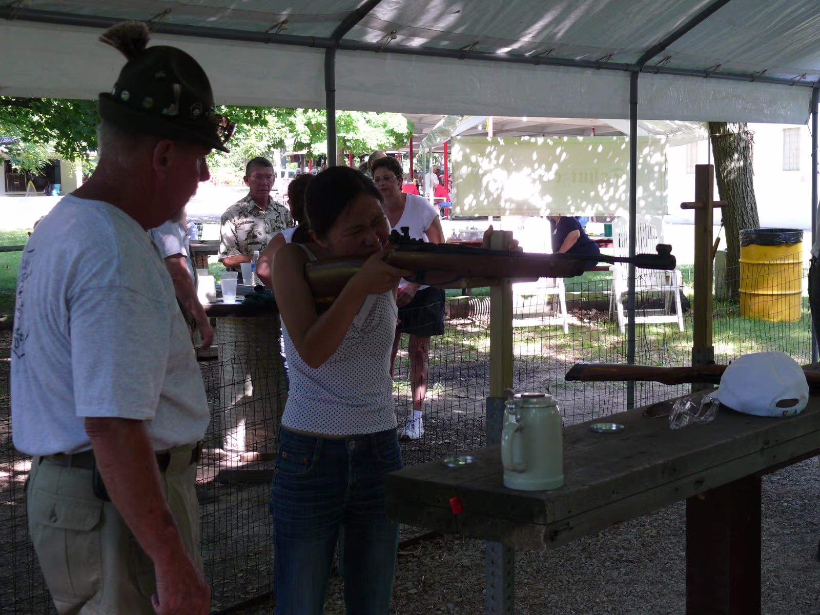 Hanhan enjoying some German food. Bratwurst with sauerkraut and German potato salad. Yum! Hanhan taking careful aim with the pellet rifle. Gary shooting over the top of his beer. Ed and Gary taking a break the German way, with a beer! The food stand, Hanhan's favorite place. Hanhan dancing a polka with a German in traditional costume. The woodcutters, Ed & Gary trying to get through a log. Labels Going to the USA