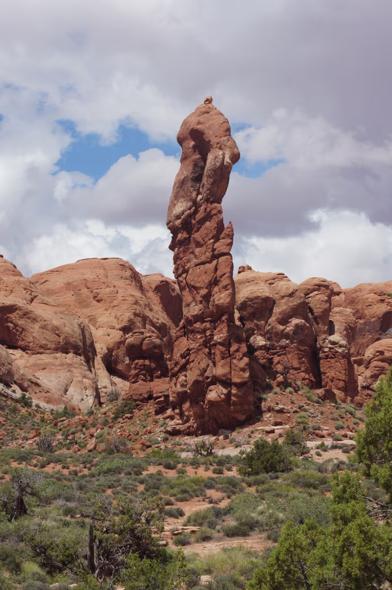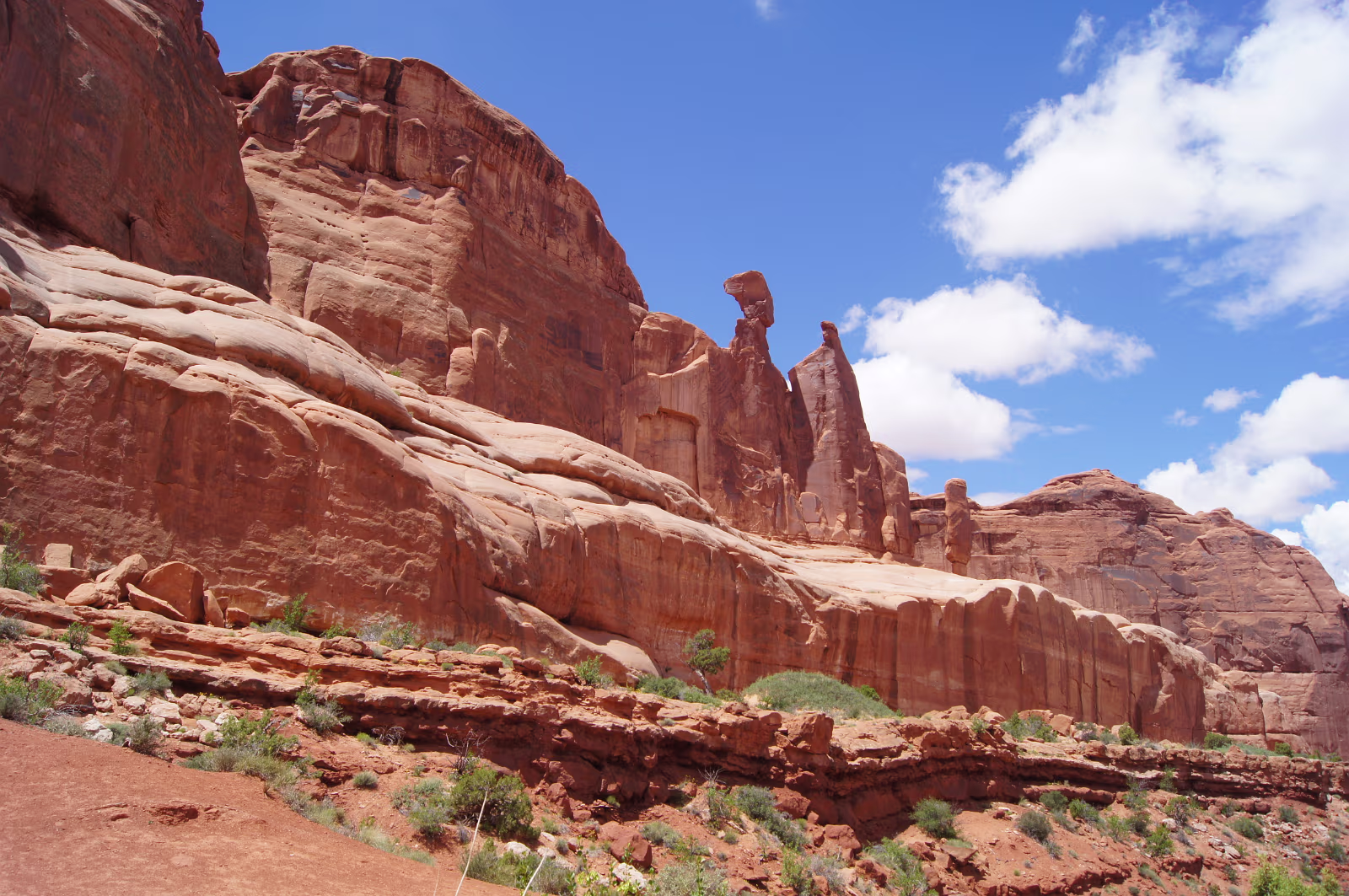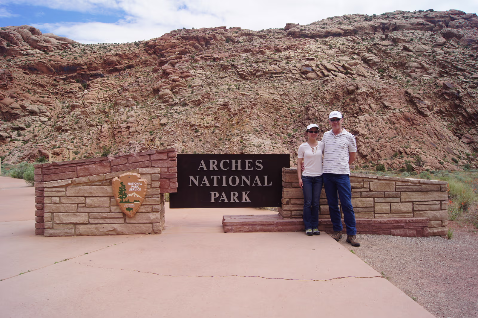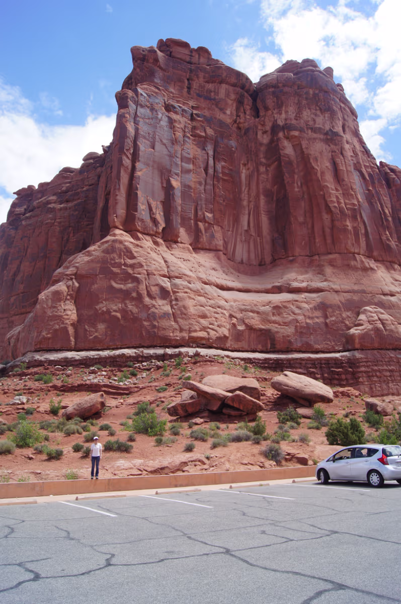 Our 5th park is ready for our inspection! The entire area is red, it's all entrada sandstone. This trail goes between what are called 'fins'.These are harder sandstone that were exposed by erosion to look like a fish fin. The first of many arches we were close to in the park. One day these fins will be arches.For now, they are just pretty. This arch nearly doubled in size when a huge rockfall took place a few years ago. Park Avenue, a favorite view and picture. The entire park is filled with odd, spectacular formations like these. Two buttes appear from nowhere. This is called 'The Three Gossips' Courthouse Towers.Look at the size of this formation. Closeup of the Three Gossips This is supposed to look like a ram (sheep) Another strange yet beautiful formation. This is 'The Windows' area of the park. Balanced Rock.It could fall at any time. One arch is there, the other to its left is just forming.Hanhan has the water to wait until it is done. Not the end of the trail for us! Looking through rock at rocks. This is 'Fins Forest' Labels Mesa Verde NPCanyonlands NP