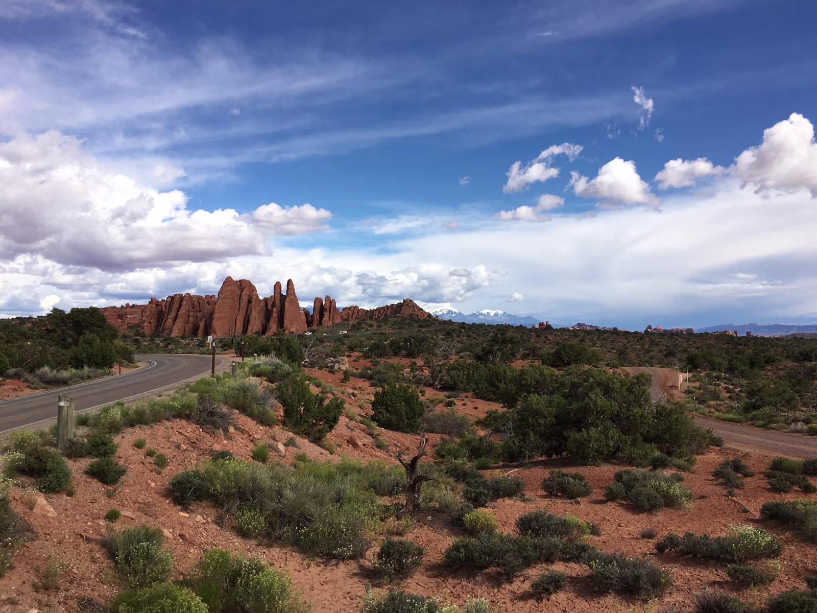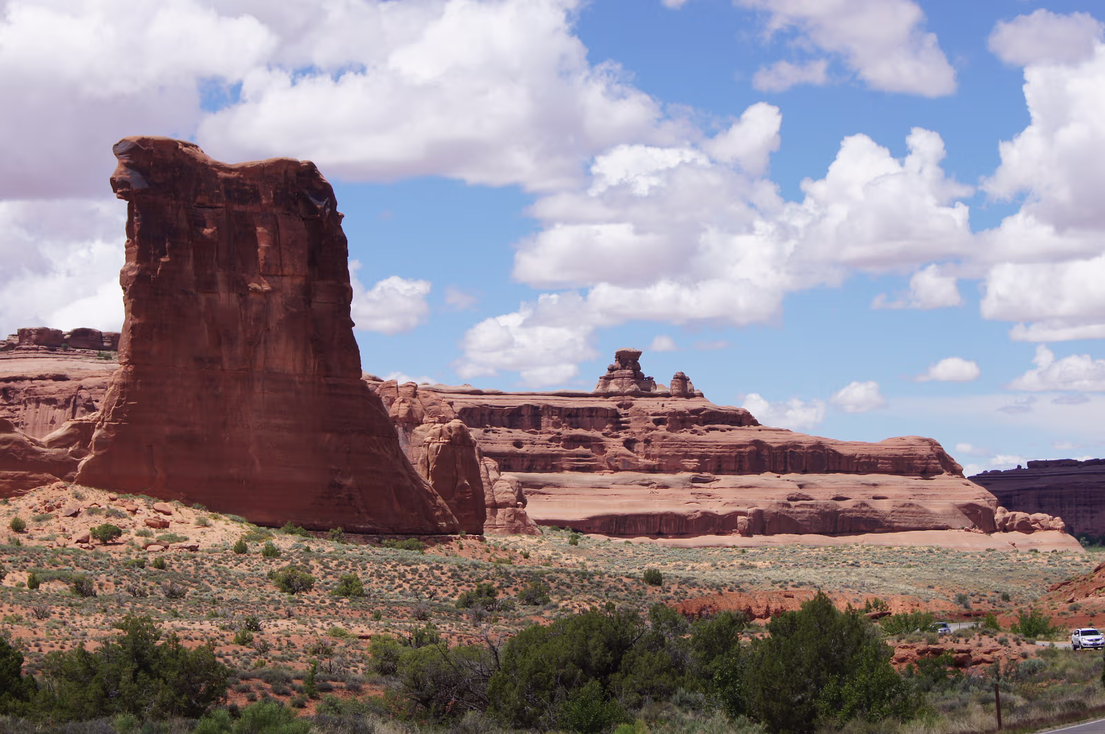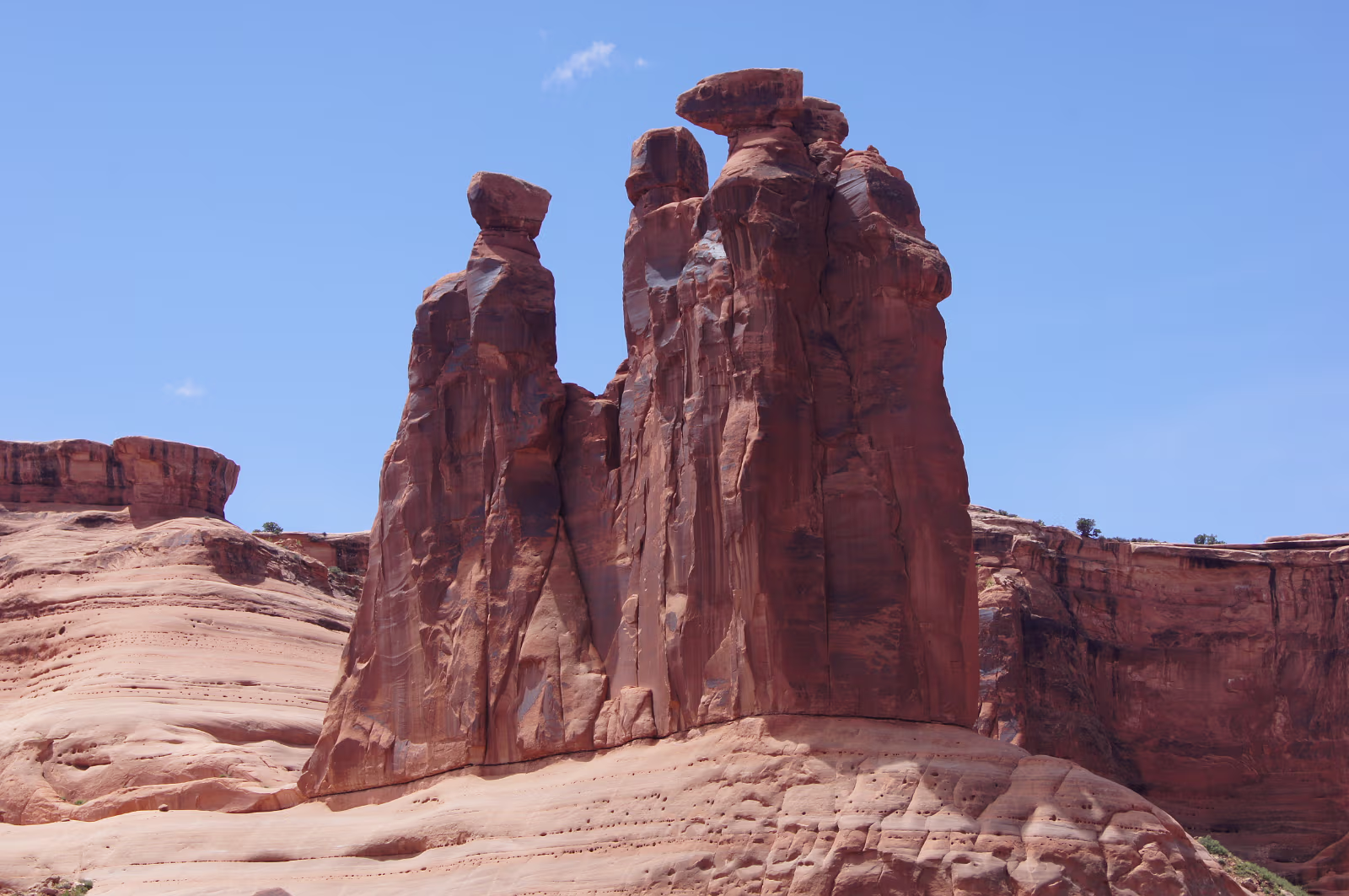 Our 5th park is ready for our inspection! The entire area is red, it's all entrada sandstone. This trail goes between what are called 'fins'.These are harder sandstone that were exposed by erosion to look like a fish fin. The first of many arches we were close to in the park. One day these fins will be arches.For now, they are just pretty. This arch nearly doubled in size when a huge rockfall took place a few years ago. Park Avenue, a favorite view and picture. The entire park is filled with odd, spectacular formations like these. Two buttes appear from nowhere. This is called 'The Three Gossips' Courthouse Towers.Look at the size of this formation. Closeup of the Three Gossips This is supposed to look like a ram (sheep) Another strange yet beautiful formation. This is 'The Windows' area of the park. Balanced Rock.It could fall at any time. One arch is there, the other to its left is just forming.Hanhan has the water to wait until it is done. Not the end of the trail for us! Looking through rock at rocks. This is 'Fins Forest' Labels Mesa Verde NPCanyonlands NP