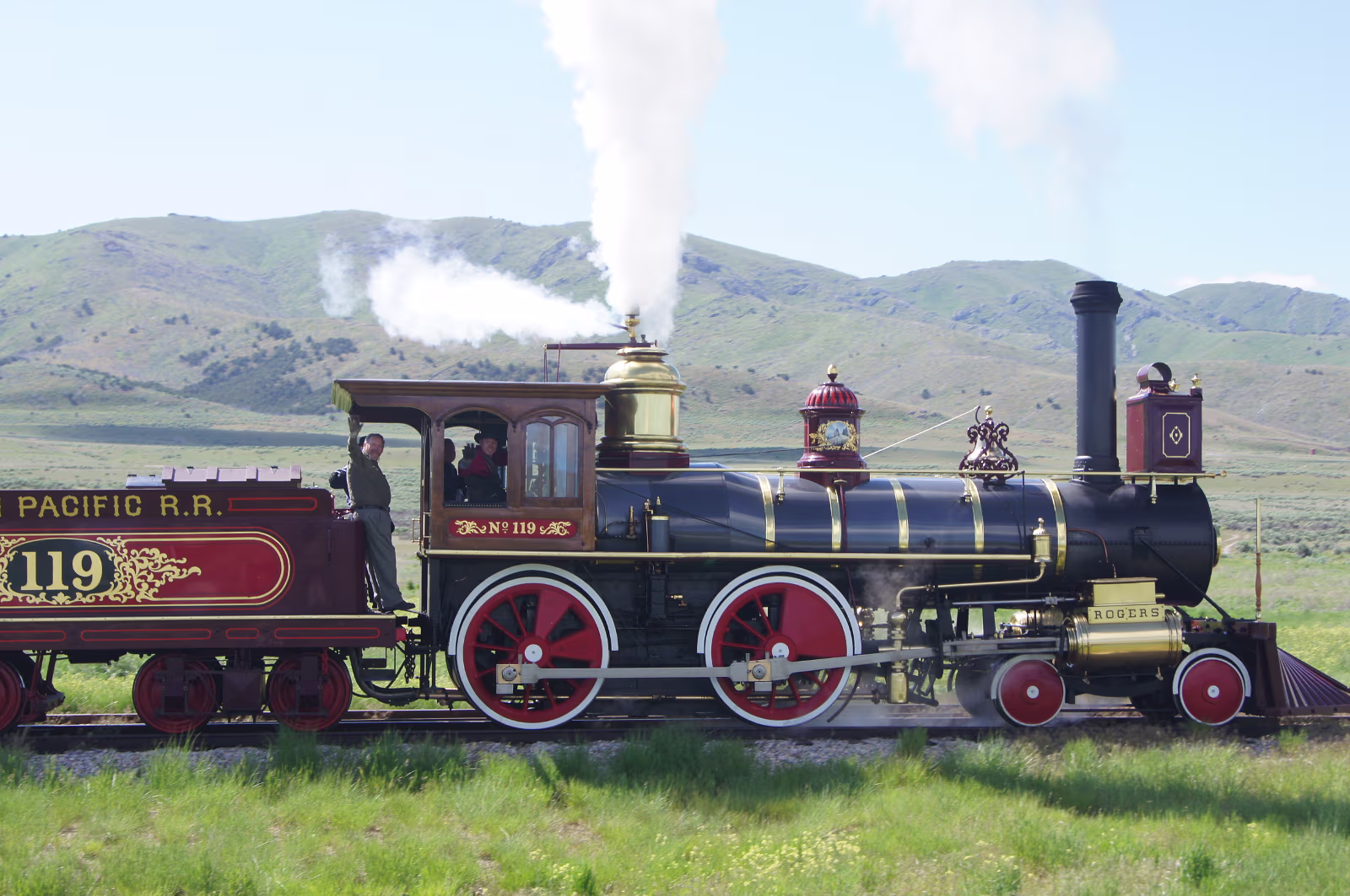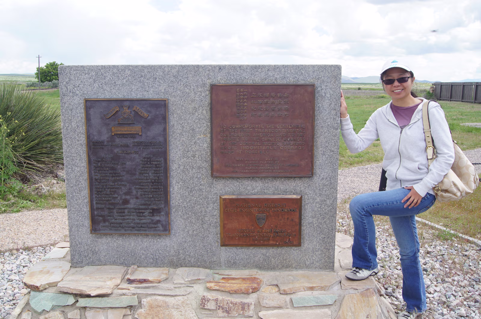 This is a spot I always wanted to visit. The site where East met West. Oh boy!The 119 is underway when we arrive! The train crew is very friendly.I would be too if that was my 'job'. This plaque is for the Chinese laborers who helped build the Transcontinental Railroad. Posing with the engine from the East. Thomas has nothing on this engine! The last railroad tie laid for the Transcontintal Railroad. Look at the detail on this engine.Not done today for sure. Original steampunk. Bell and whistle.See the frontiersman with is rifle? The hopper, coal and water were kept here.They had to stop for water every 10-15 miles! The Irish also contributed men to the rails.Hell on Wheels wouldn't have been possible without them! Watch the historic engine under way!Blow the whistle again! Labels Great Basin NPSalt Lake City Area