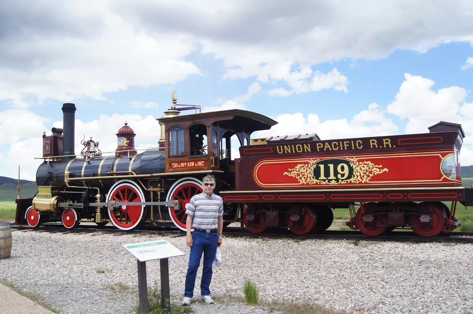 This is a spot I always wanted to visit. The site where East met West.Oh boy!The 119 is underway when we arrive!The train crew is very friendly.I would be too if that was my 'job'.This plaque is for the Chinese laborers who helped build the Transcontinental Railroad. Posing with the engine from the East.Thomas has nothing on this engine!The last railroad tie laid for the Transcontintal Railroad. Look at the detail on this engine.Not done today for sure.Original steampunk. Bell and whistle.See the frontiersman with is rifle?The hopper, coal and water were kept here.They had to stop for water every 10-15 miles!The Irish also contributed men to the rails.Hell on Wheels wouldn't have been possible without them! Watch the historic engine under way!Blow the whistle again! Great Basin NPSalt Lake City Area