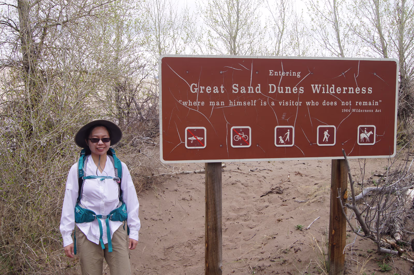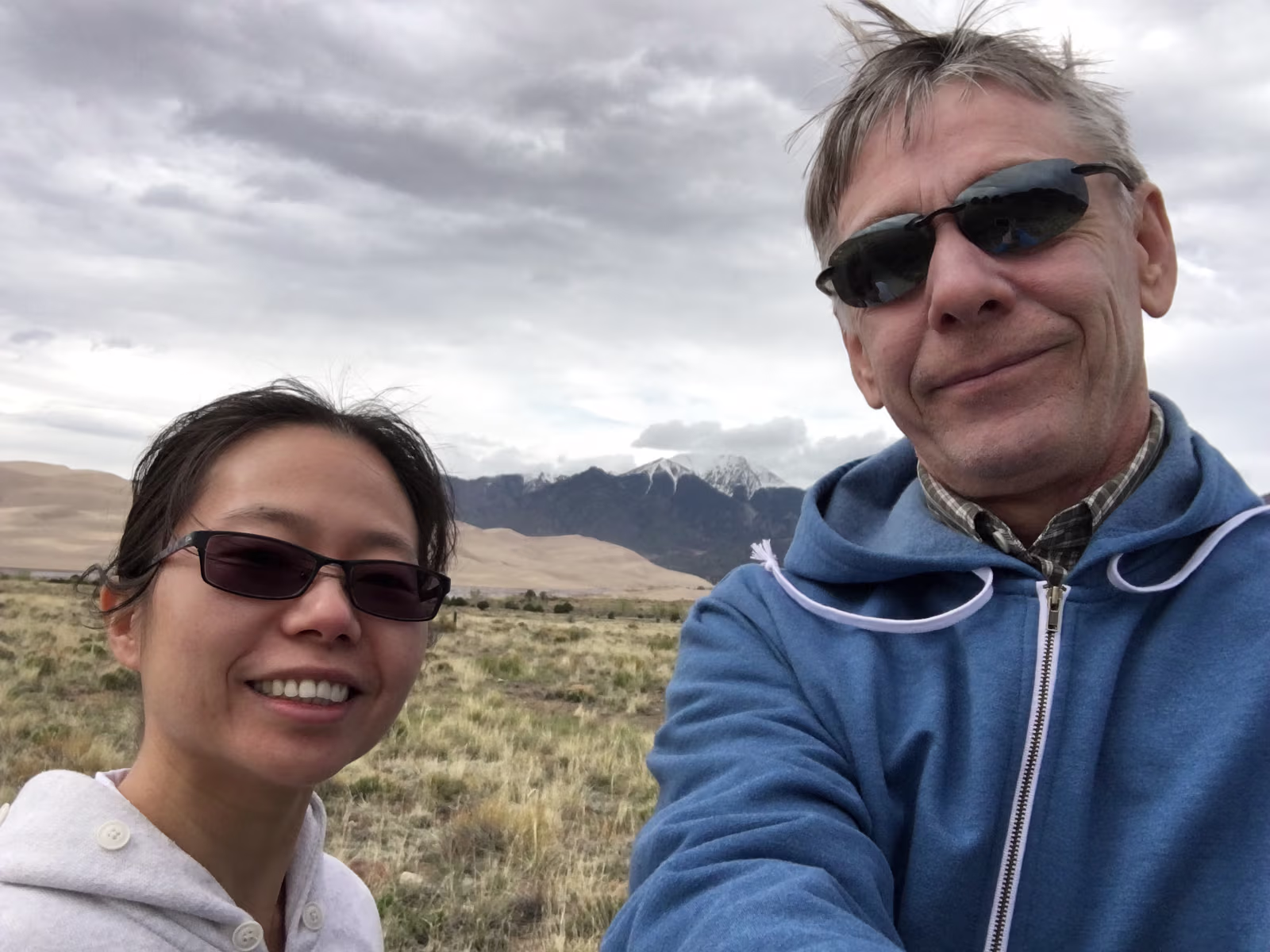 Nice weather for our visit to the area. Way outside the park, the dunes are already easily visible.Way out of place too, just a big pile of sand among all the mountains. Ready to start our exploration of the park. The scrub, the snow capped mountains, the low clouds, and the dunes make for a strange experience. Taking it all in from the observation deck. Gary and his trusty vaporizer brave the stiff wind and the chill. I know, but everyone needs one selfie. Hanhan the brave is going into the wilderness to face off with the sand dune.Will she remain? Should I wade the freezing water of the creek?Why is there a creek here anyway? Tom Sawyer has forded one branch of the creek.It was VERY cold water! The wind was terrible this day as there was a thunderstorm coming in.Hanhan was sandblasted, it was quite painful. The people in the background are smart, they are heading to the visitors center and safety. The storm and the dunes. eerie feeling being isolated like this. Run Hanhan run! Labels Rocky Mountain NPBalck Canyon of the Gunnison