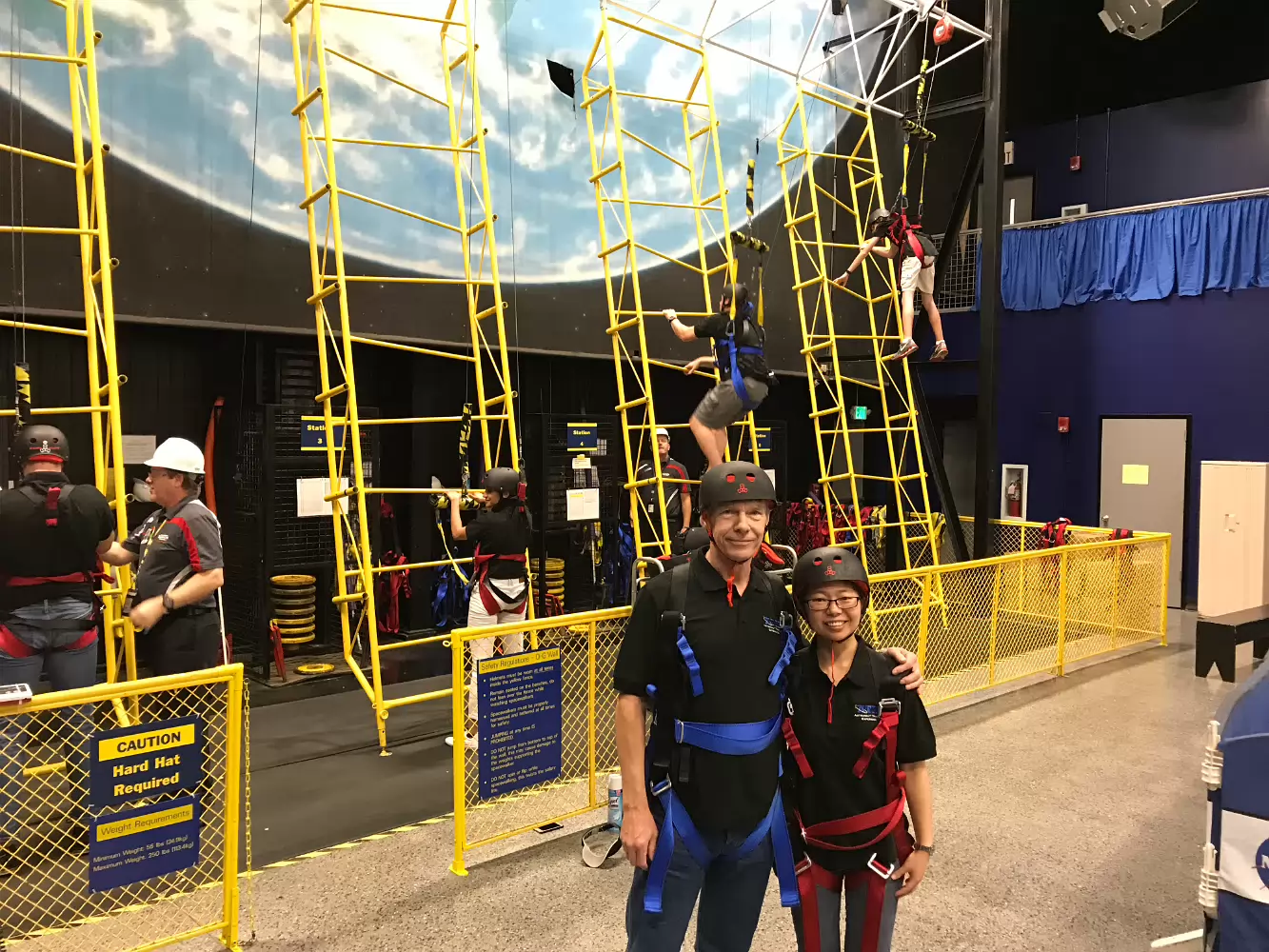 Me & Hanhan ready to hit the micro-gravity wall. We'll experience the feeling of zero gravity on the apparatus behind us.