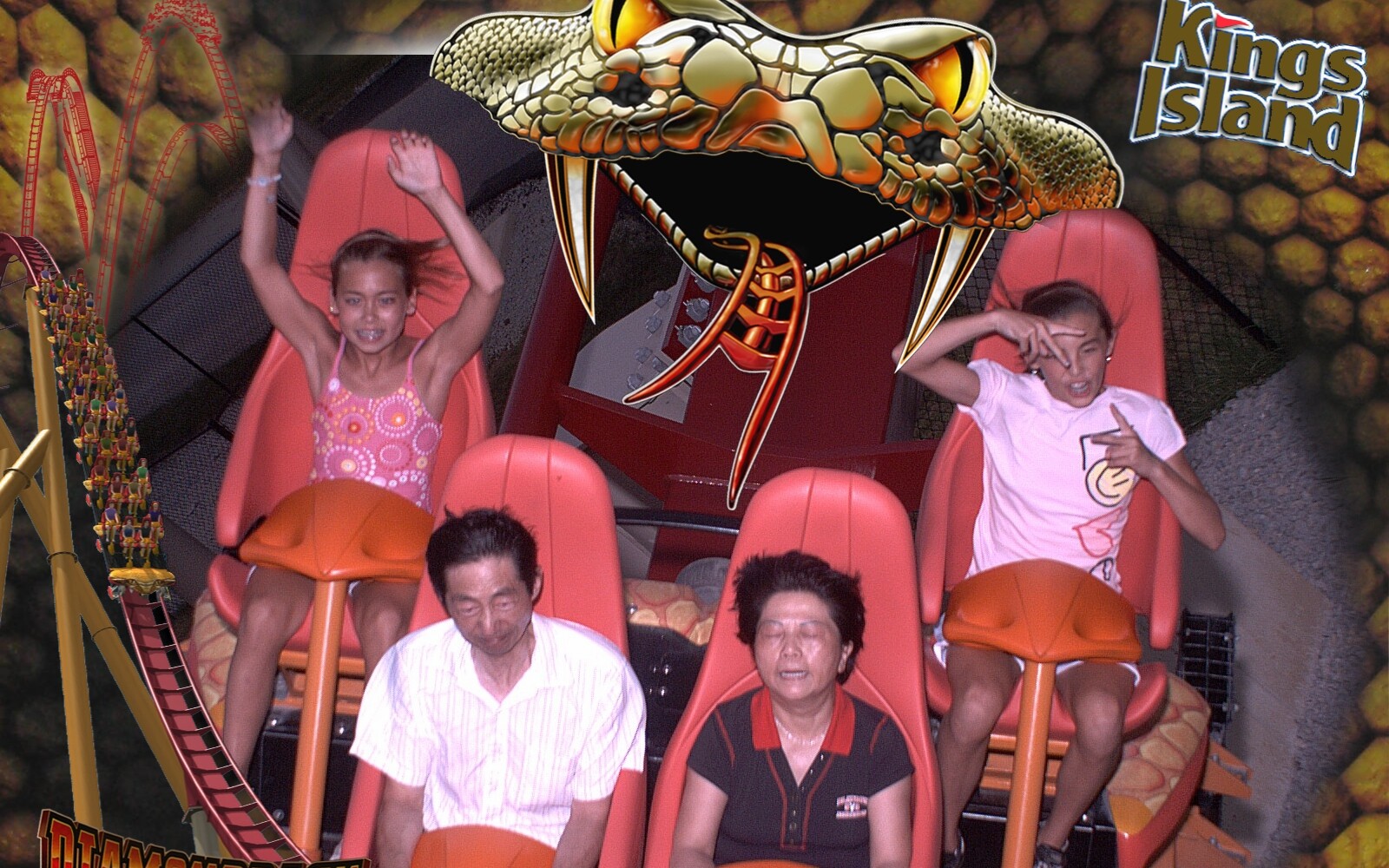 Parents loved the Diamondback as you can tellParents on the Racer, a side-by-side roller coaster. First ride everThe Racer, twin tracksA modern steelroller coaster, the Vortex Leaves a wake behind its so fastHere we goThe Diamondback, tallest, fastest coaster on earthThe blue and red coasters are racing The red one is winningAt the top of the Eiffel TowerHanhan and her parents had a lot of fun hereGary overcame his fear of heights to be here Ready to ride the InvertigoThe floor has dropped away and the ride is onHanhan's mouth is wide open as she screamsTwisted and rolled upside down at 70 MPH Nik Wallenda going up to walk the highwire.It's really high up thereNik is 262 feet above the hard asphalt Starting his walk. no harness, no nets. No brainsBalancing high above the crowd This shows how far in the air he isHe's almost reached his destination, 860 feet from the startShowing the height of the tower Fireworks TripMissouri 2008