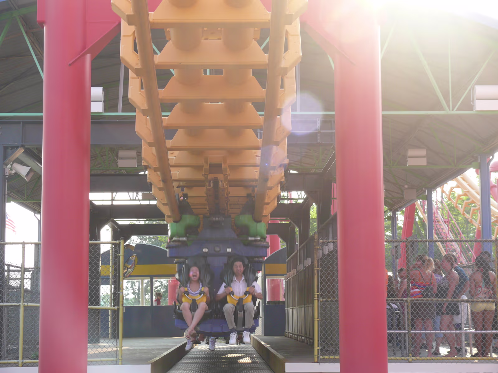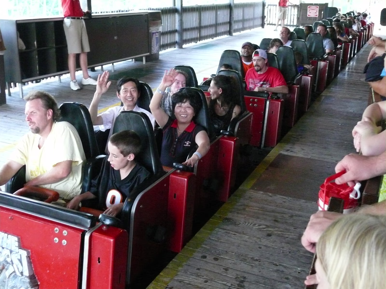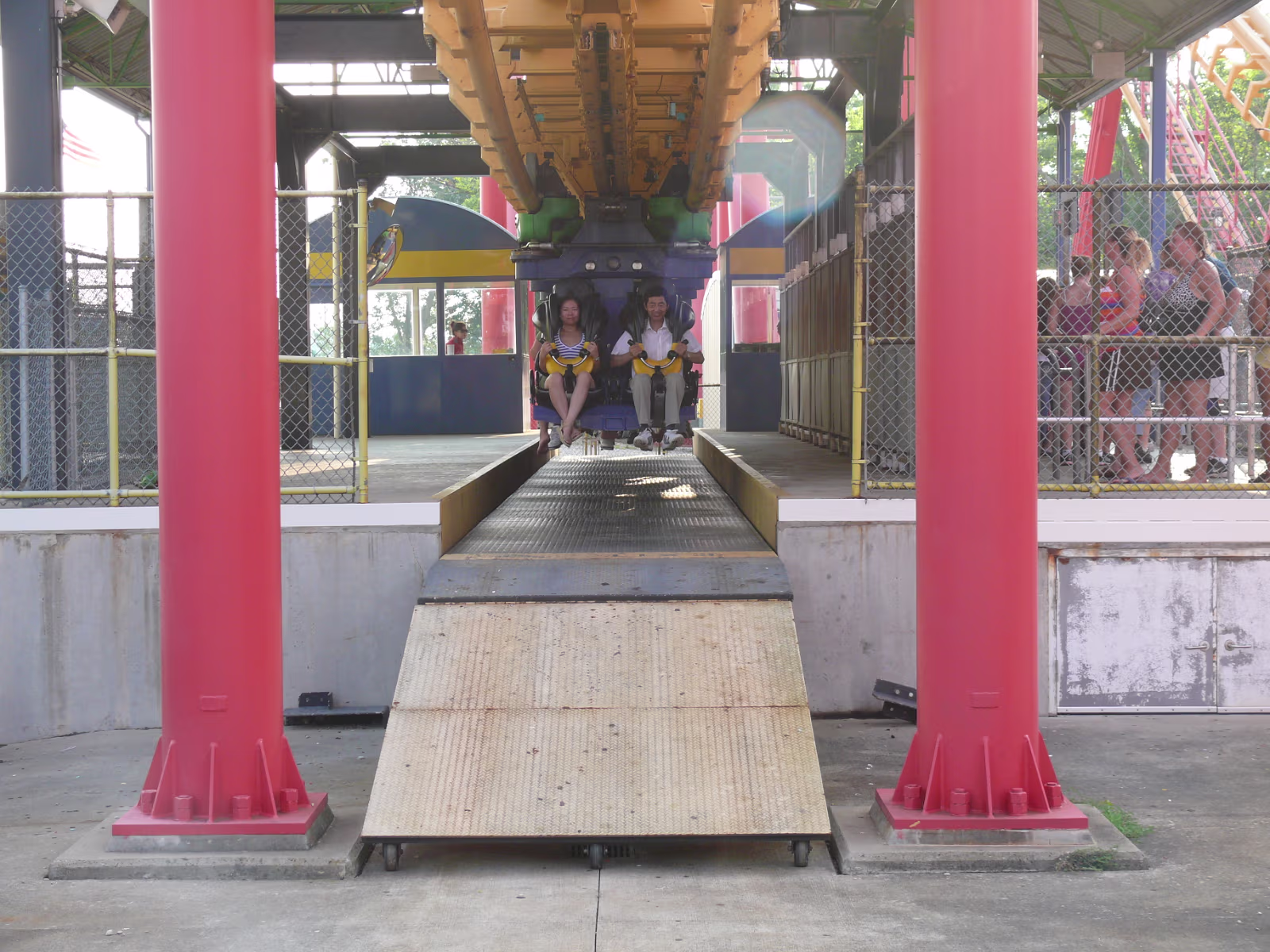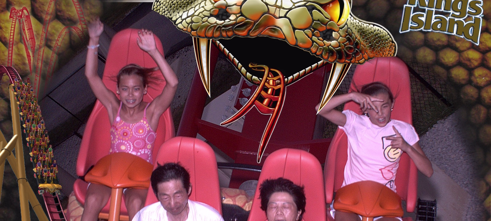 Parents loved the Diamondback as you can tell Parents on the Racer, a side-by-side roller coaster. First ride ever The Racer, twin tracks A modern steelroller coaster, the Vortex Leaves a wake behind its so fast Here we go The Diamondback, tallest, fastest coaster on earth The blue and red coasters are racing The red one is winning At the top of the Eiffel Tower Hanhan and her parents had a lot of fun here Gary overcame his fear of heights to be here Ready to ride the Invertigo The floor has dropped away and the ride is on Hanhan's mouth is wide open as she screams Twisted and rolled upside down at 70 MPH Nik Wallenda going up to walk the highwire. It's really high up there Nik is 262 feet above the hard asphalt Starting his walk. no harness, no nets. No brains Labels Fireworks TripMissouri 2008