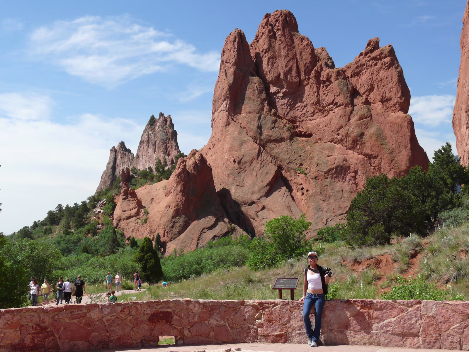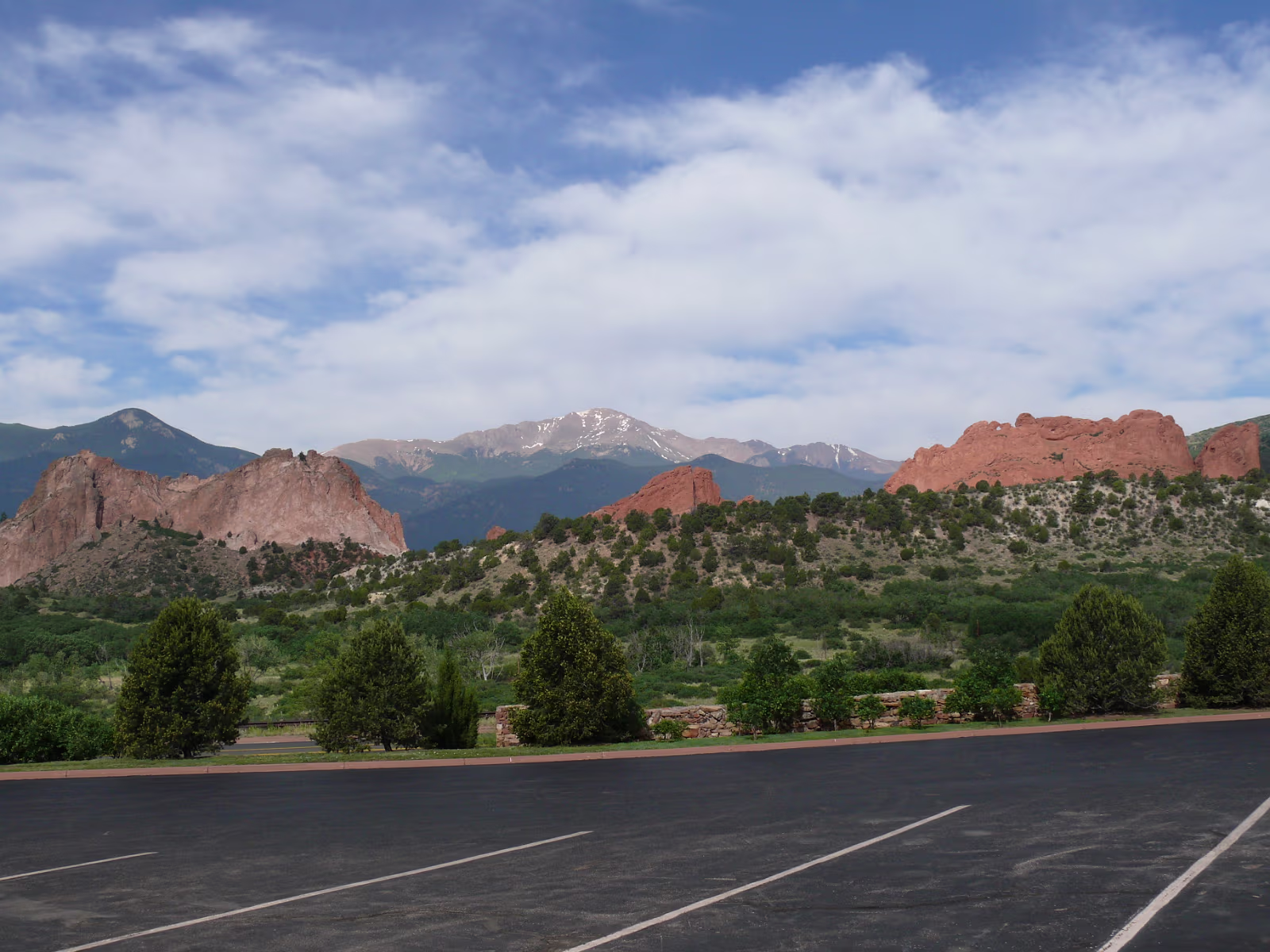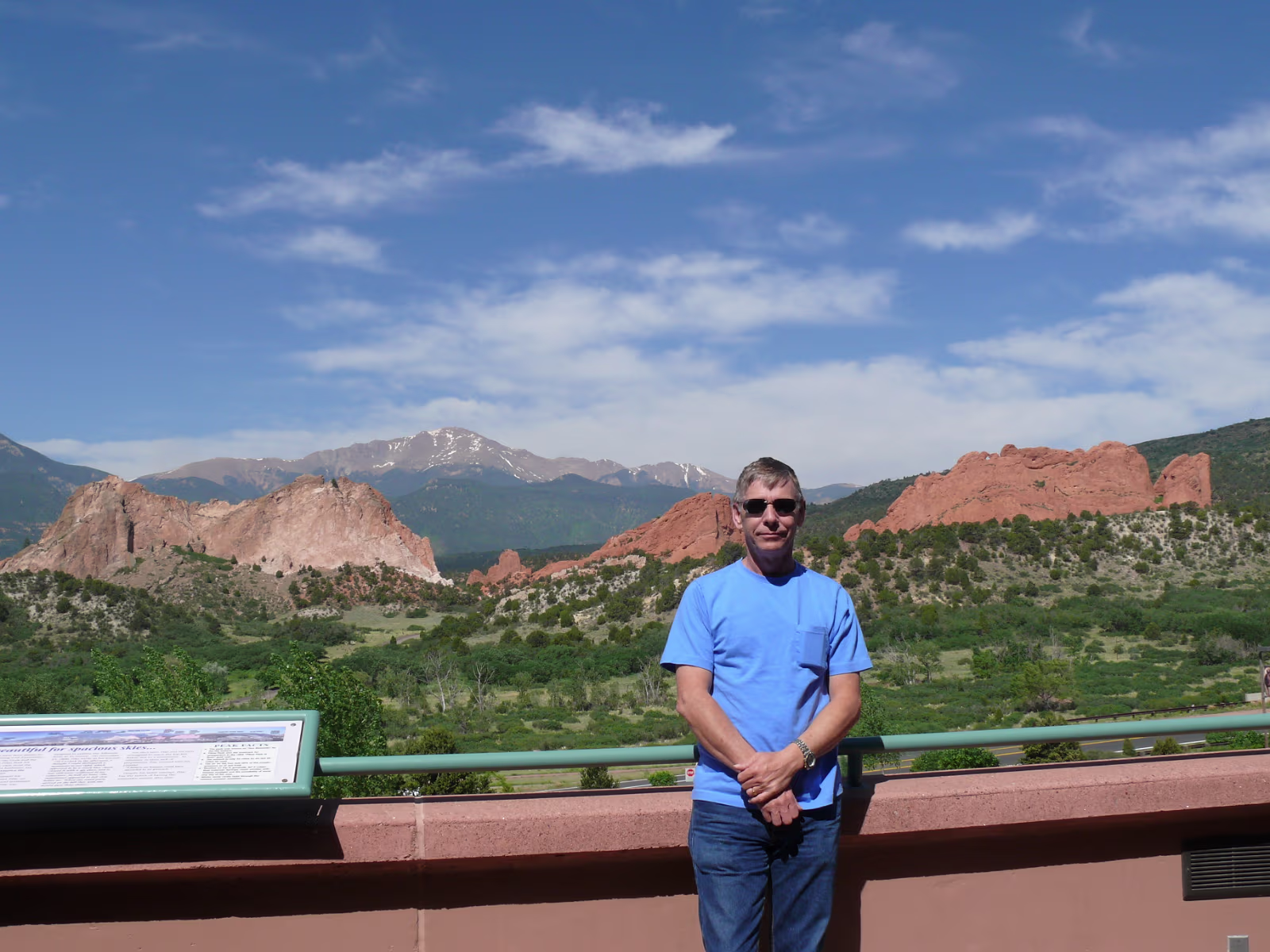 More snowy mountains on the way to Colorado. We like their motto! Red rocks in Utah. Unique formations in Utah. Typical western scene. Broken fence, sagebrush, hills in the distance. Colorado at last! Garden of the Gods, is impressive even from the road. Dinosaur skull in the visitor center. Can you find the teeth? Garden of the Gods, we are ready to begin a day of sightseeing. Garden of the Gods and Pike's Peak. We'll visit both today. The unique rocks here gave the place its name. The nature center was a nice experience. A fine day is in store. Red and gray are different types of rock, but so close together. Look at how vertical these are, like towers. Rock forest. Look at the thin layers behind Hanhan. Each just came up from the Earth. Kissing Camels. It's getting hot out here and it's only 11:30. This used to be a chuckwagon dinner area. Labels Oregon, the Beaver State