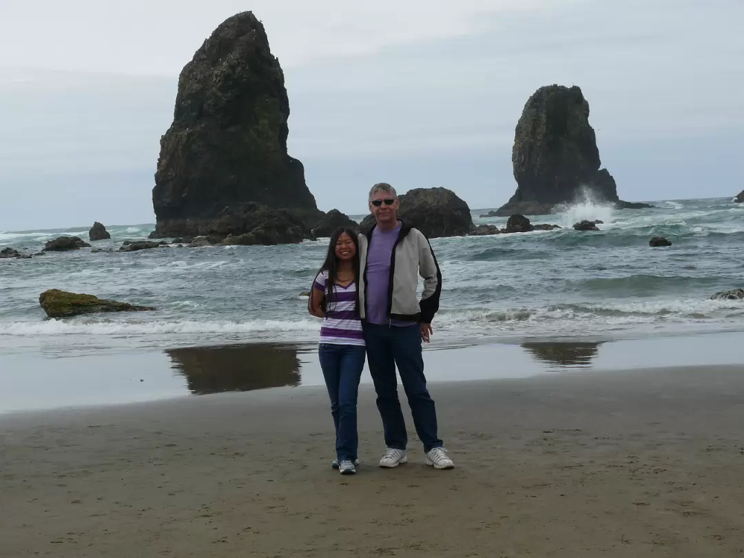 One of the huge Sitka Spruce trees along the Oregon coast.Examining the many rules at Cannon Beach.Hanhan is finally at the Pacific Ocean! Haystack Rock.The whole coast is rocky, but this is the most famous.Hanhan & John bearking the law stepping on the rocks.Tidal pools. Can't get near them as the Beach Police will come hollar at you. Watch for waves Hanhan!Enjoying the beach.Hanhan would not get in the water, just get her finger wet.A time honored tradition, writing your name in the sand. A last look at Haystack.The waves make a nice picture and a nice sound. The lighthouse to warn ships of the danger.In case of Tsunami, break glass!Seaside Oregon. End of the Lewis and Clark Trail. We have followed the entire trail now. Mt. Hood & Multnomah Falls